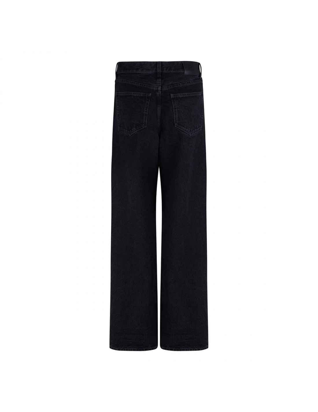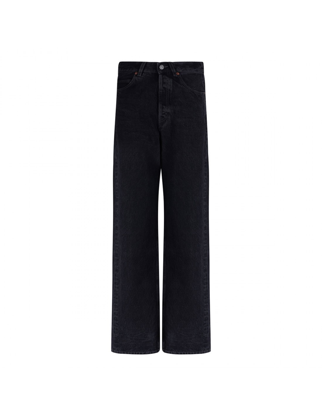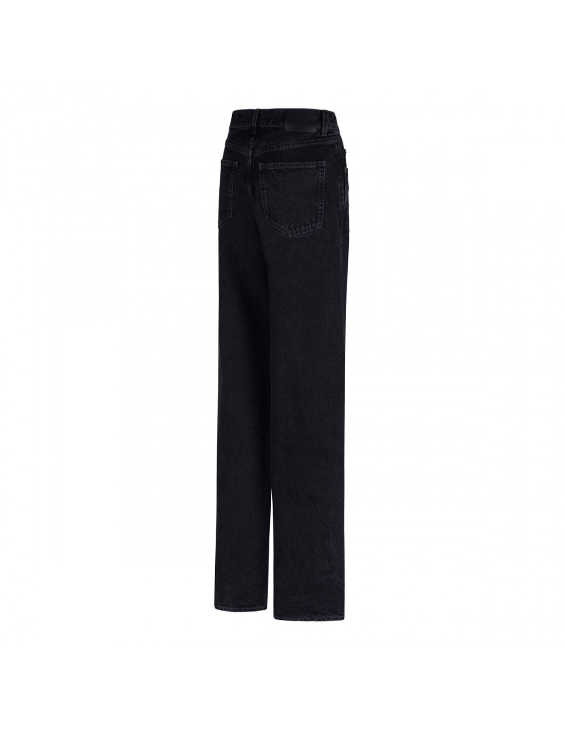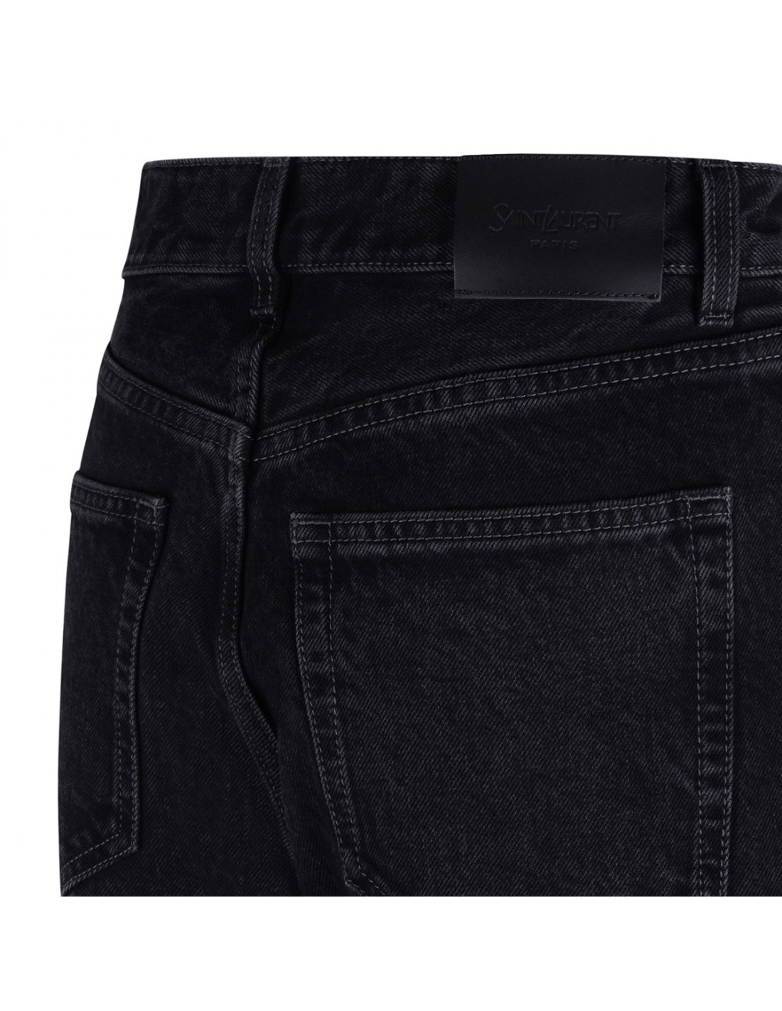 90's French black denim jeans from Saint Laurent featuring baggy silhouette, high-waist, classic five-pocket style, long wide-leg, V-cut waistband with belt loops, engraved logo tag, button closure, zip fly.