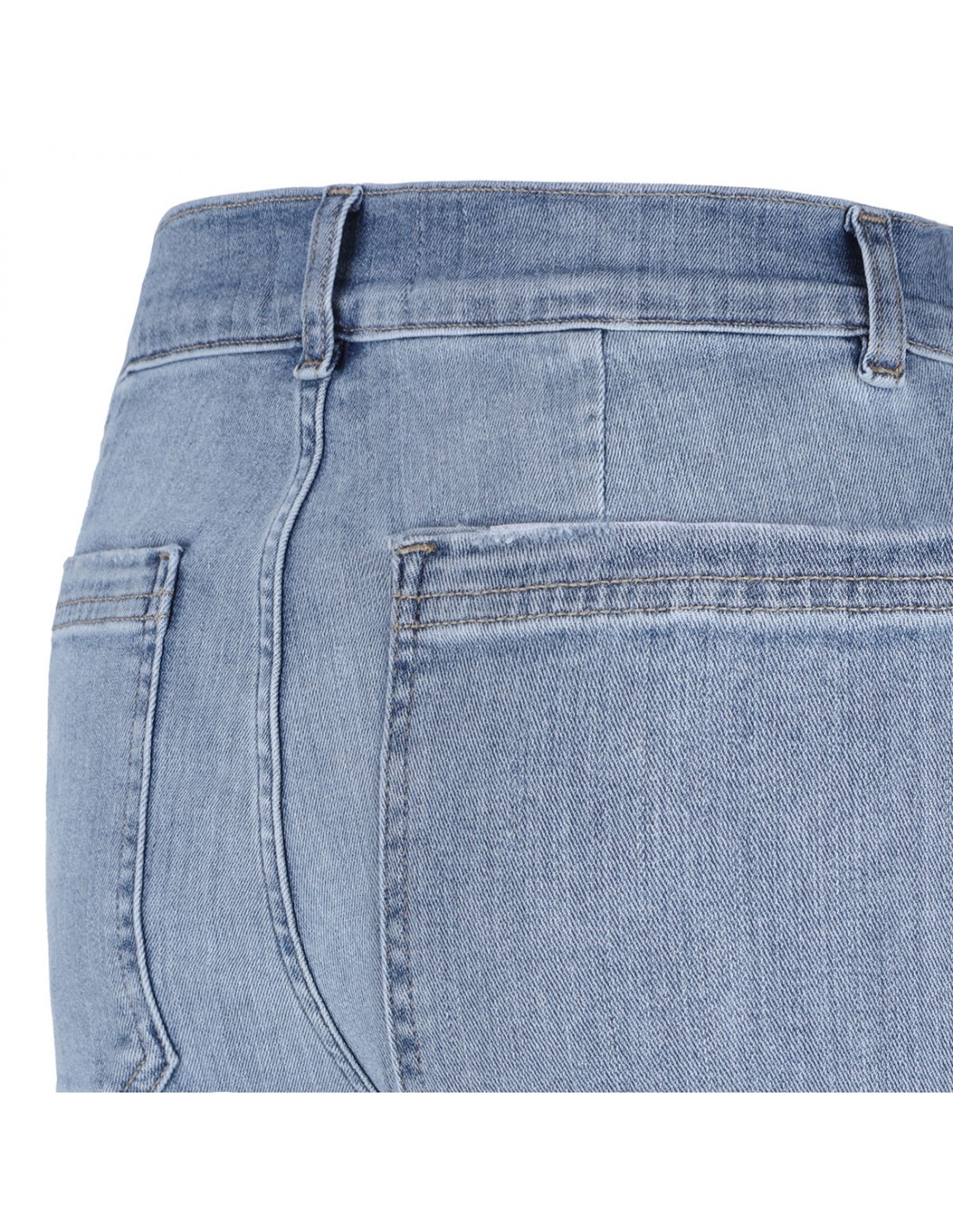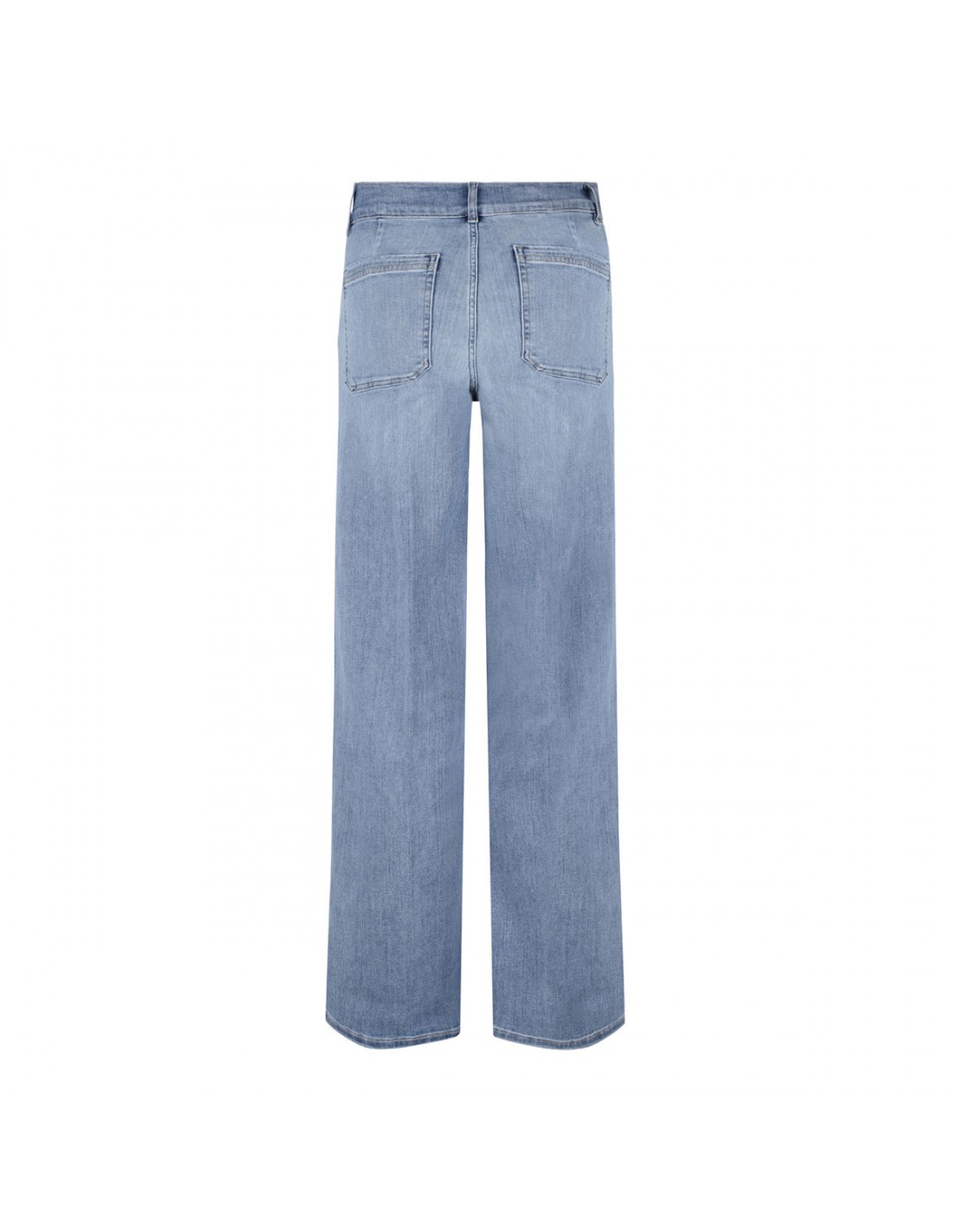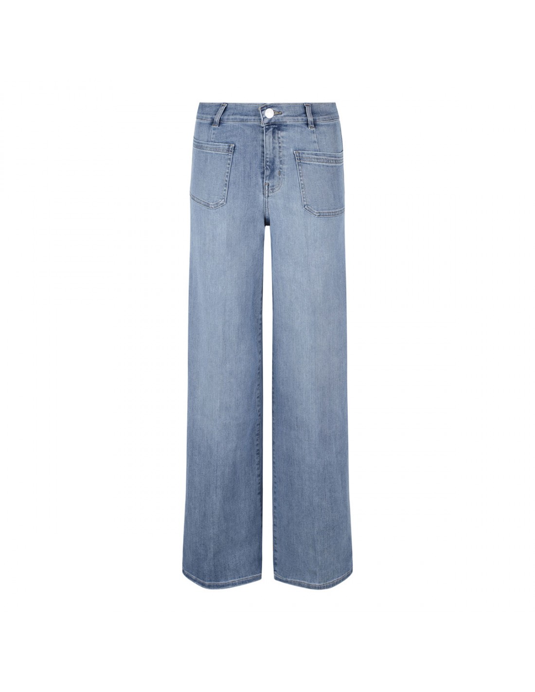 Light blue super-stretch cotton-modal blend Le Slim Palazzo jeans from Frame featuring front "Bardot" pockets, high rise waist, fitted hip, subtle wide-leg flare, button closure, zip fly, belt loops on the waistband, back patch pockets.