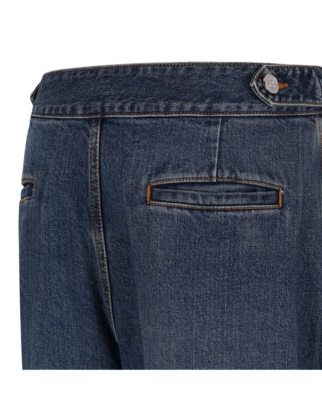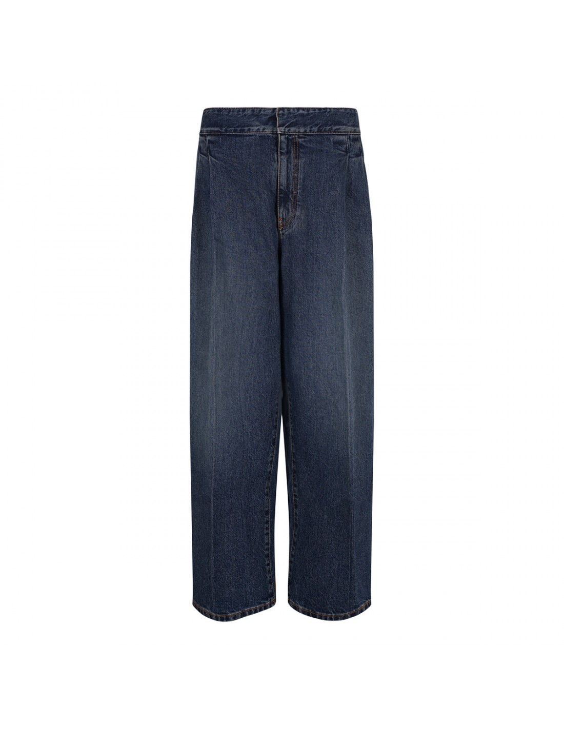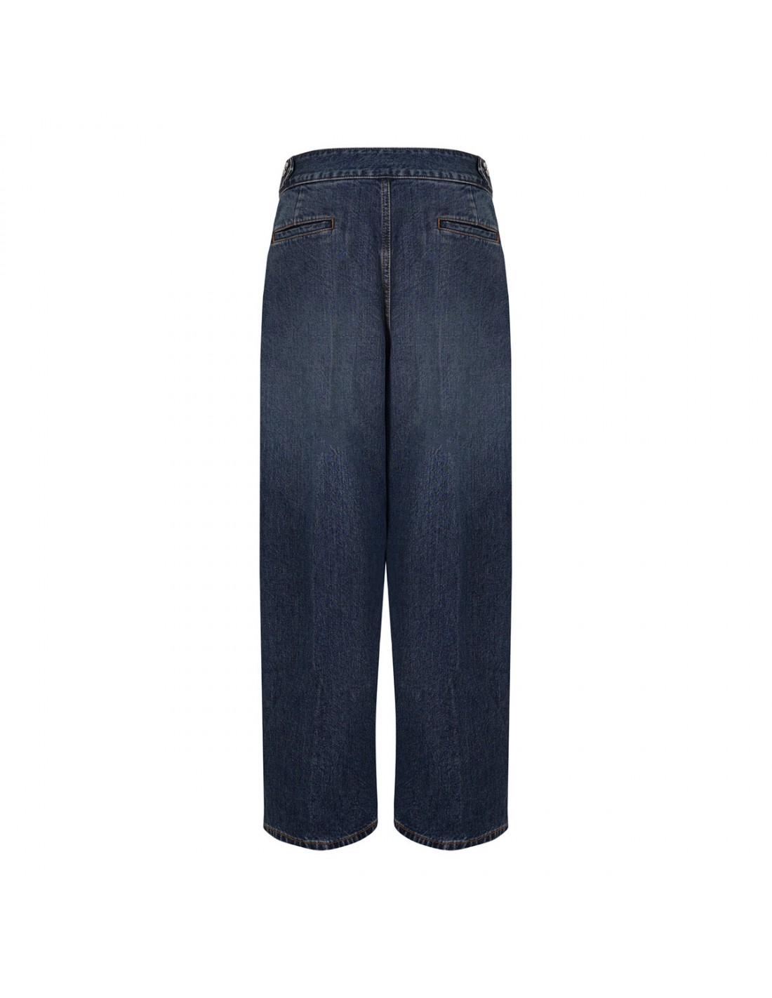 Blue delavé denim tailored pants from Alaia featuring pleated detail, low waist, full length, side pockets, zip fastening, tapered fit, back slit pocket.