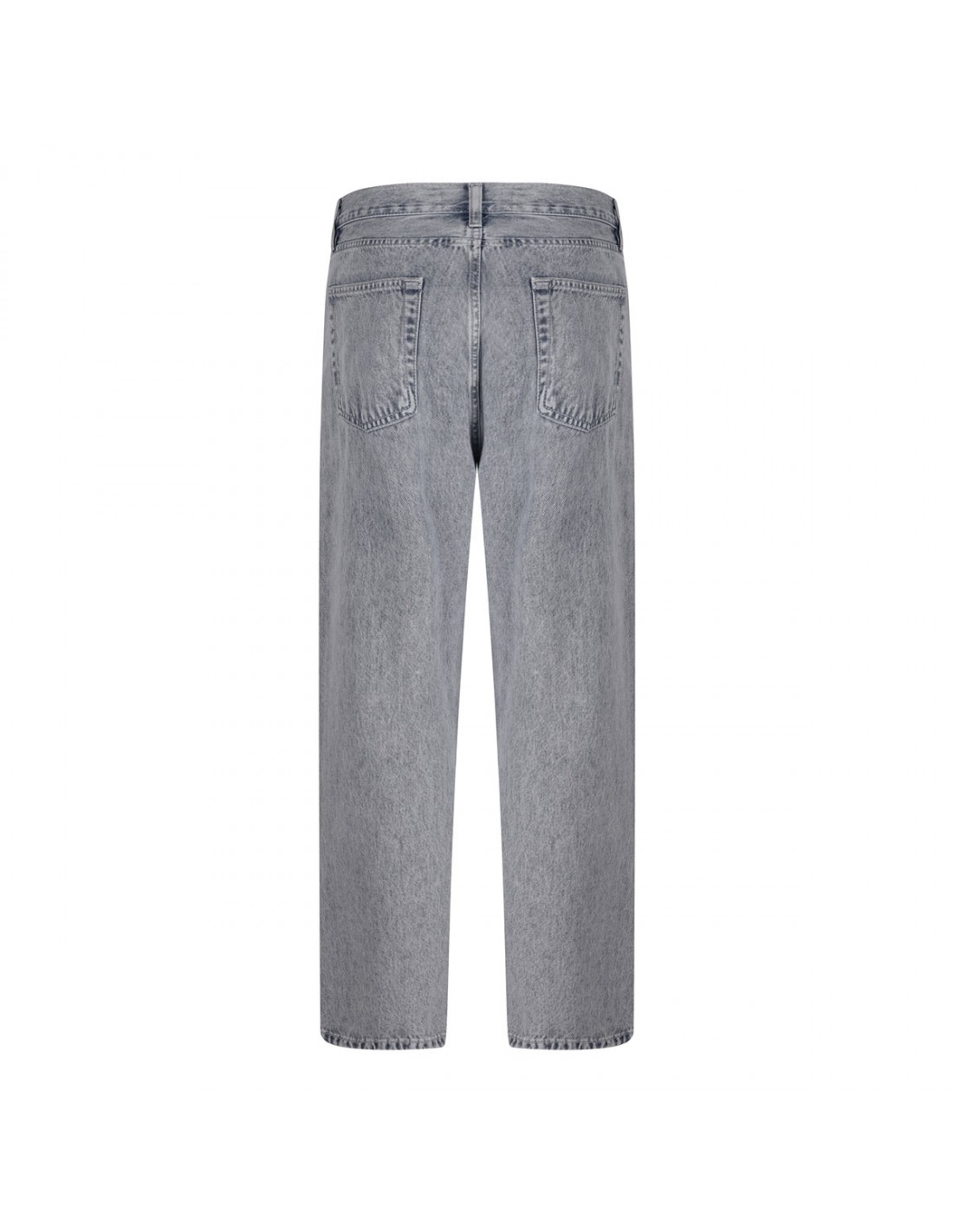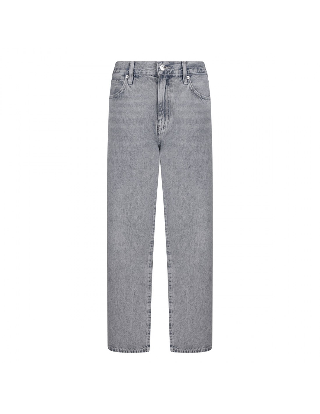 Light gray denim The Hang jeans from Frame featuring straight leg, relaxed silhouette, mid-rise waist, clean hem, slightly whiskering, classic five-pocket, belt loops on the waistband, button closure and zip fly.