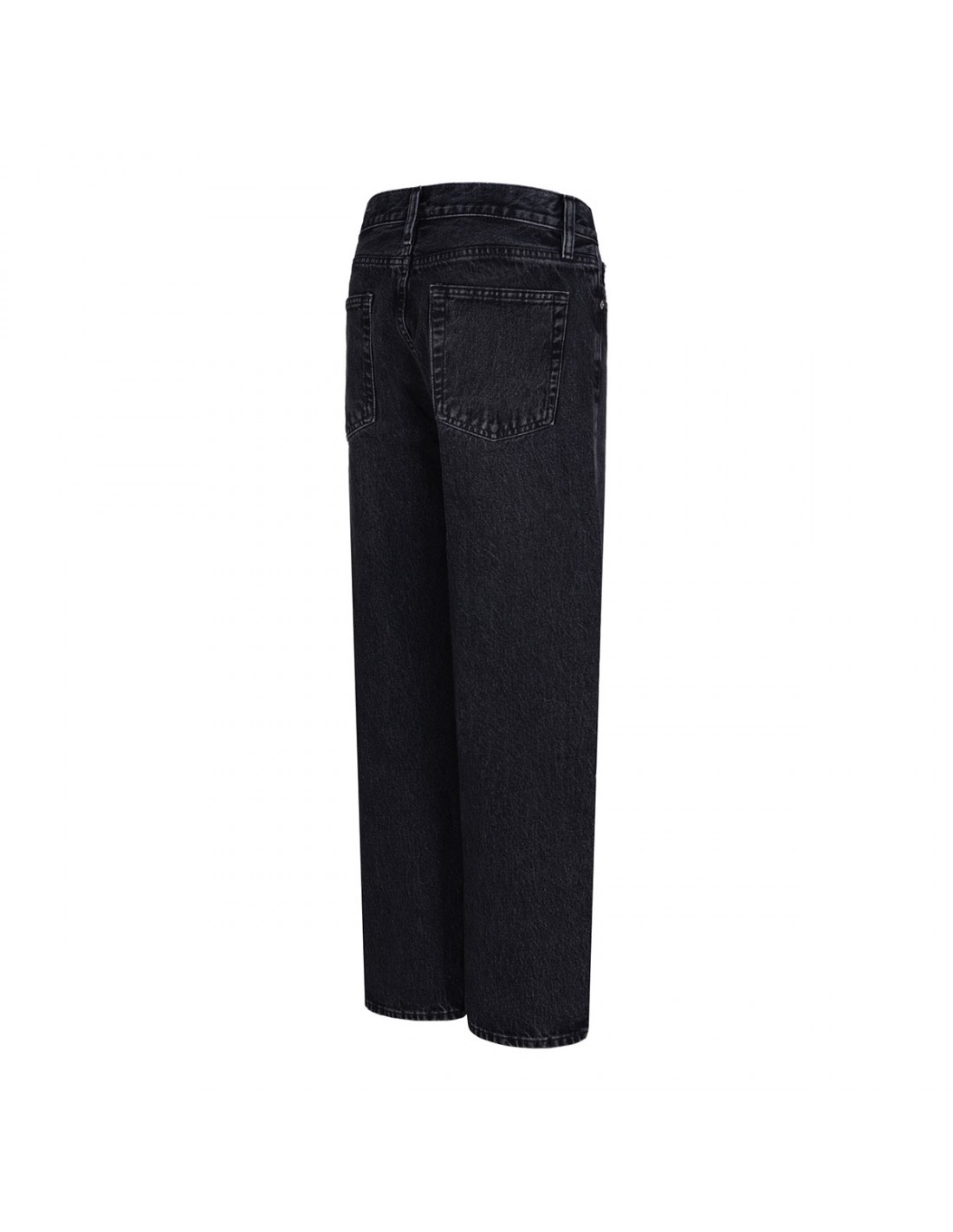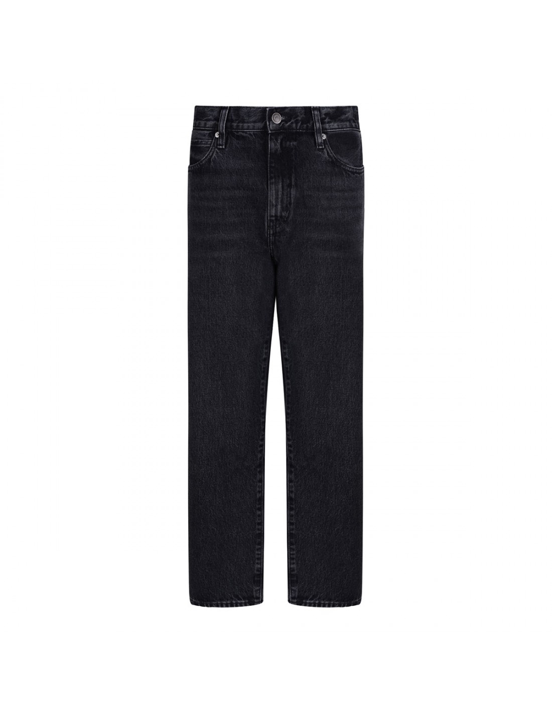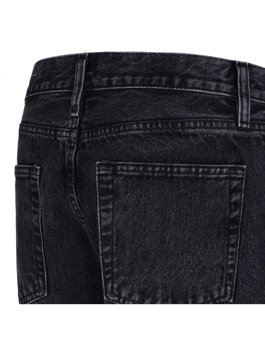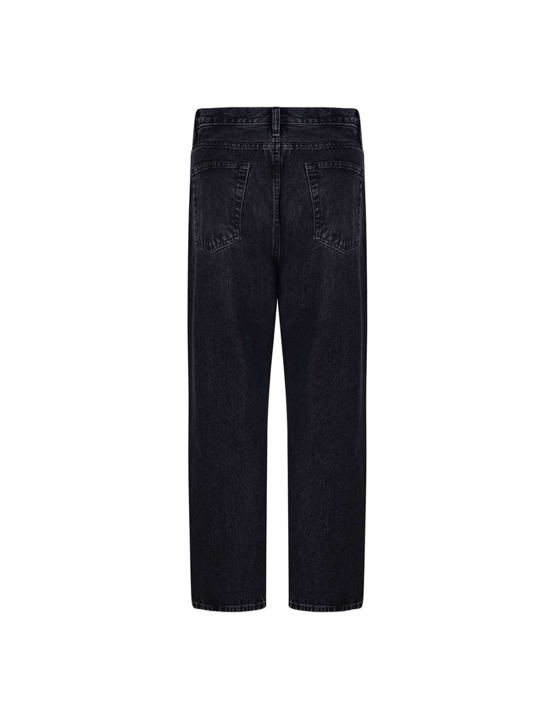Black denim The Hang jeans from Frame featuring straight leg, relaxed silhouette, mid-rise waist, clean hem, slightly whiskering, classic five-pocket, belt loops on the waistband, button closure and zip fly.