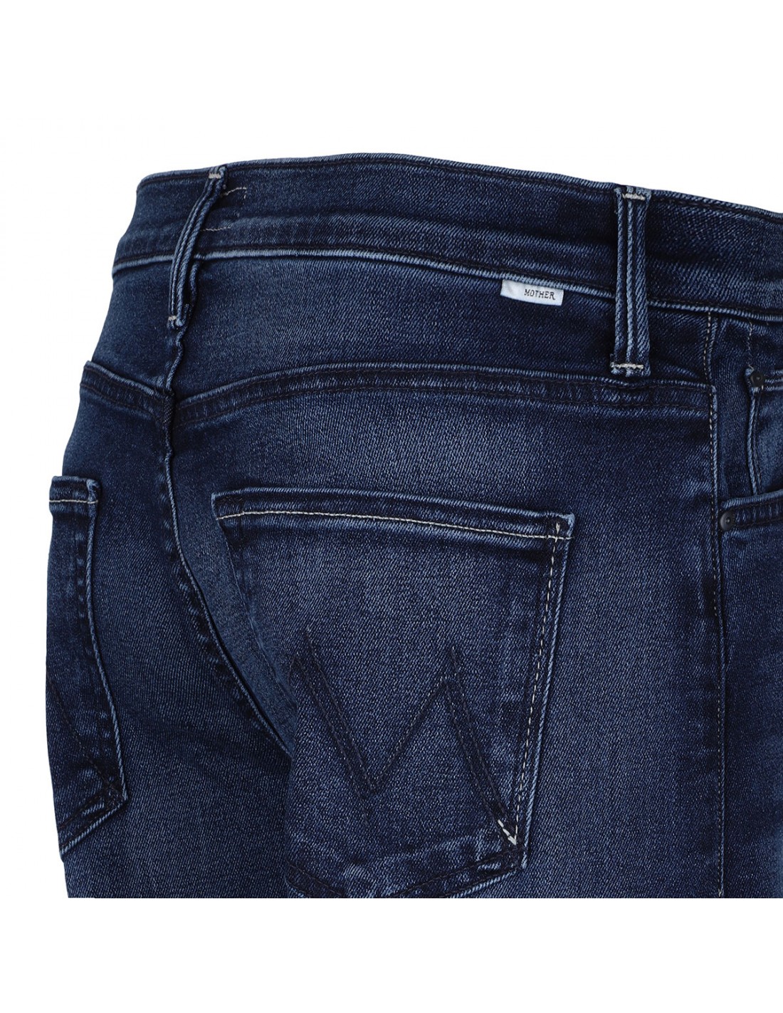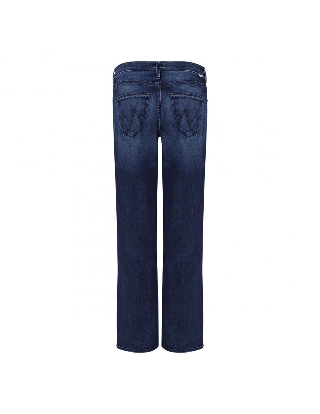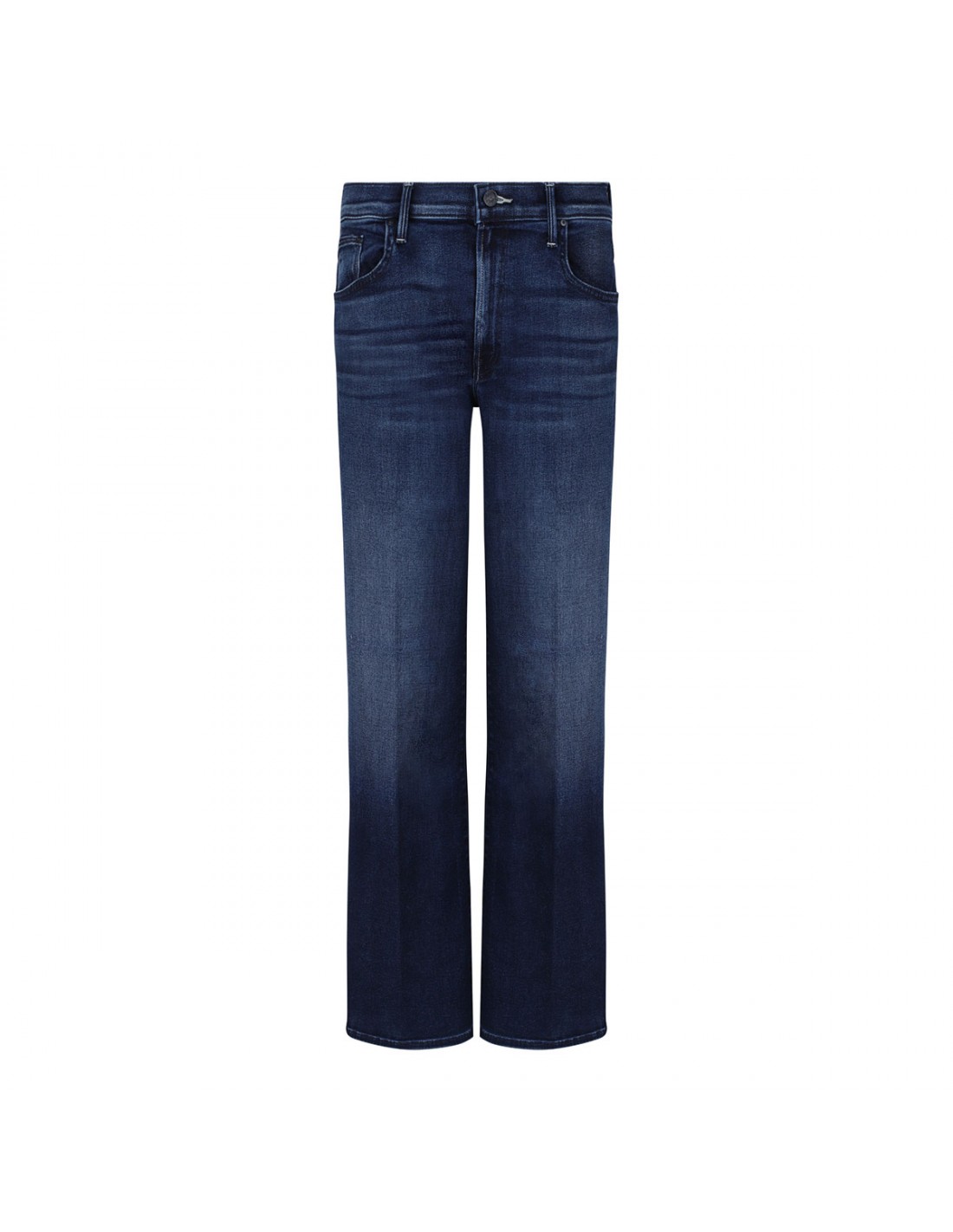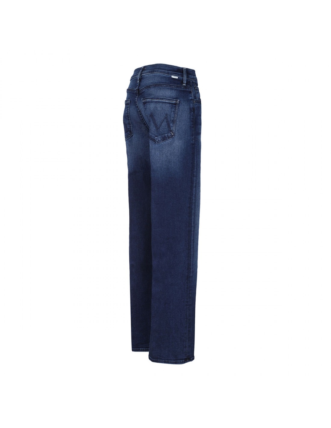 Mid-blue wash recycled stretch denim The Mid Rise Maven Sneak jeans from Mother featuring whiskering and fading at knees, mid rise, loose fit, wide leg, classic five-pocket style, belt loops on the waistband, M logo embroidery.