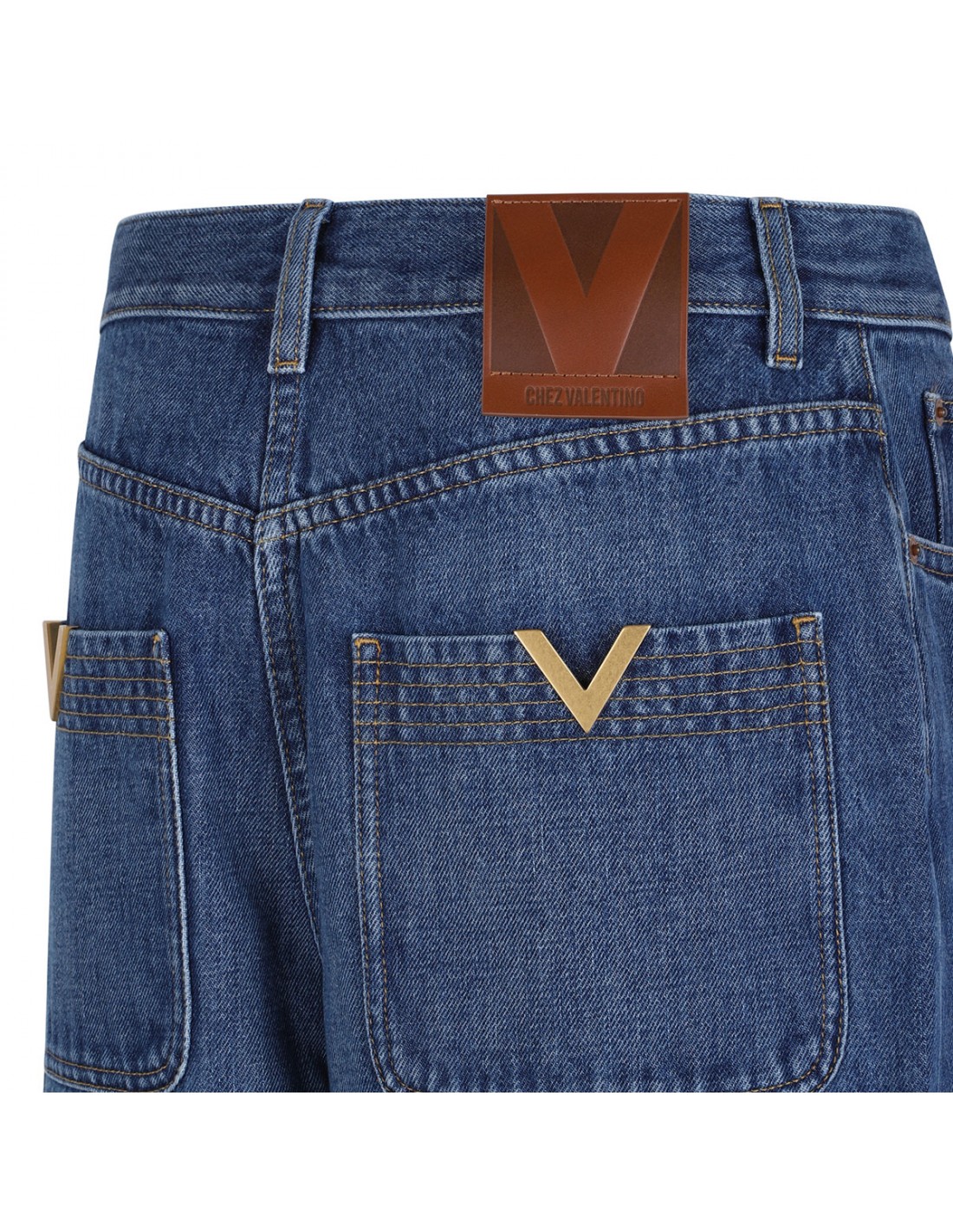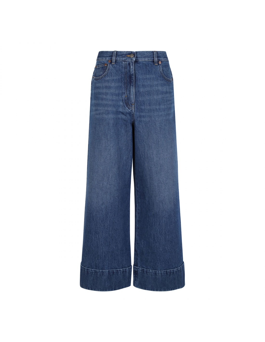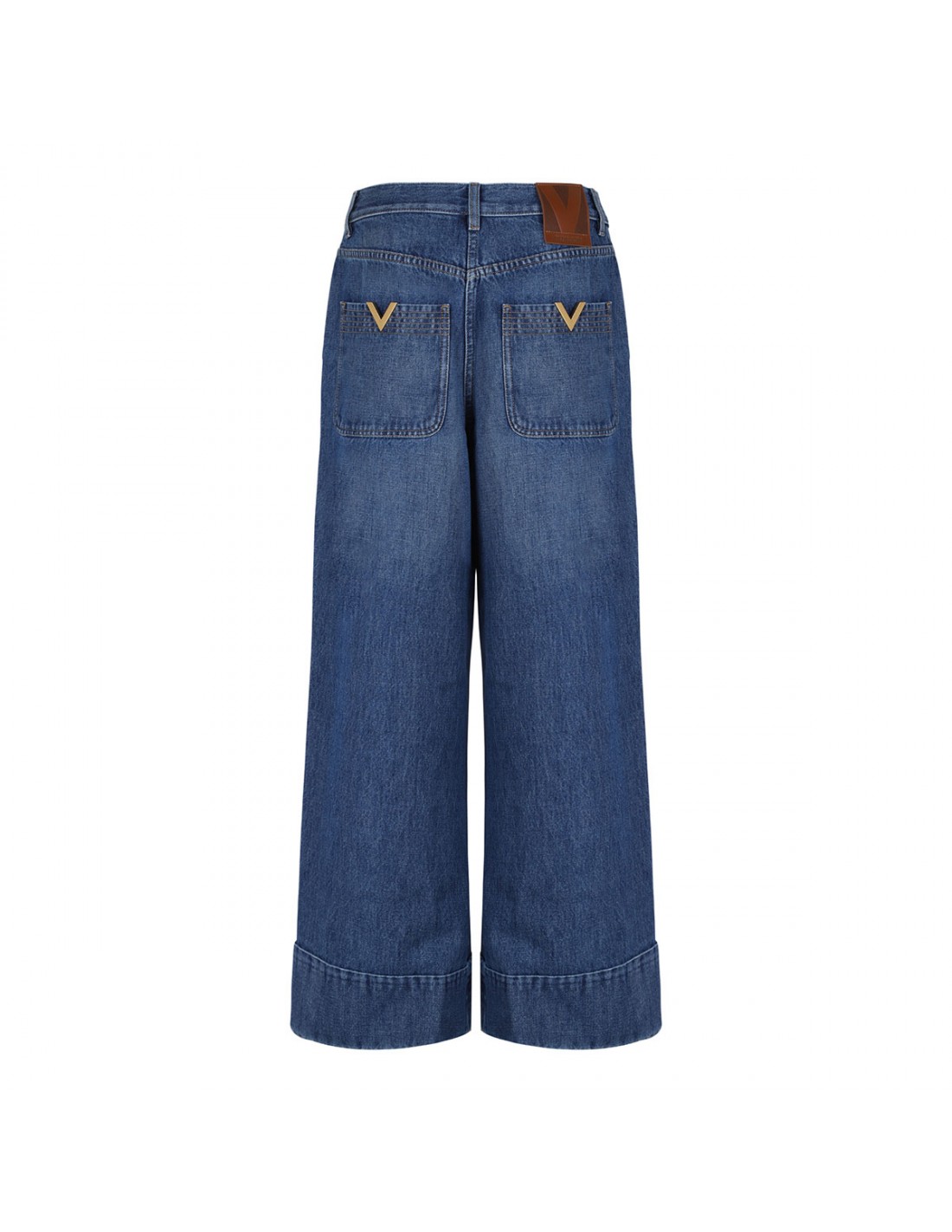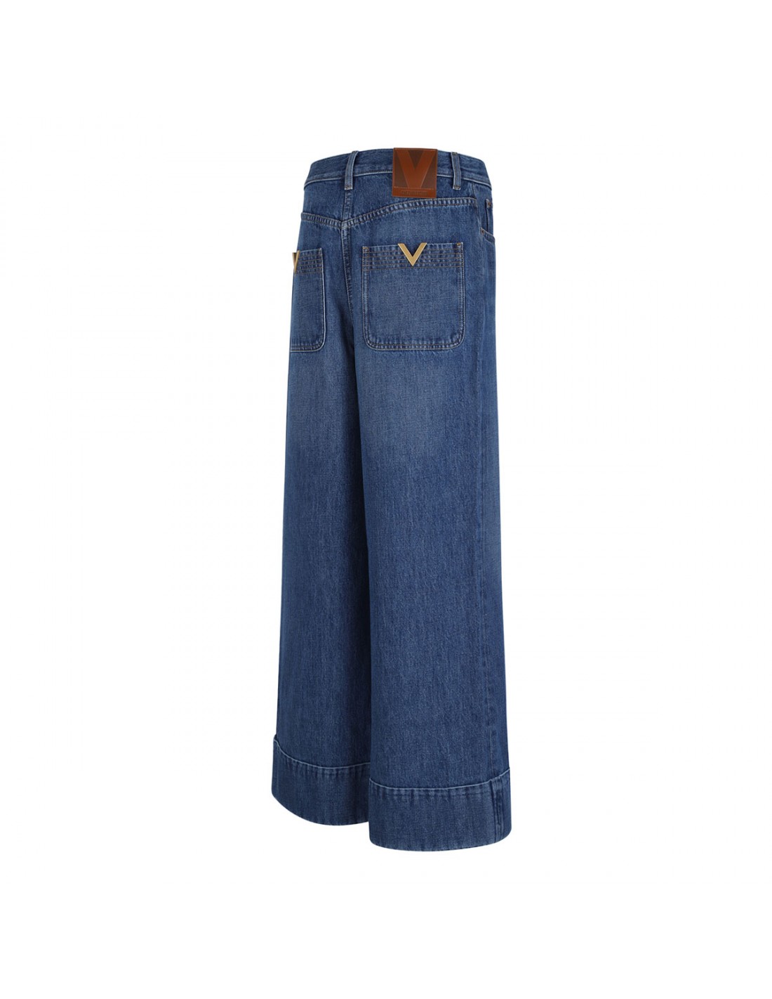 Medium blue denim jeans from Valentino featuring Gold V-logo detail on back pockets, wide leg, belt loops on the waistband, slight fading and whiskering, classic five-pocket style, button closure and zip fly, turn-ups at ankles, leather V logo label.