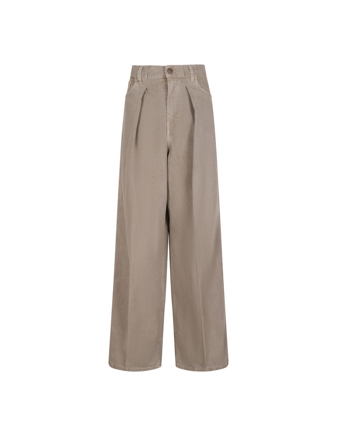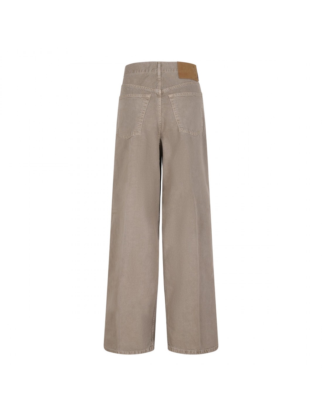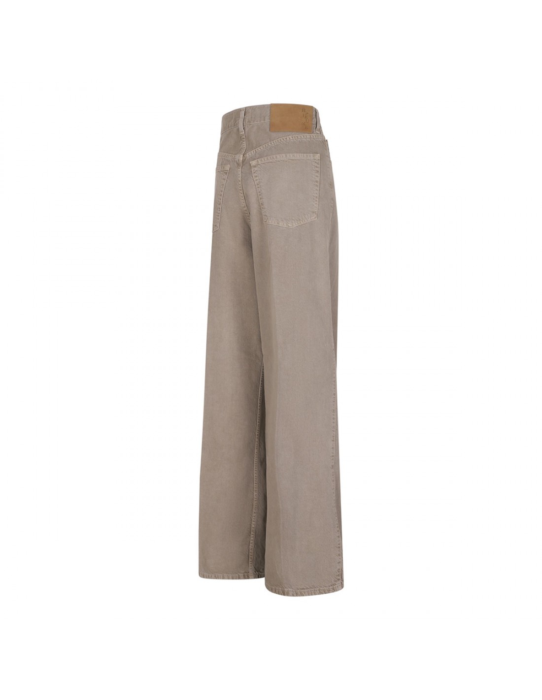 Doeskin hue cotton and linen blend Candy Twill 45 jeans from Haikure featuring pleats on front, wide leg, button closure and zip fly, classic five-pocket style, belt loops on the waistband, leather logo tag on back-waist.