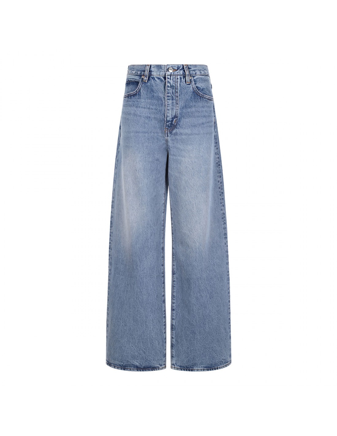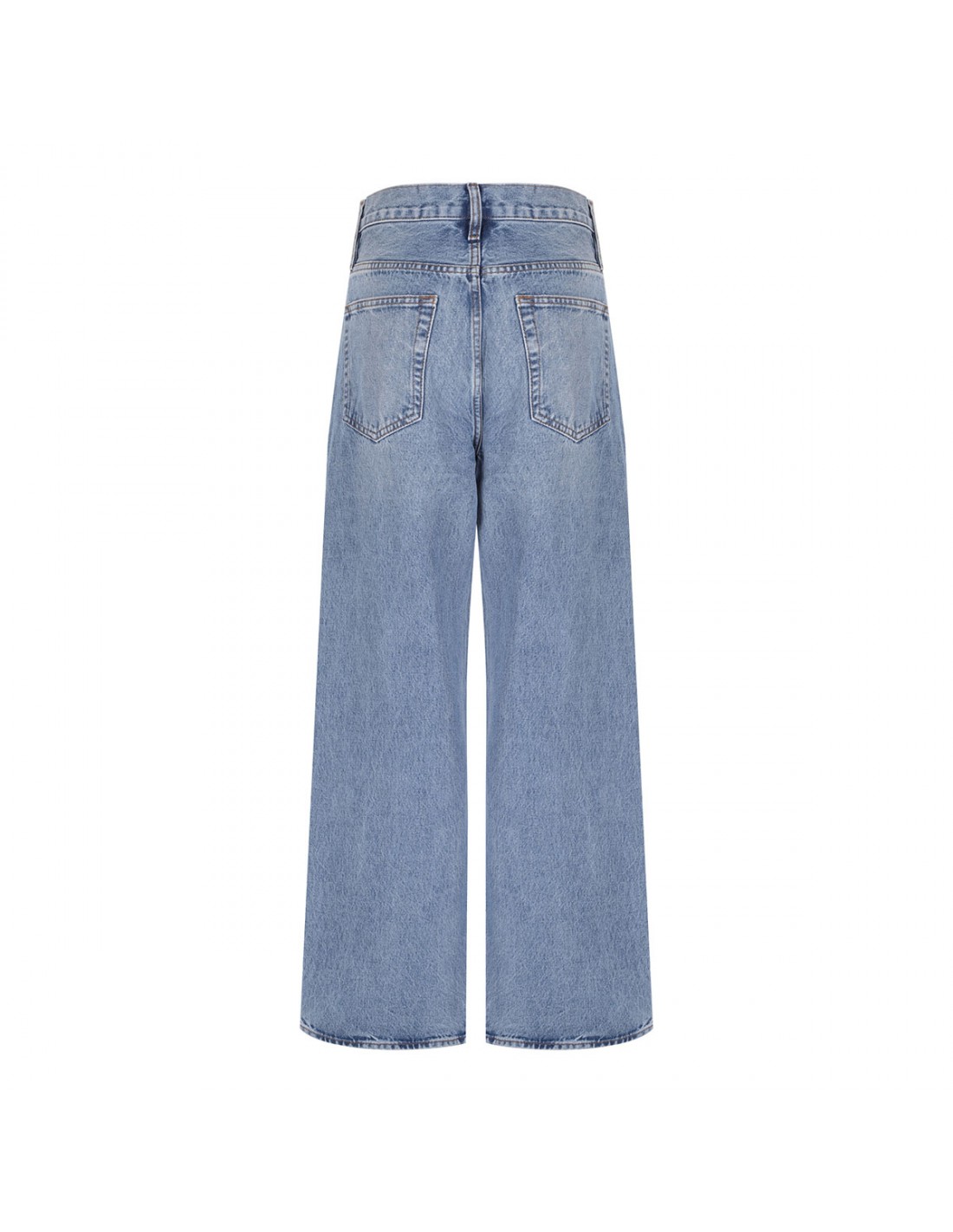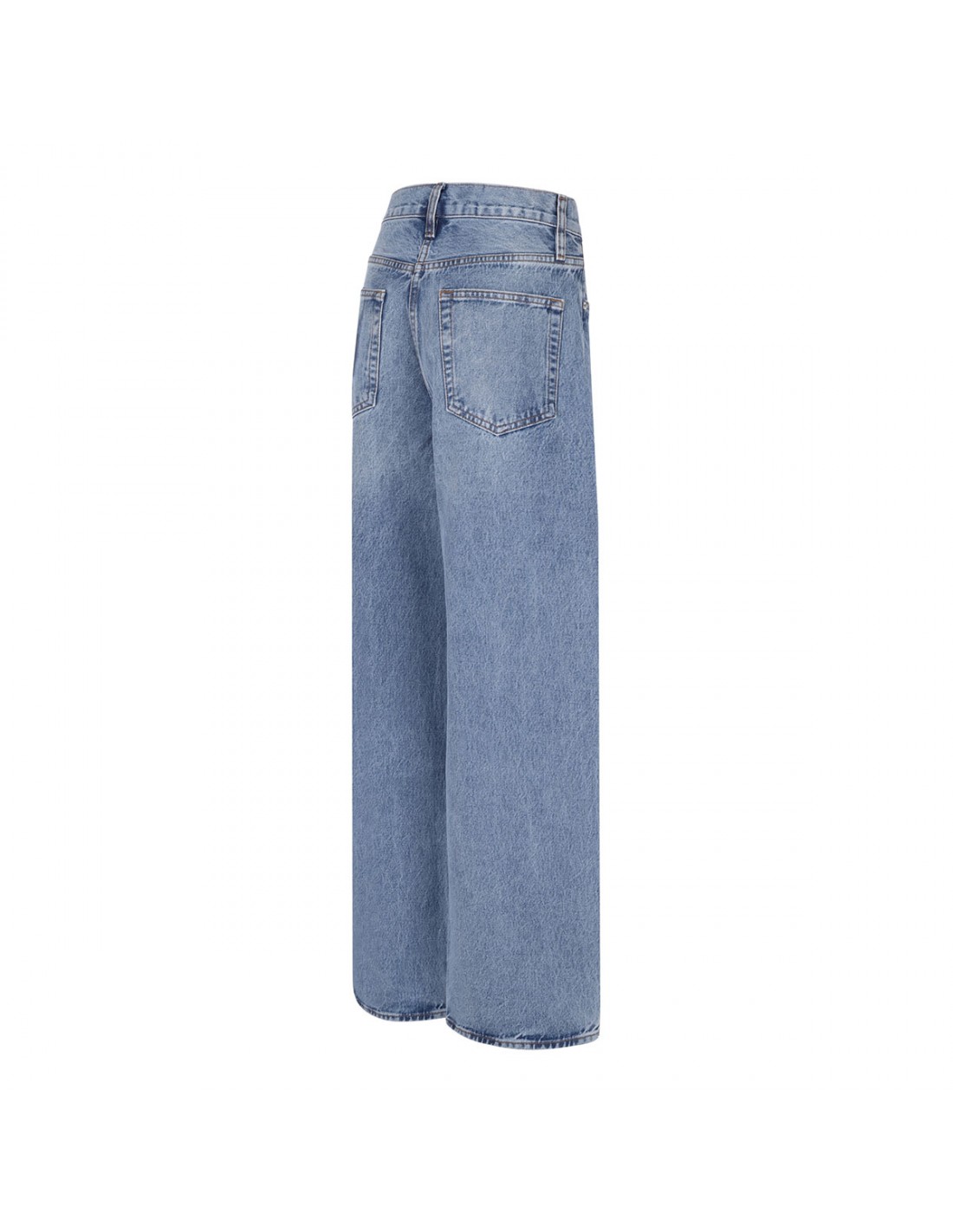 Blue denim The Bow jeans from Frame featuring barrel leg, high-rise waist, full-length, whiskering and fading, belt loops on the waistband, button closure, zip fly, classic five-pocket design.