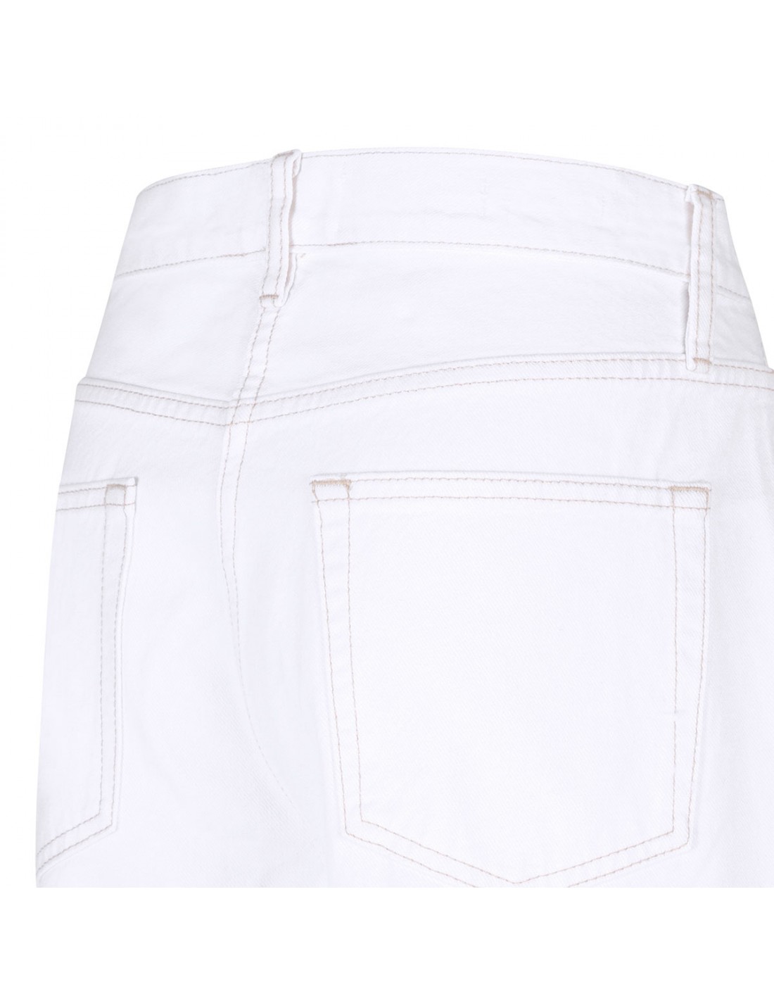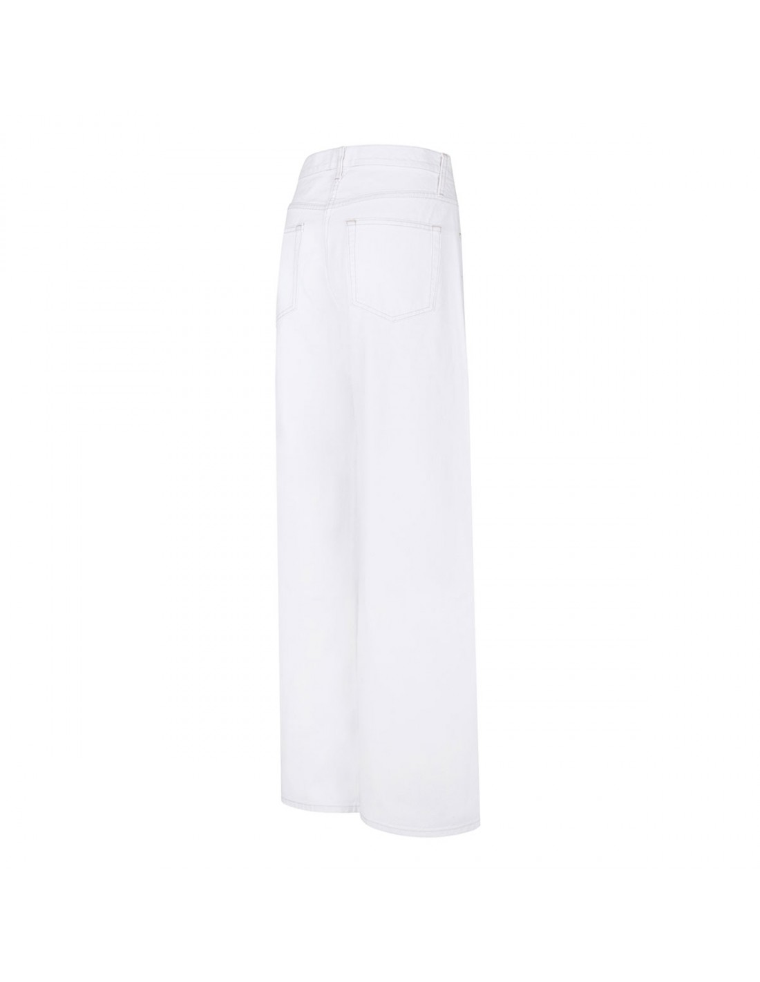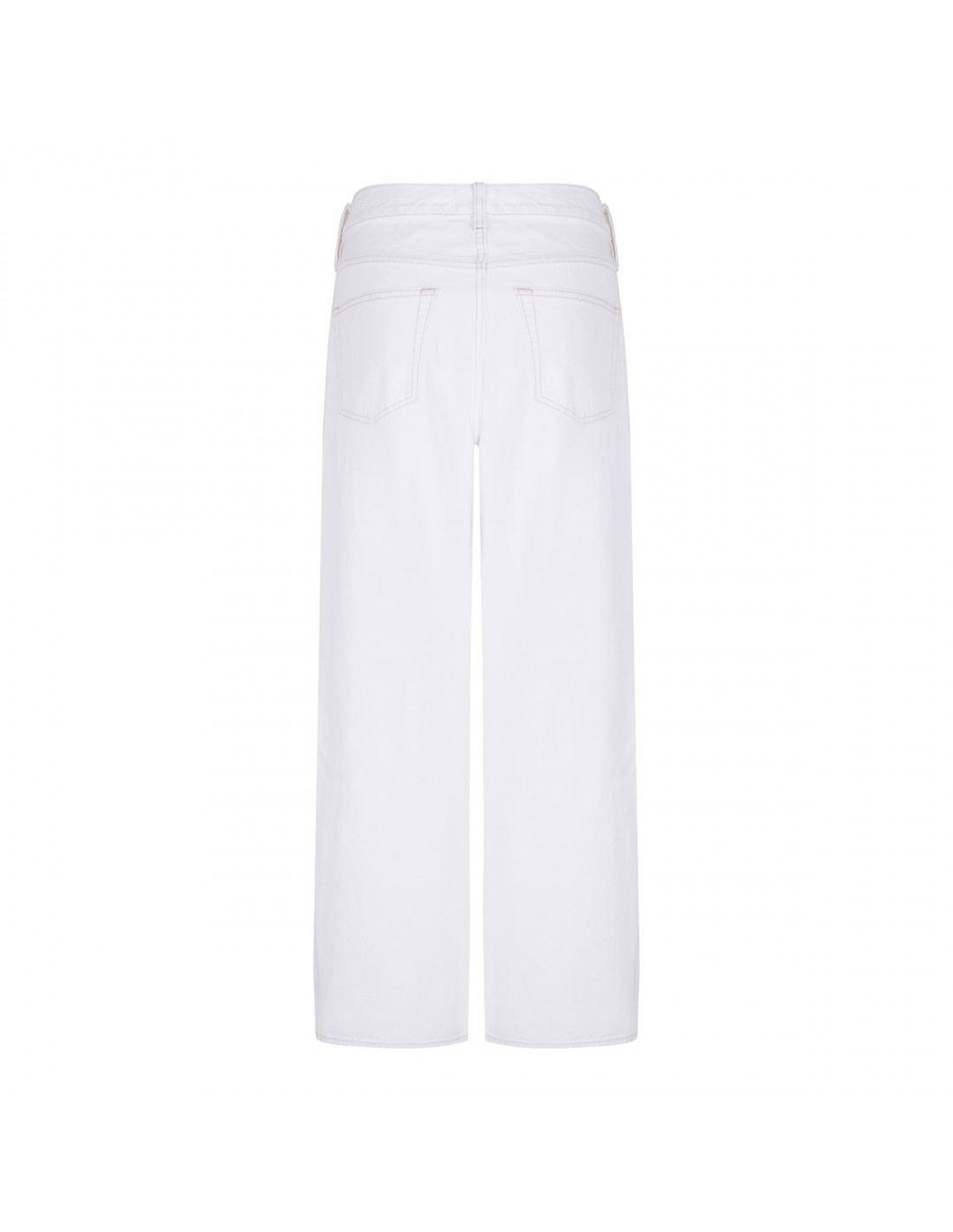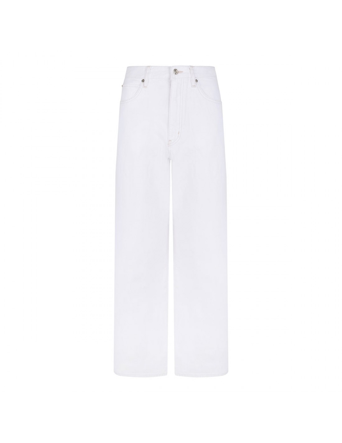 White rigid denim The Bow jeans from Frame featuring barrel leg, high-rise waist, full-length, contrasting stitching, belt loops on the waistband, button closure, zip fly, classic five-pocket design.
