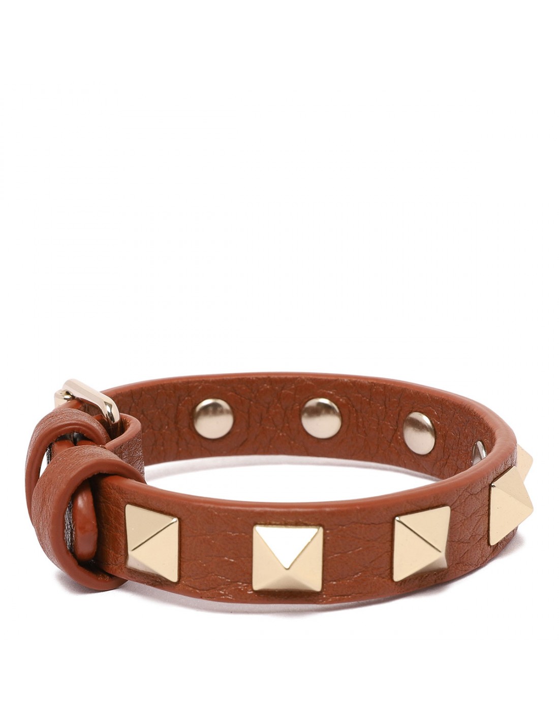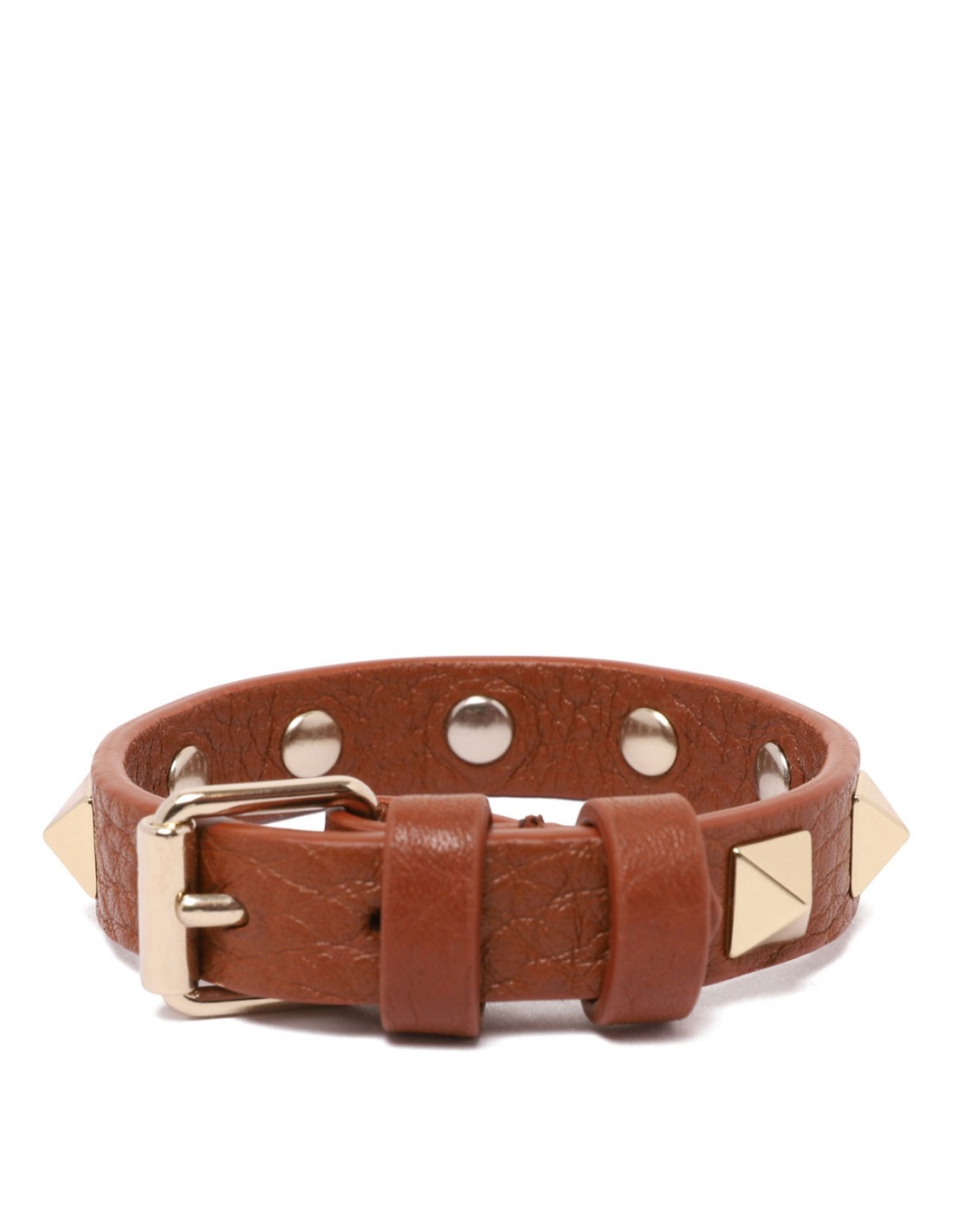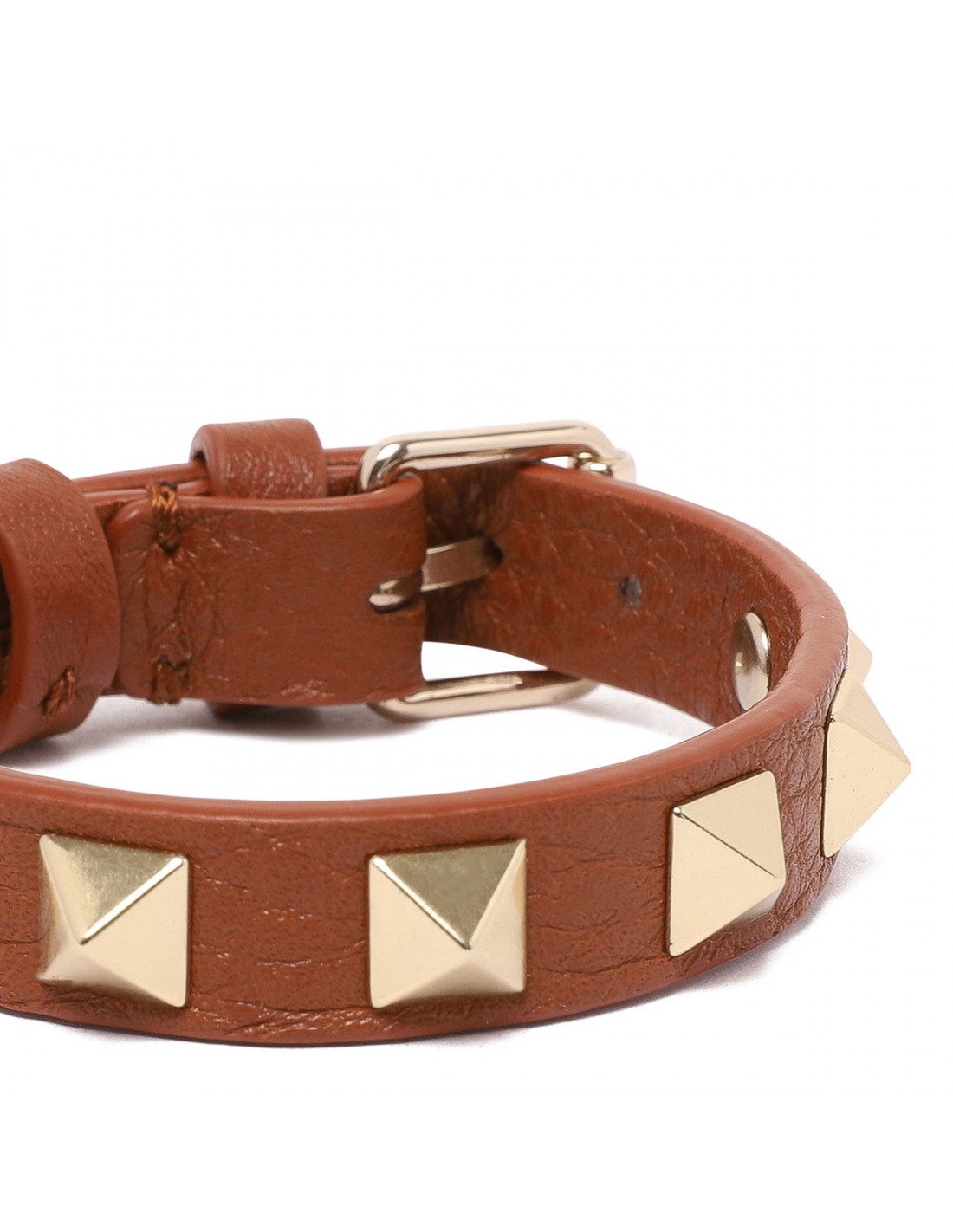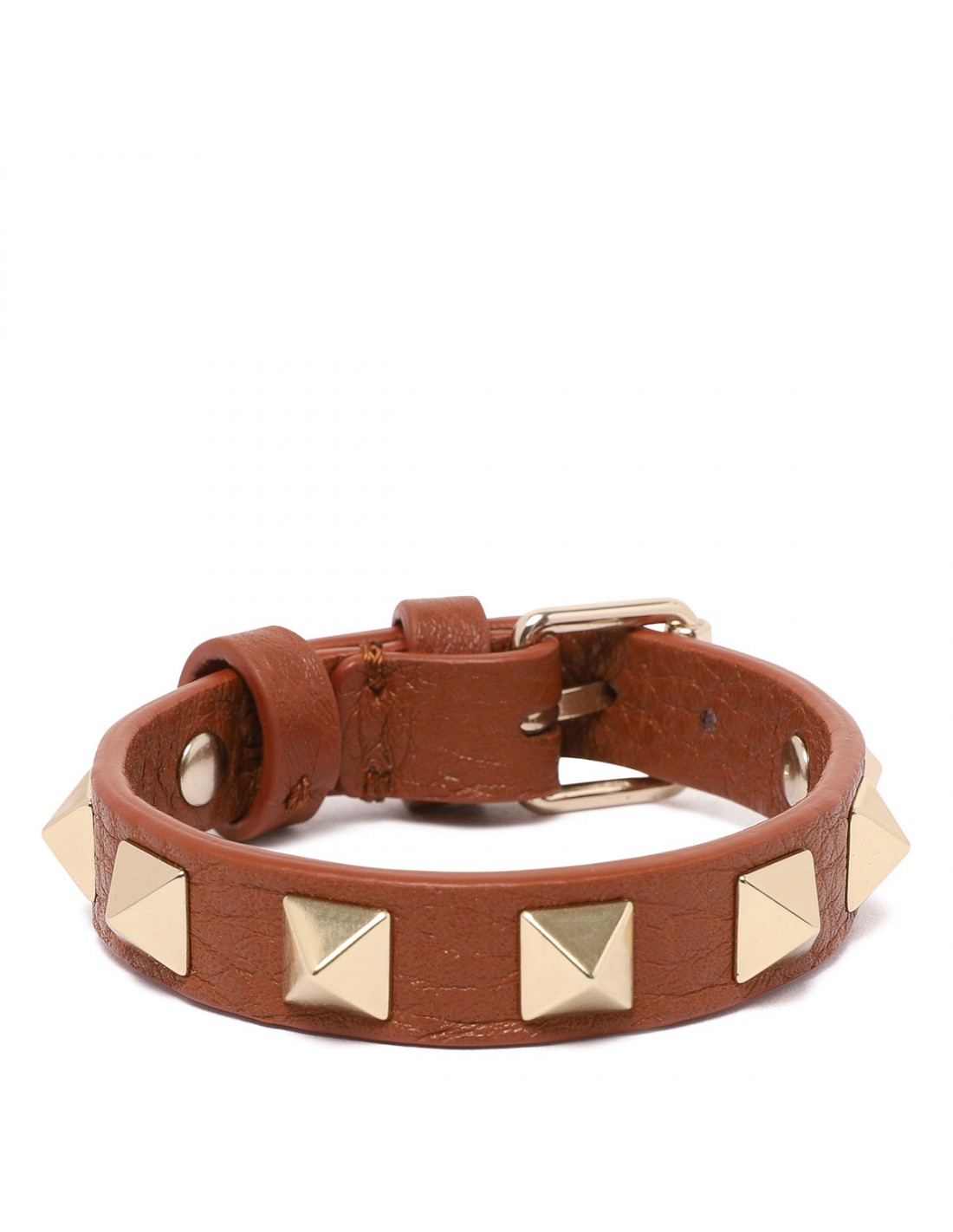 Tan hue calfskin leather Rockstud bracelet from Valentino Garavani featuring platinum-finish studs, buckle closure and adjustable strap.