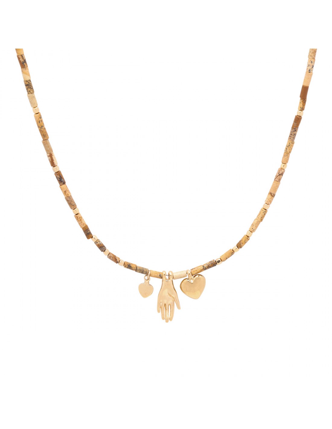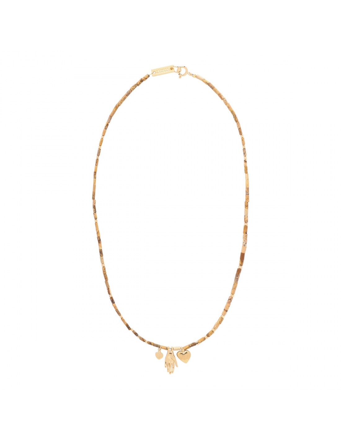 Natural hue beads necklace from Isabel Marant featuring two golden hearts and one golden hand charms, golden brass hardware, lobster clasp fastening.