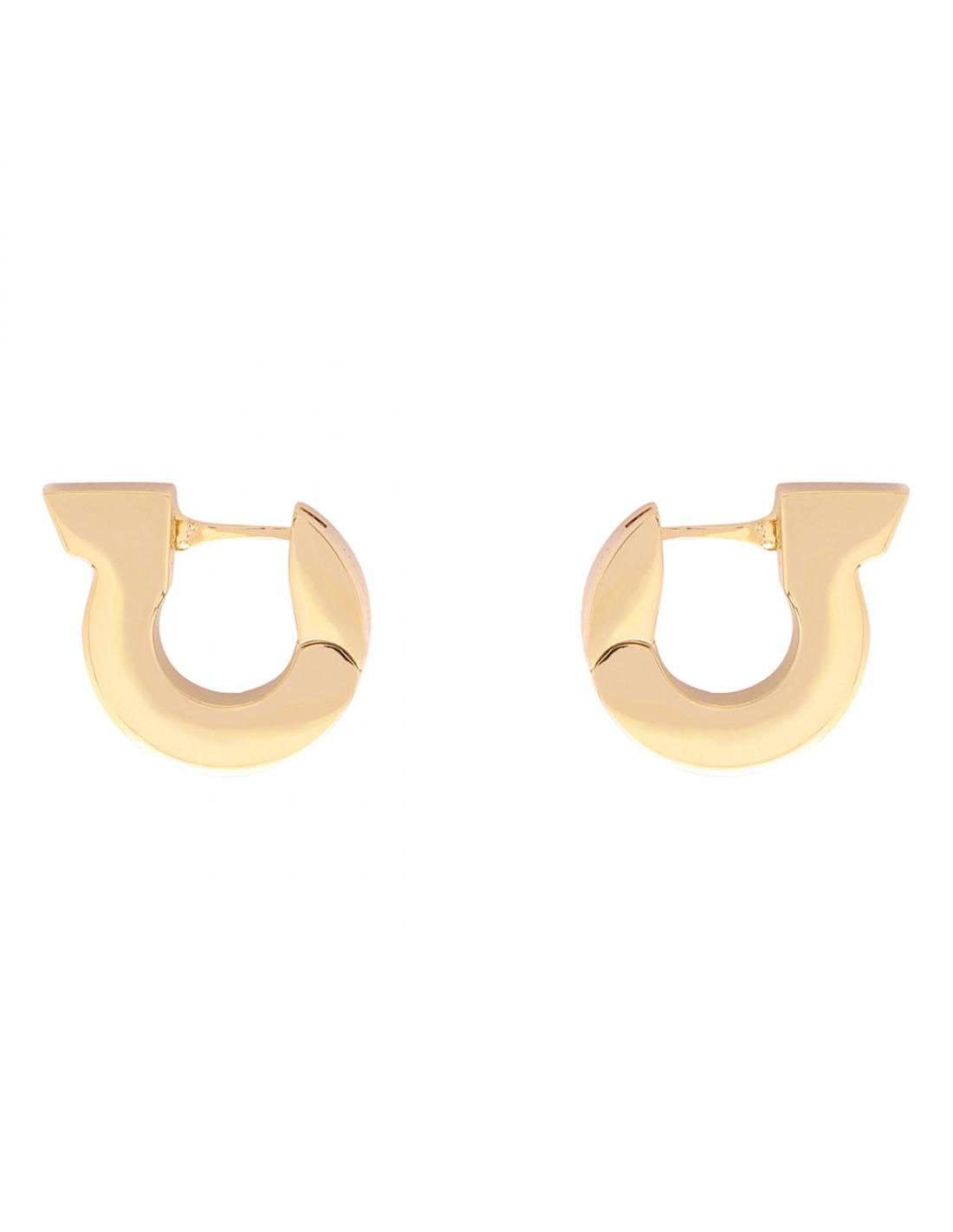 Matte-finish golden brass Gancini earrings from Ferragamo featuring square outline, mini crystals embellishment, logo engraved on the back, butterfly-back fastening.