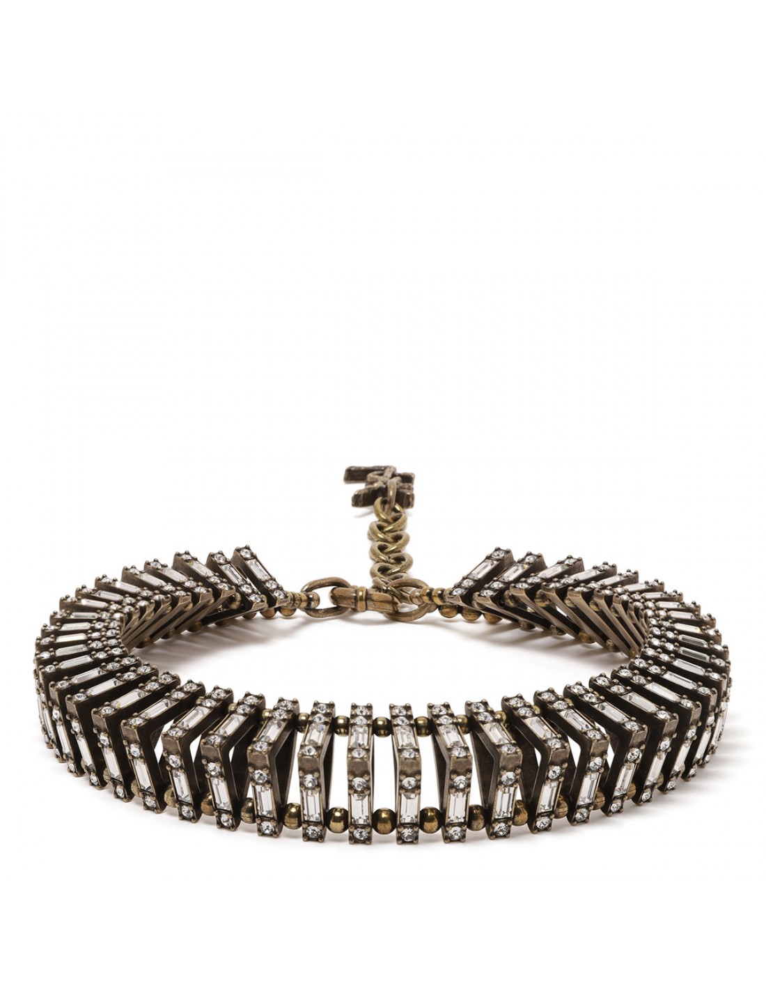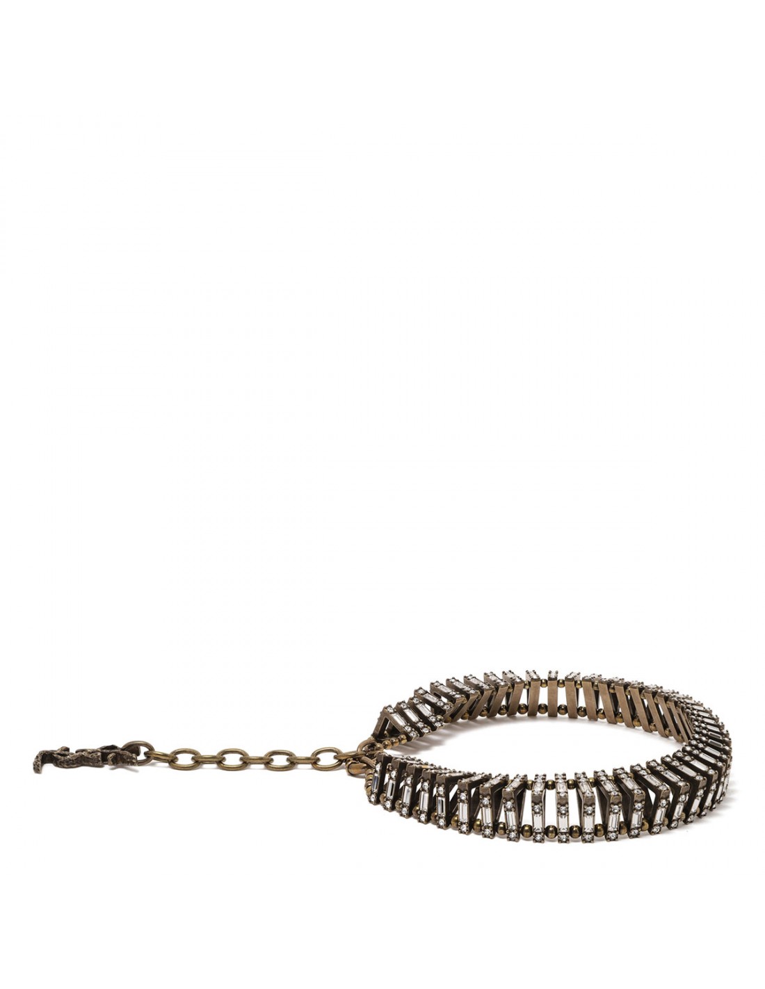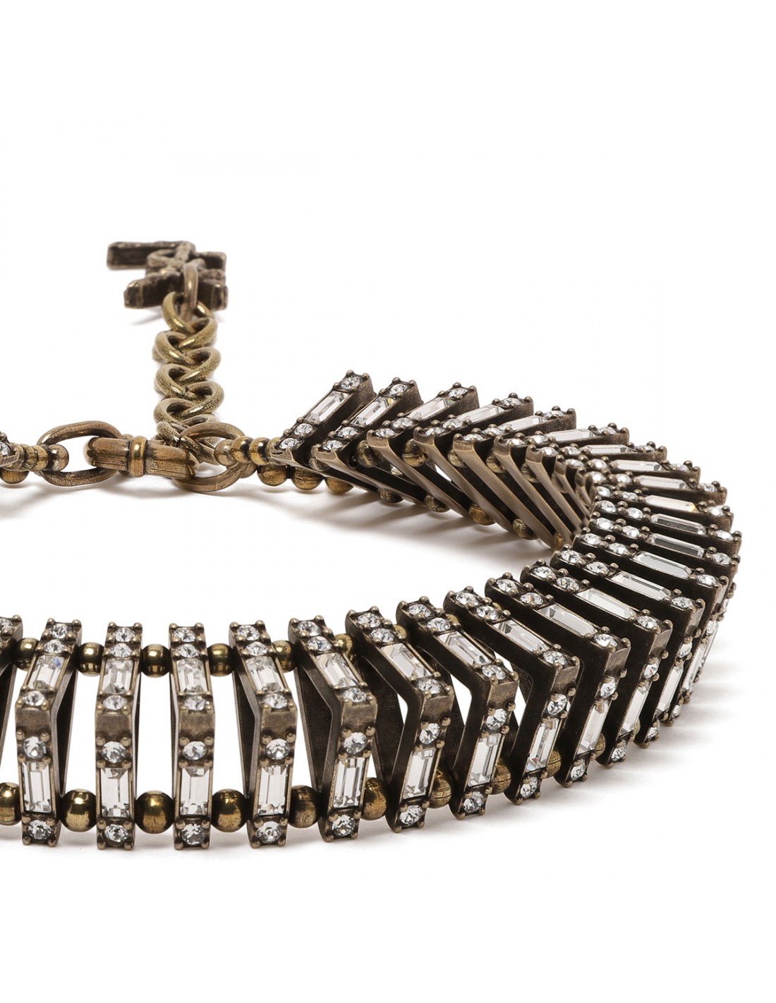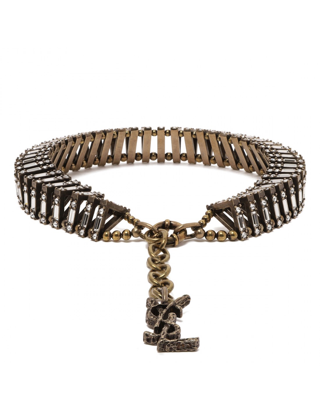 Triangular chain necklace from Saint Laurent featuring round and emerald-cut crystals, adjustable spring ring clasp with Cassandre charm, logo engraved.