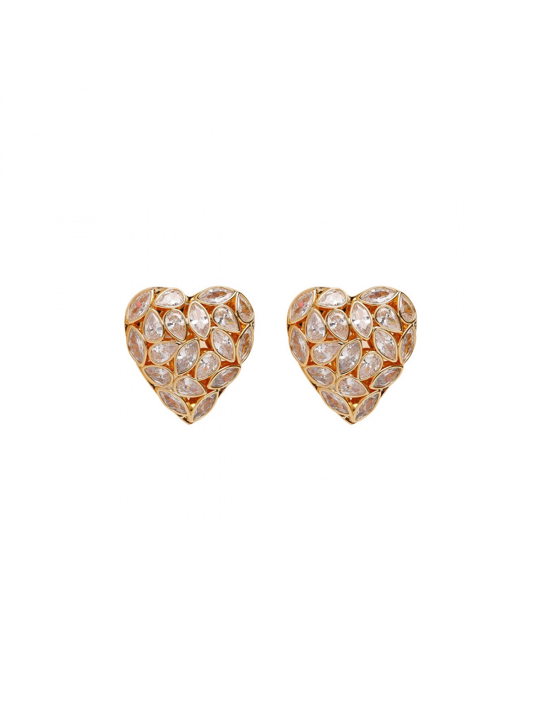 Gold plated brass heart-shaped earrings from Self-Portrait featuring crystal embellishment, sculptural flair and stud backing.