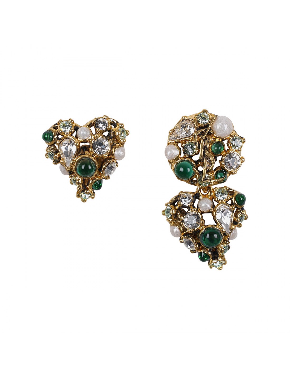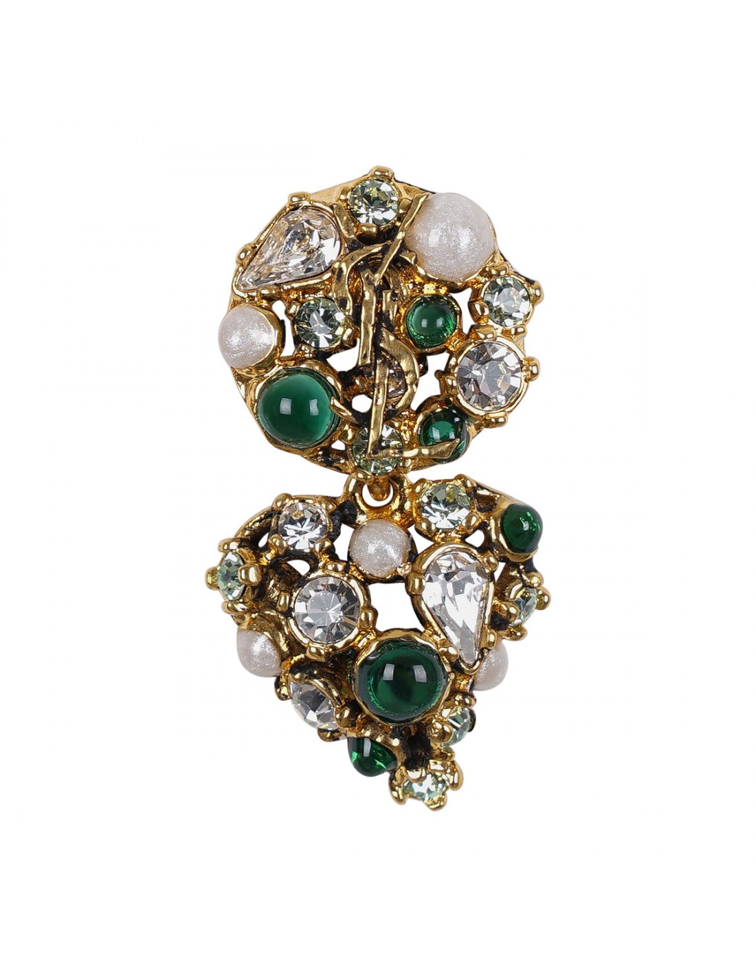 Gold-tone brass asymmetrical heart earrings from Saint Laurent hammered Cassandre, clustered crystals and cabochons of varying cuts, post-and-clutch fastening.
