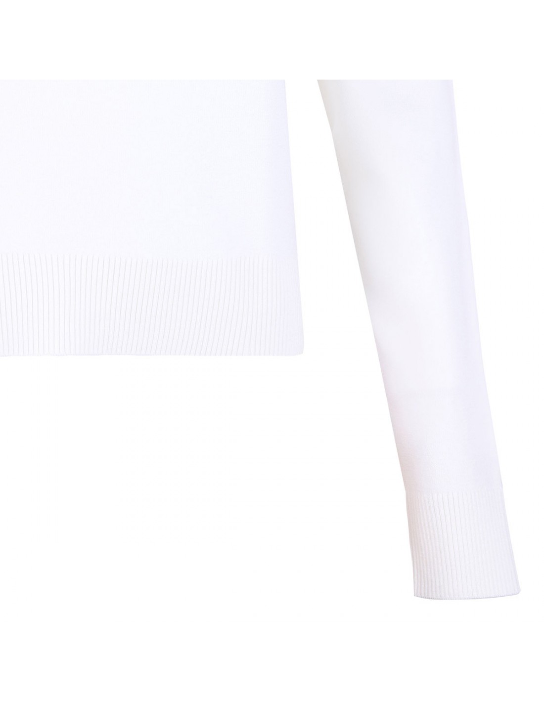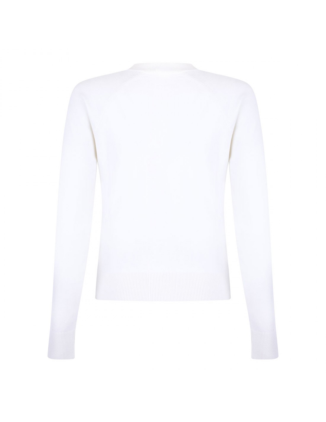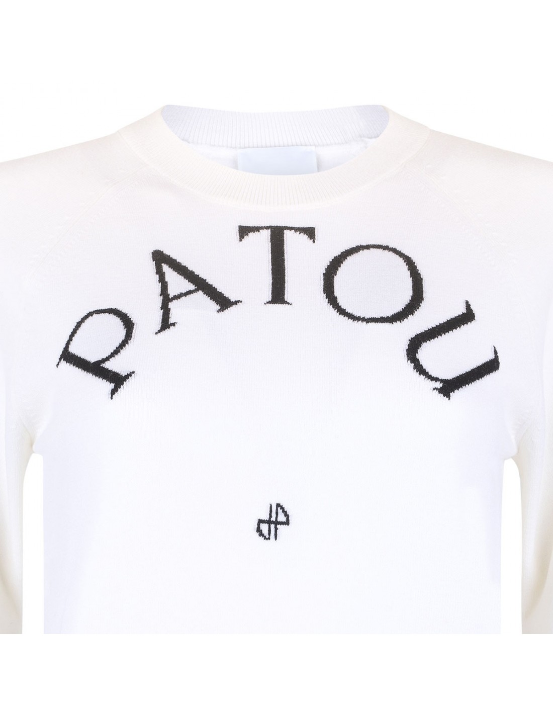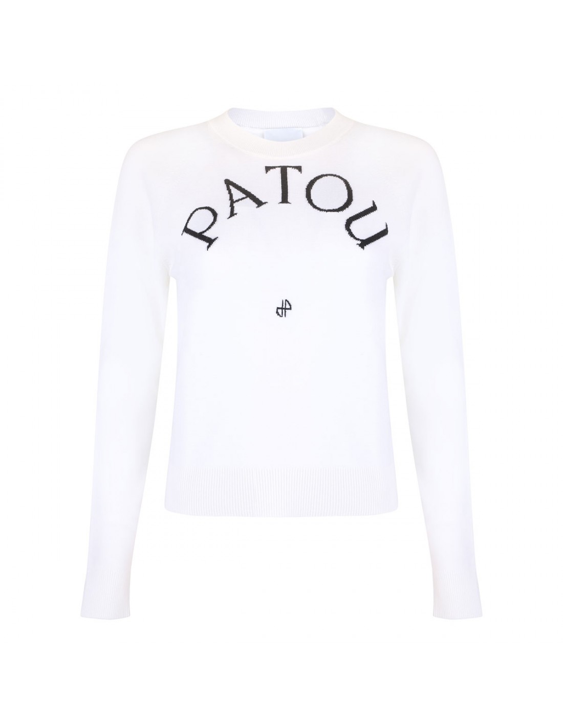 White merino wool blend sweater from Patou featuring contrasting logo and monogram jacquard at front, crew collar, long sleeves, ribbed-knit edges.