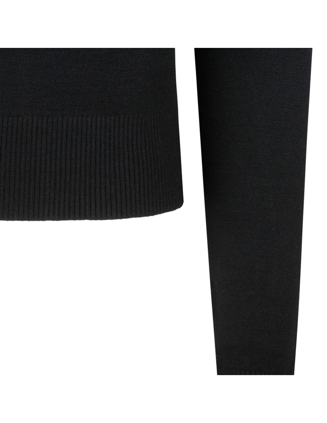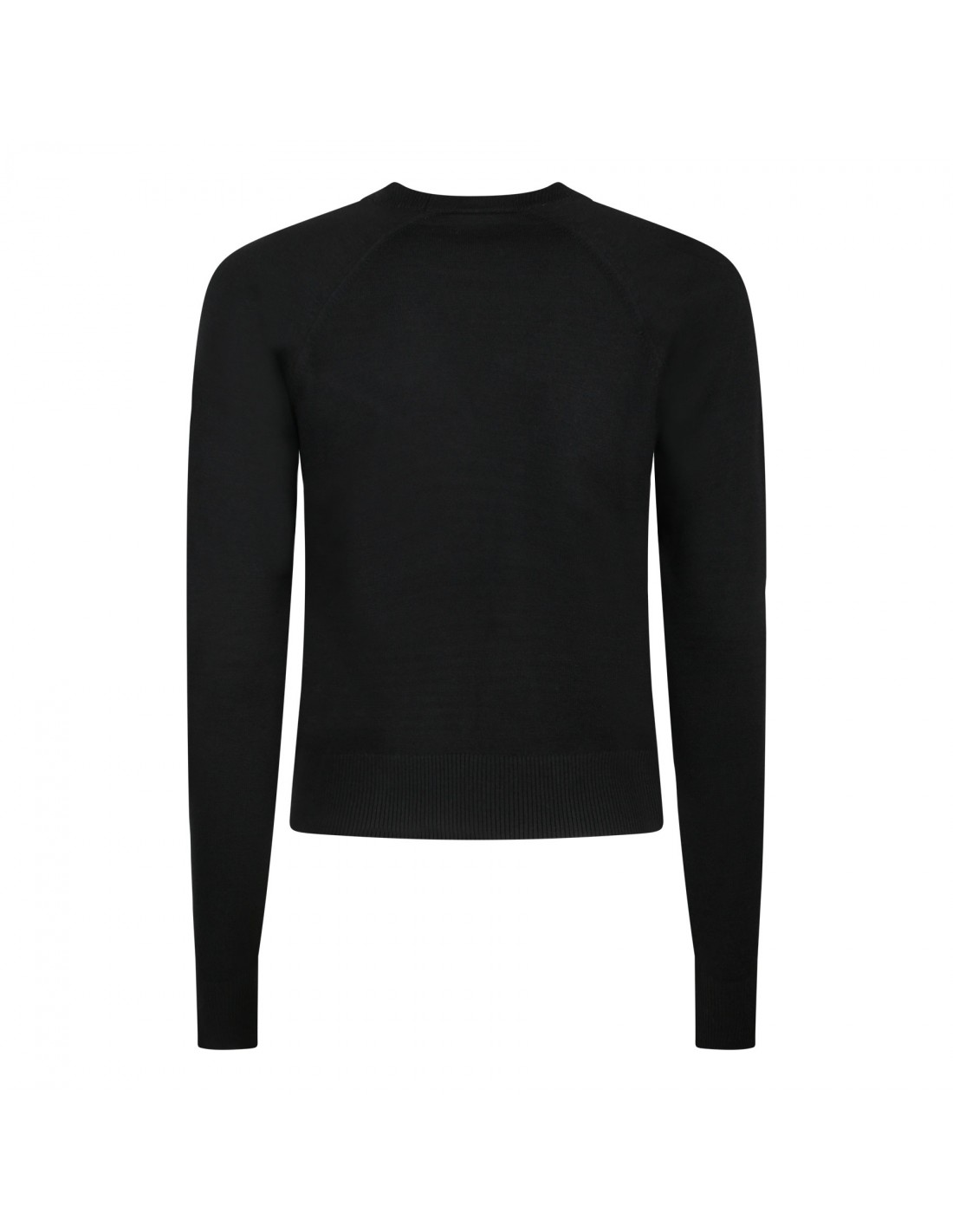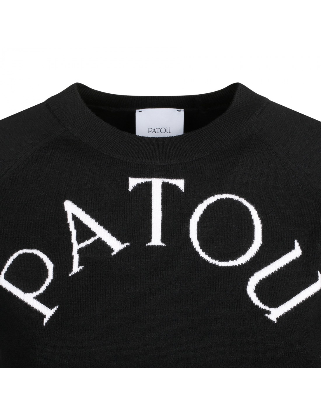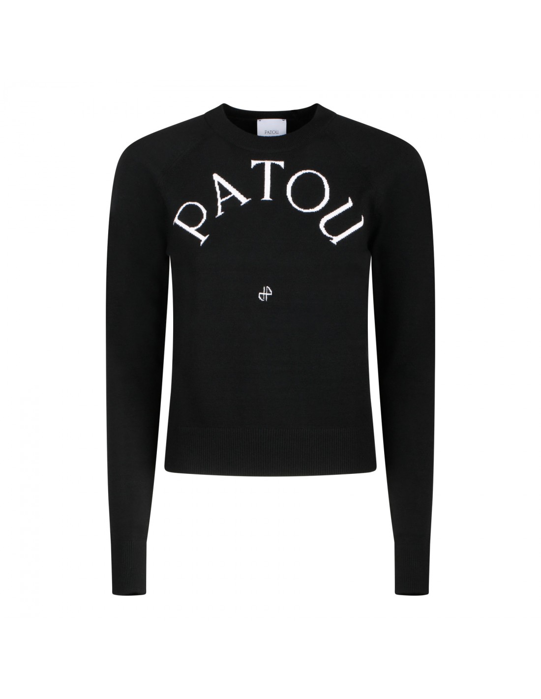 Black merino wool blend sweater from Patou featuring contrasting logo and monogram jacquard at front, crew collar, long sleeves, ribbed-knit edges.