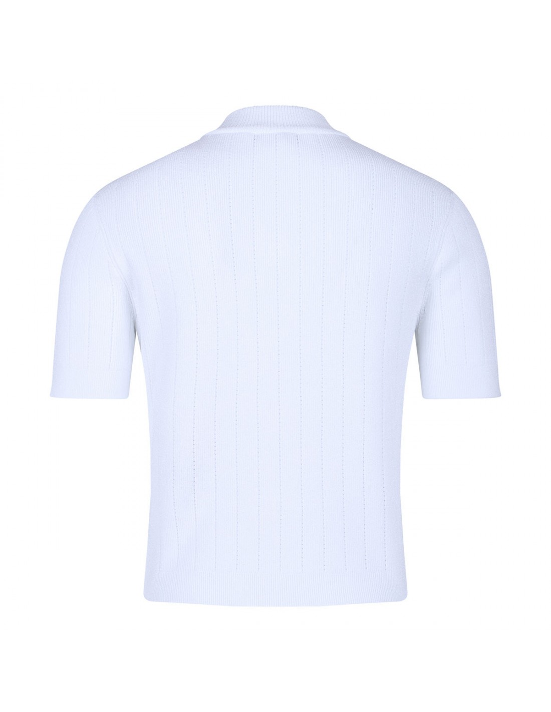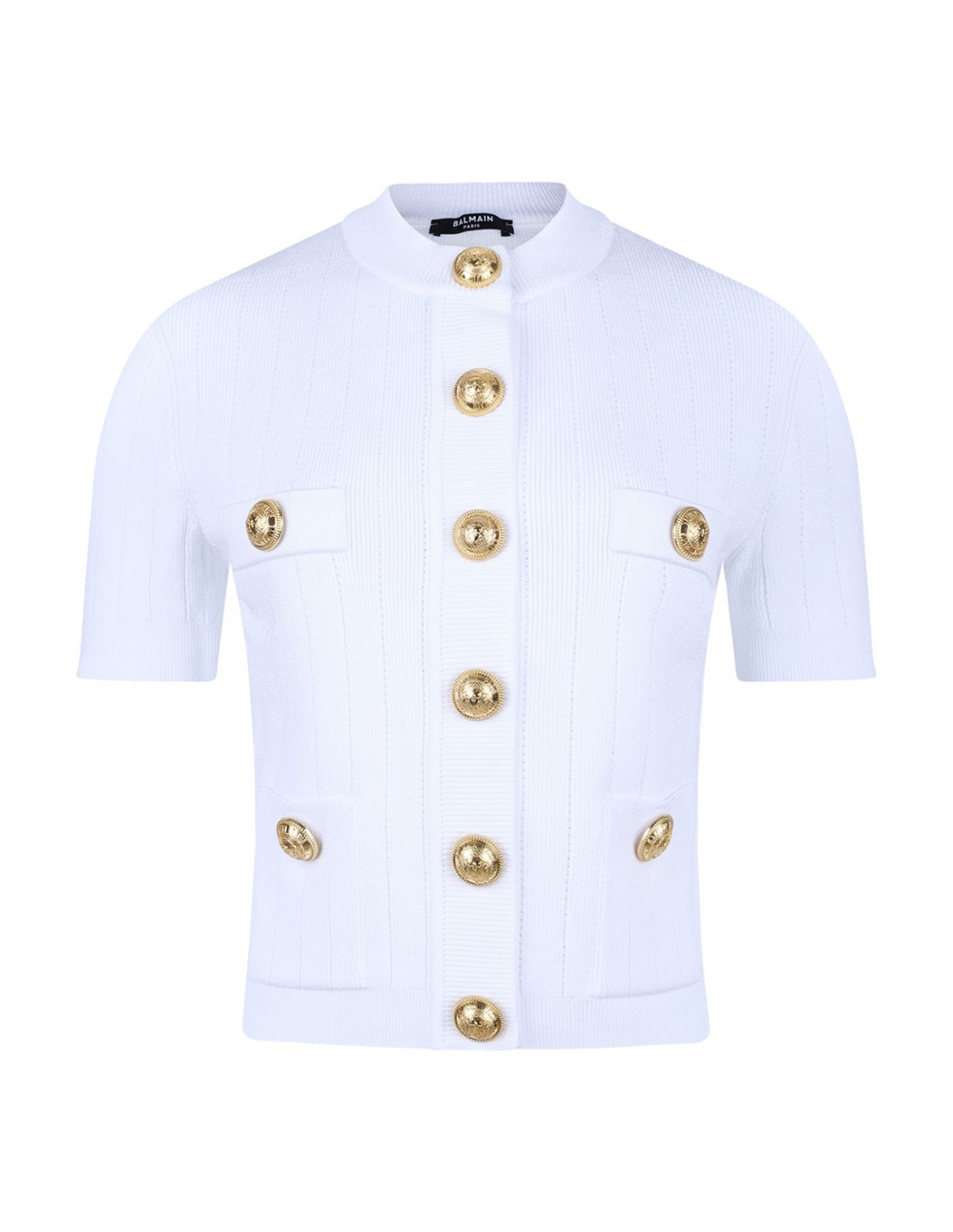 White ribbed knit cardigan from Balmain featuring gold metal signature coin button fastening, fitted silhouette, crew collar, fake pockets with buttons, structured shoulders and short sleeves.