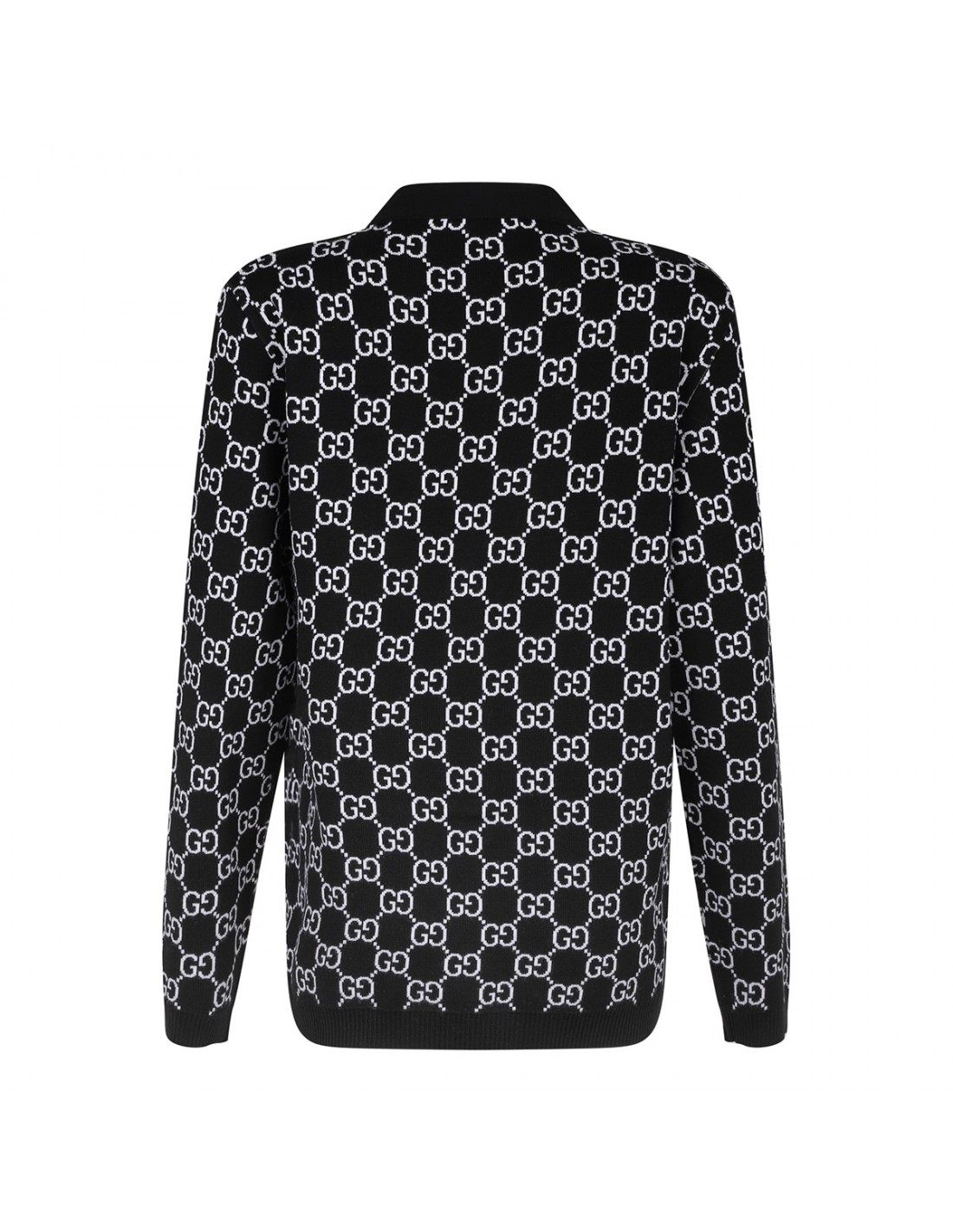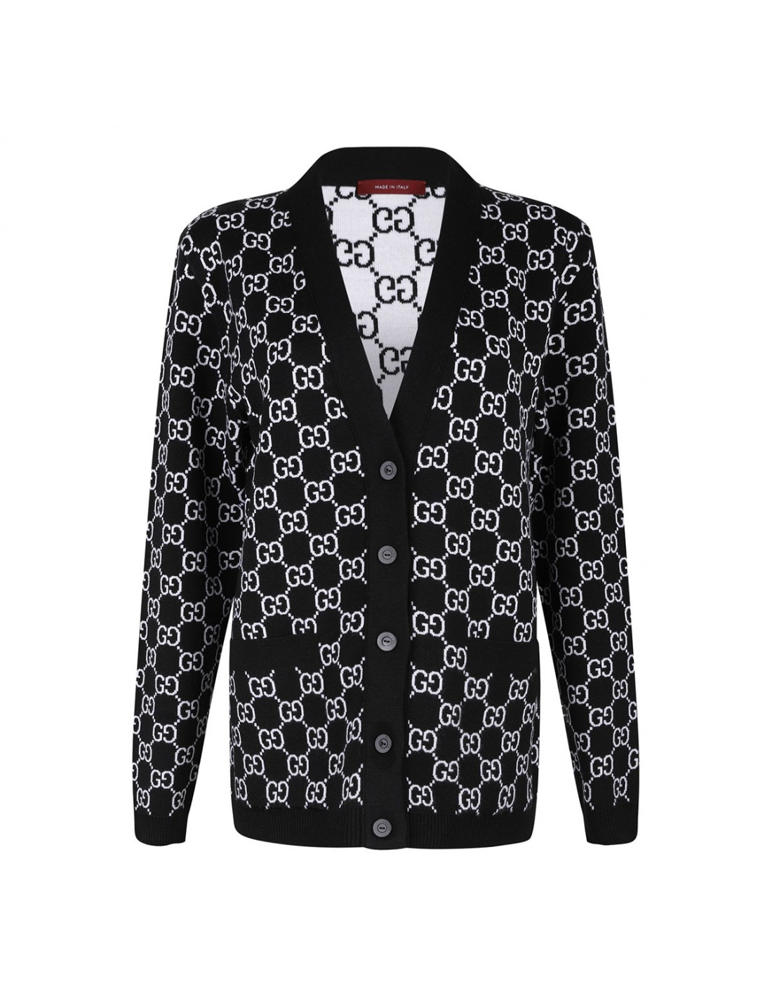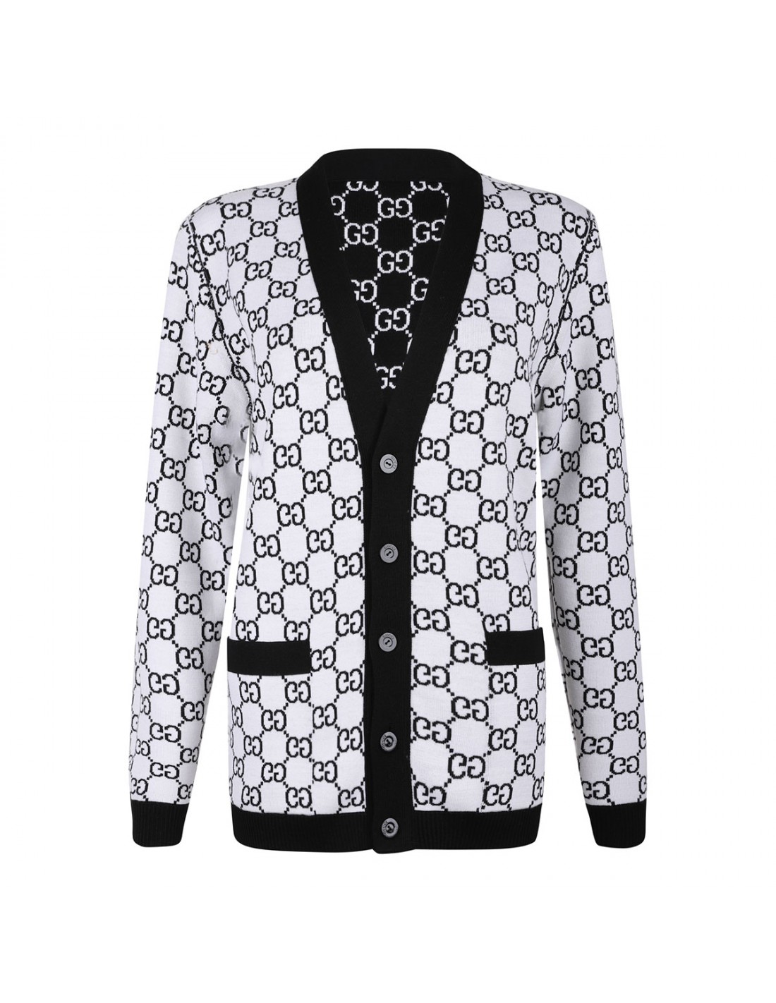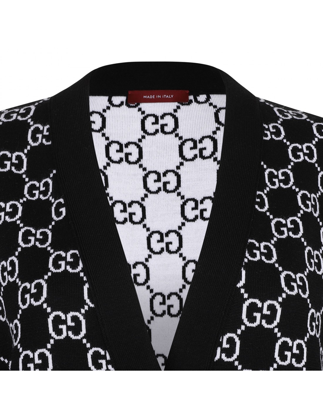 Black and white reversible wool cardigan from Gucci featuring GG jacquard stitch, V-neck, long sleeves, dropped shoulders, button closure, front pockets, contrasting ribbed-knit trims, regular fit.