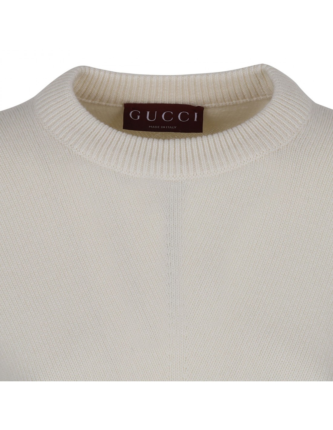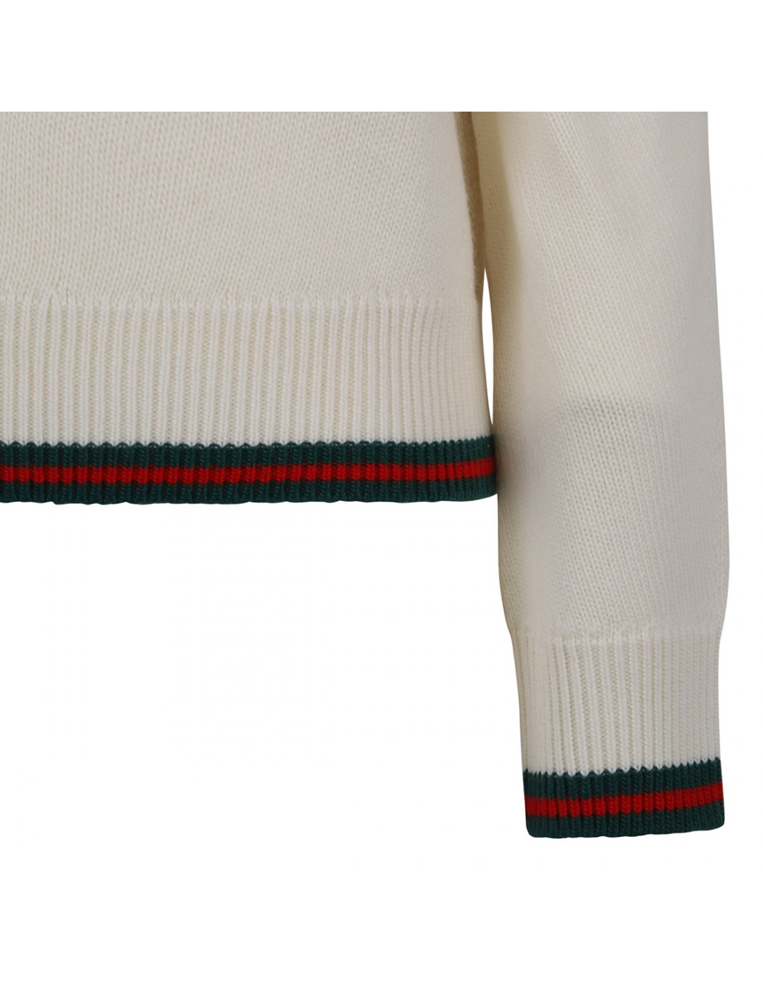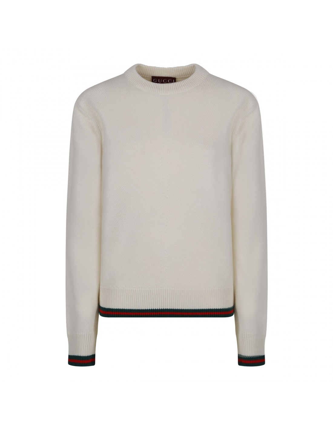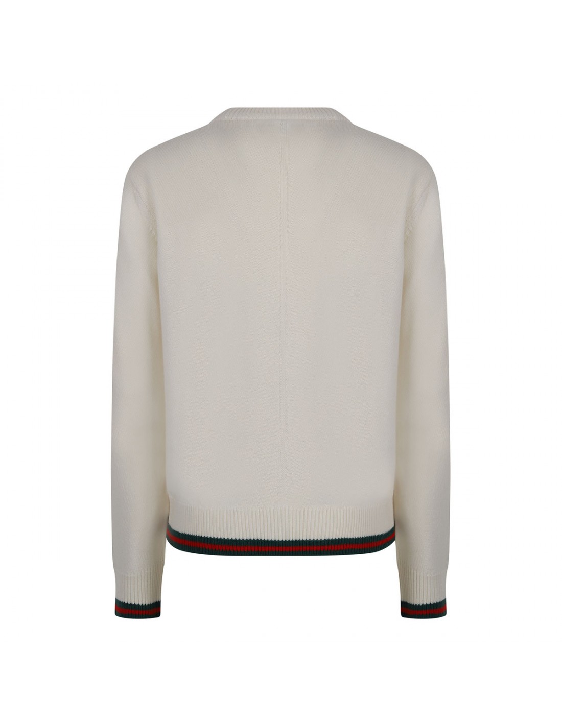 Ivory wool and cashmere sweater from Gucci featuring red and green Web trims, crew collar, dropped shoulders, long sleeves, ribbed-knit edges.