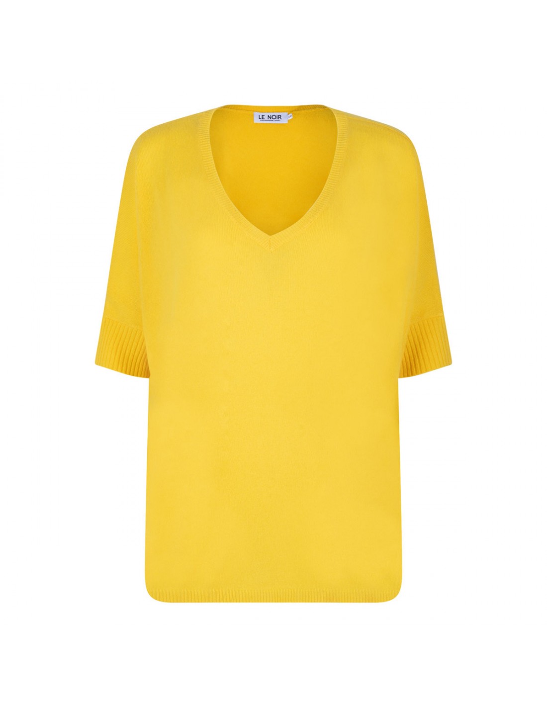 Yellow cashmere Aimee top from Le Noir featuring V-neck, half-length sleeves, ribbed knit edges.