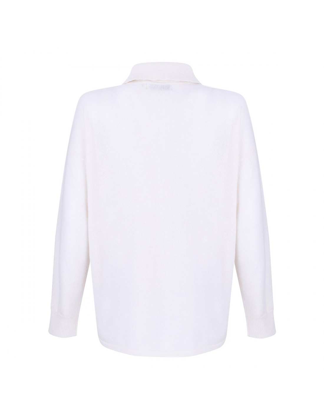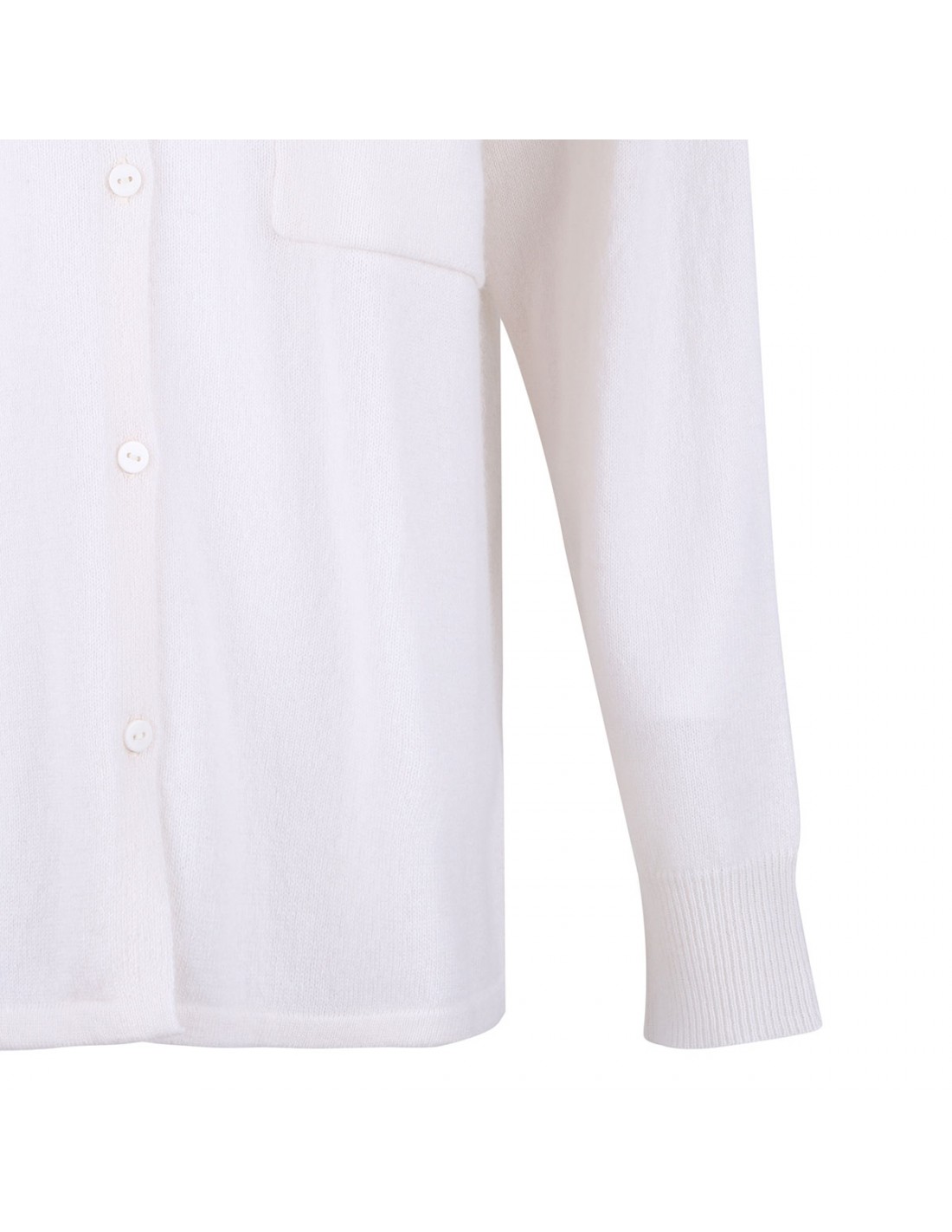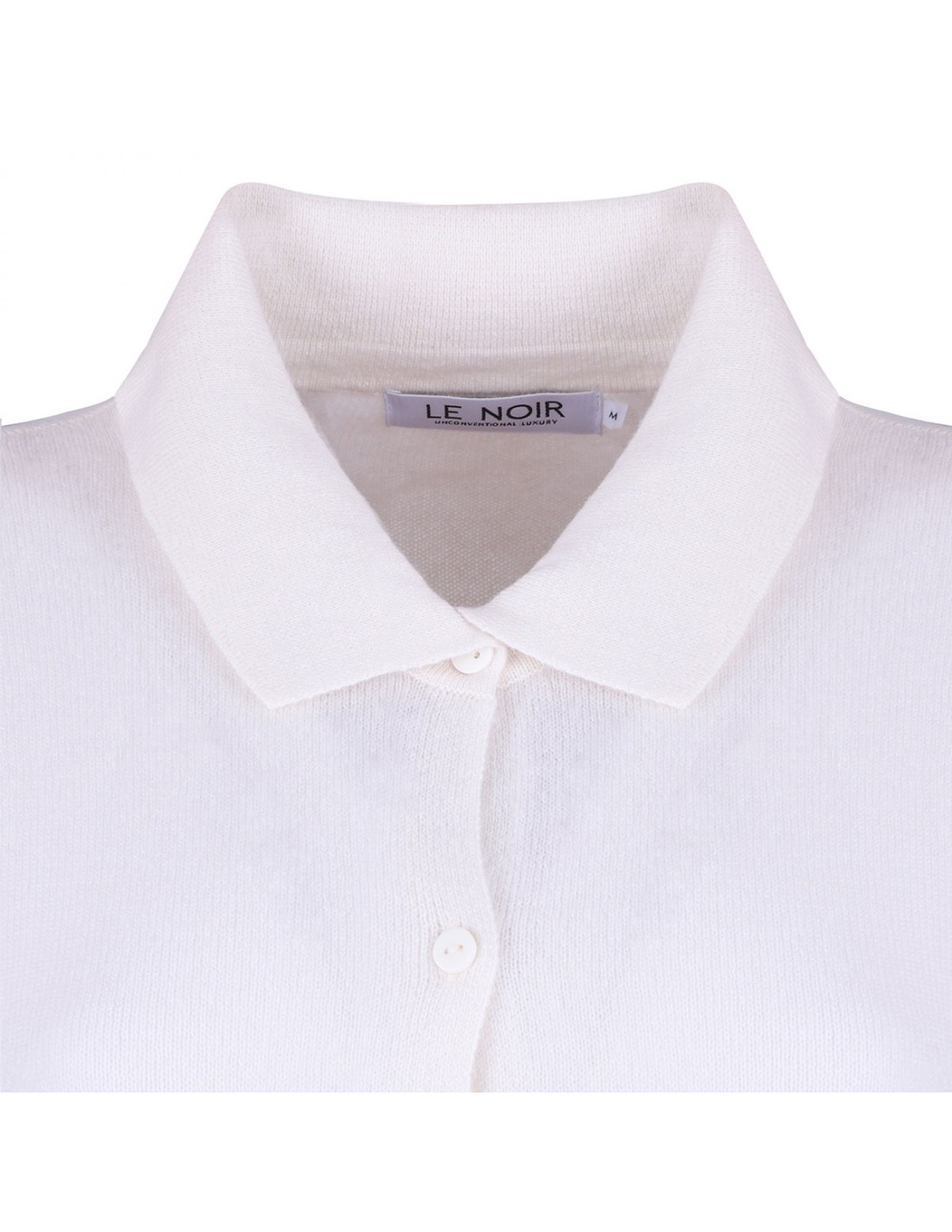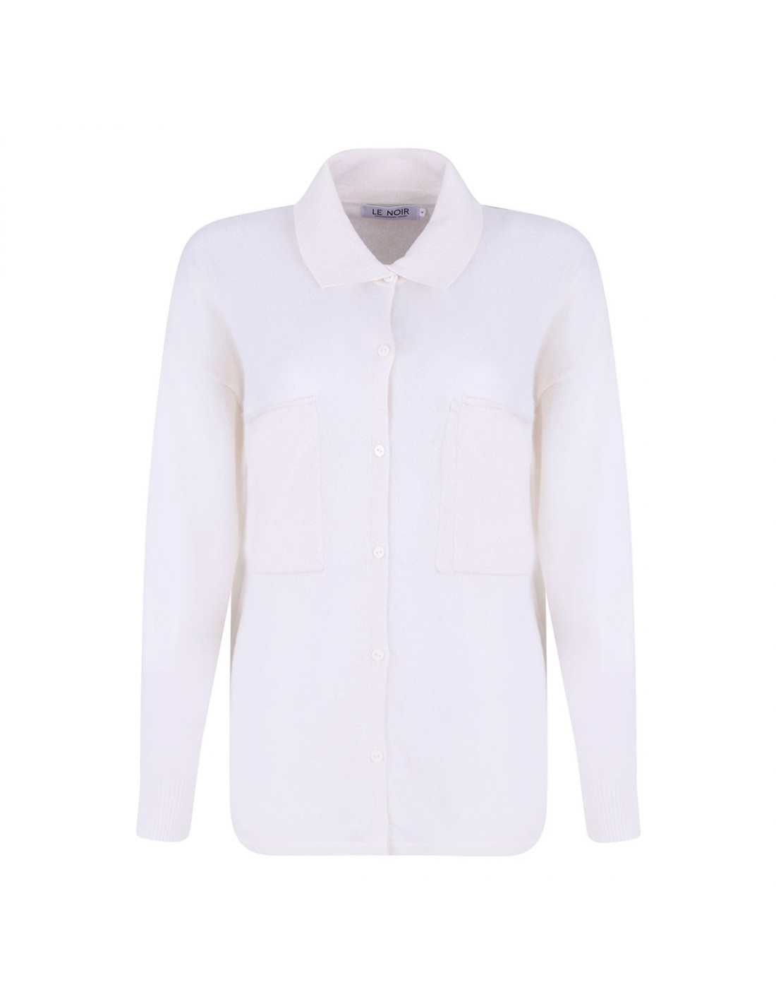 Ecru knit cashmere Desiree shirt from Le Noir featuring pointed collar, button closure, long sleeves, double chest patch pocket, ribbed knit edges.