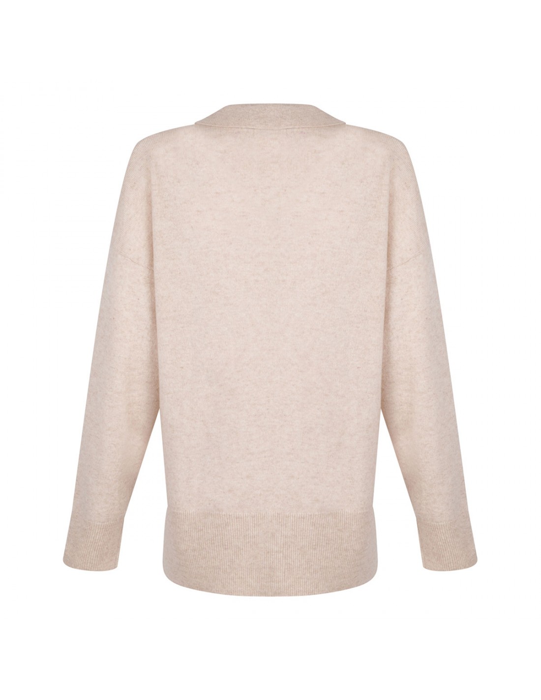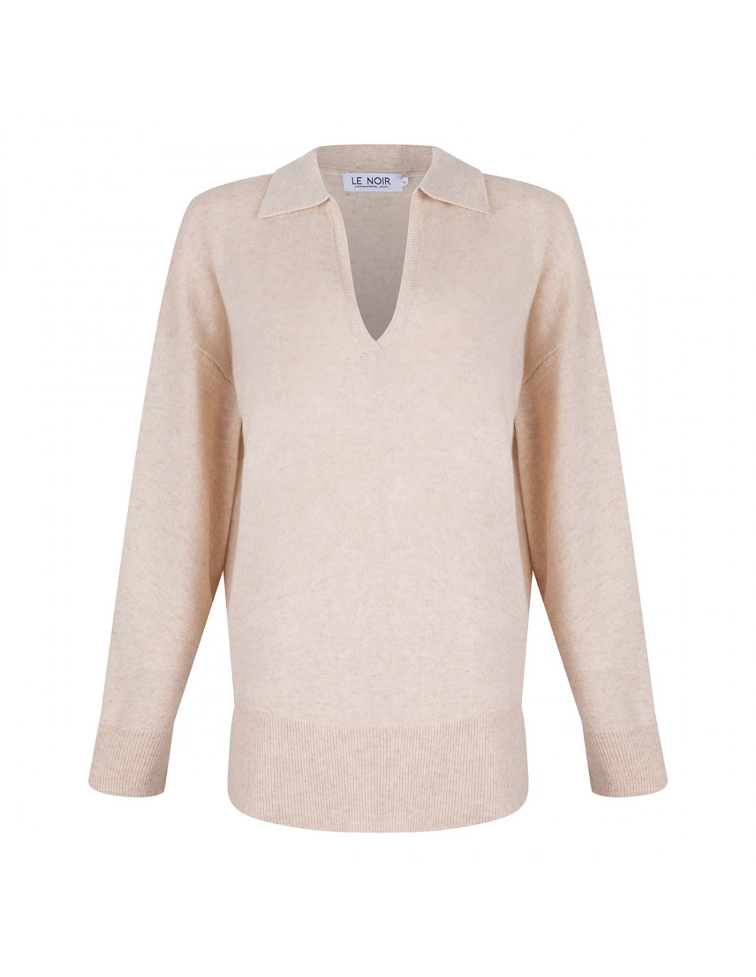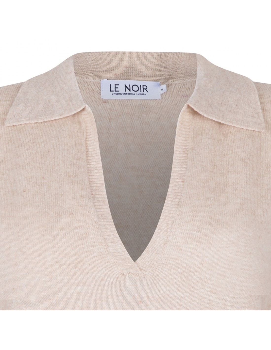 Beige cashmere Romeo polo sweater from Le Noir featuring polo collar with V-neck, long sleeves, ribbed-knit edges.