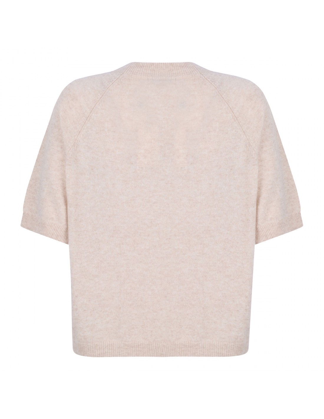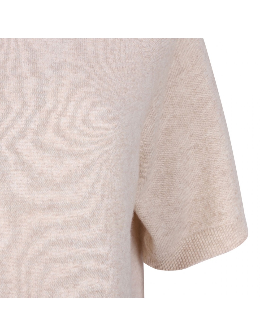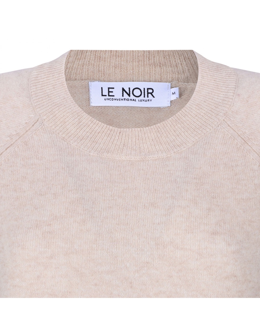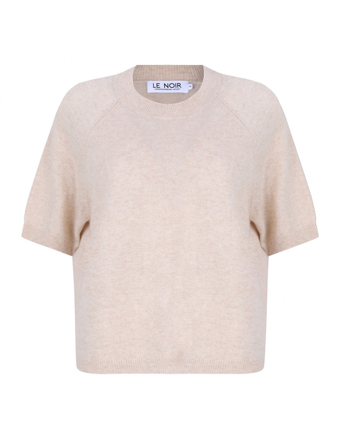 Beige cashmere Loona top from Le Noir featuring crew collar, short raglan sleeves, ribbed knit edges.