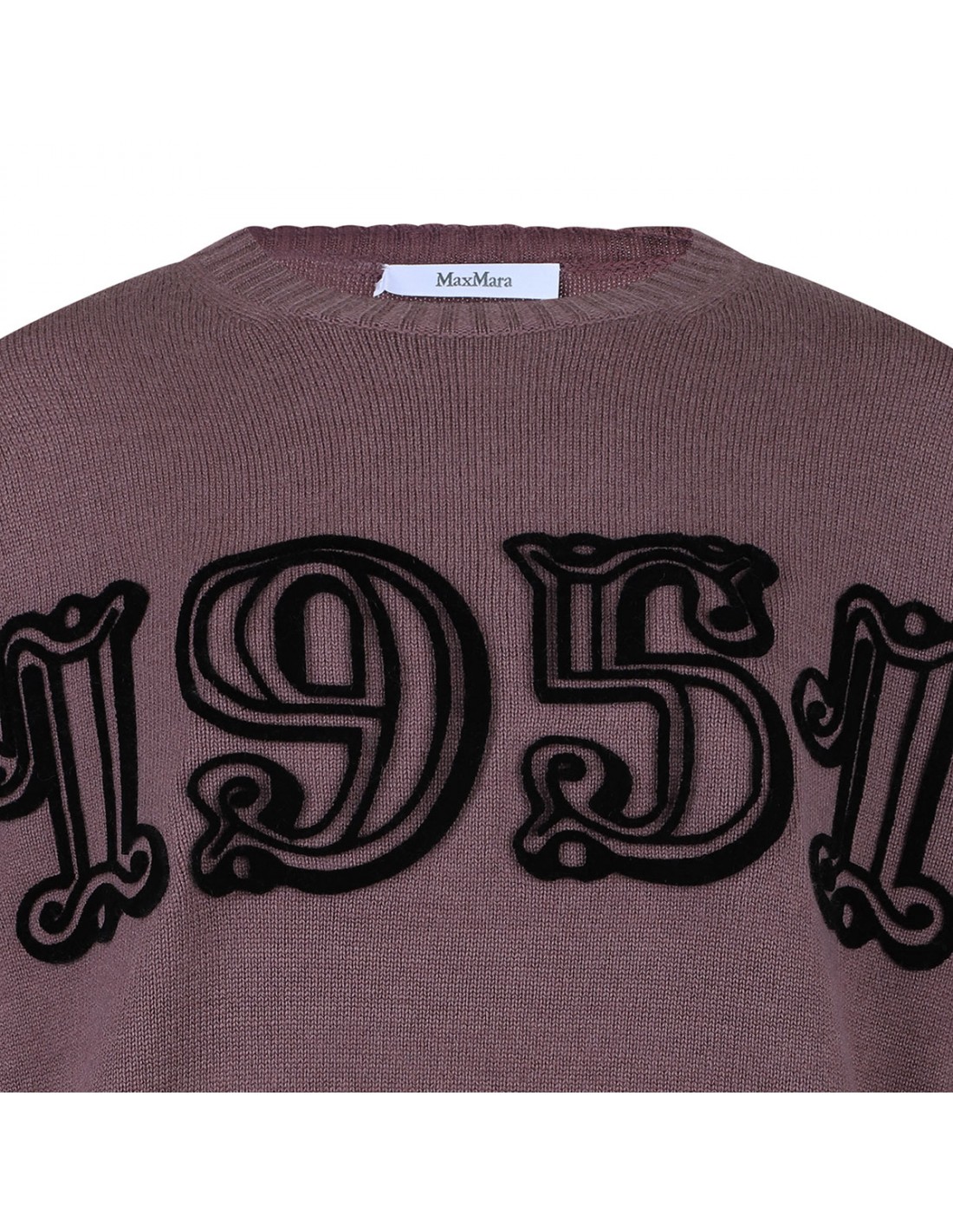 Mauve hue wool and cashmere blend sweater from Max Mara featuring flocked 1951 motif on the front, slightly oversized silhouette, long low-set sleeves, crew collar and ribbed-knit edges.
