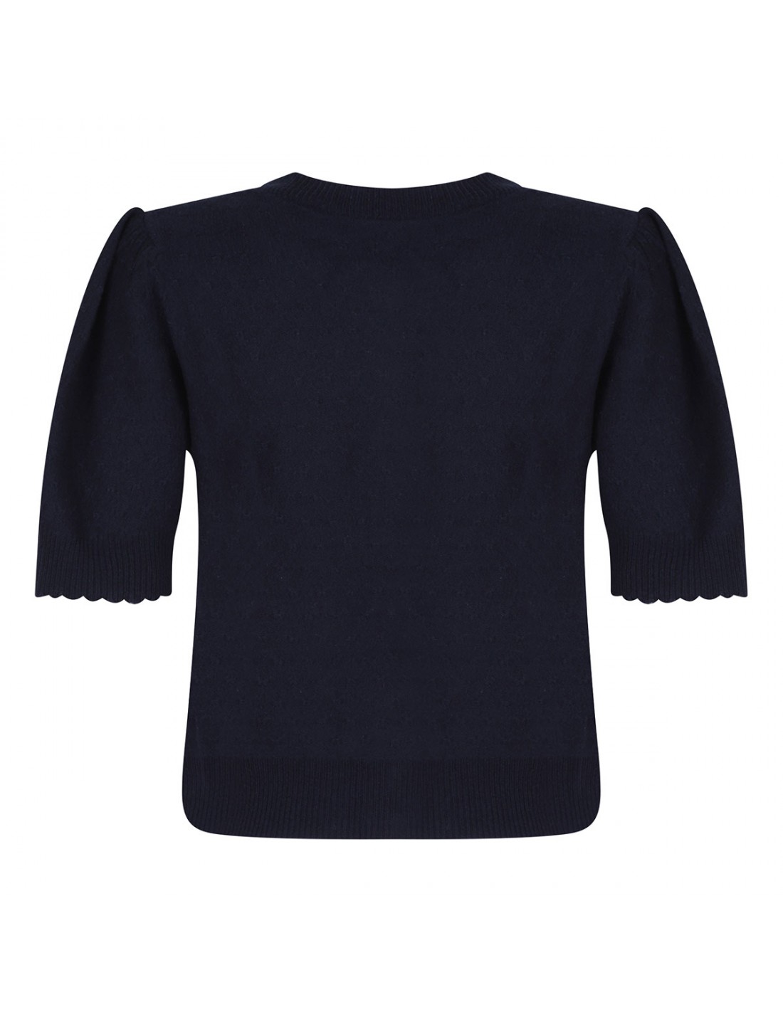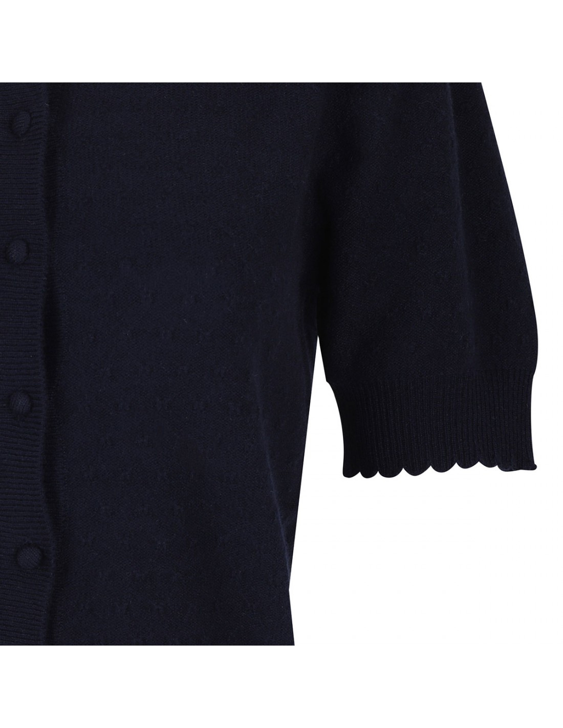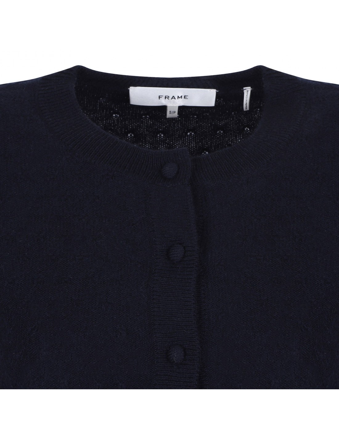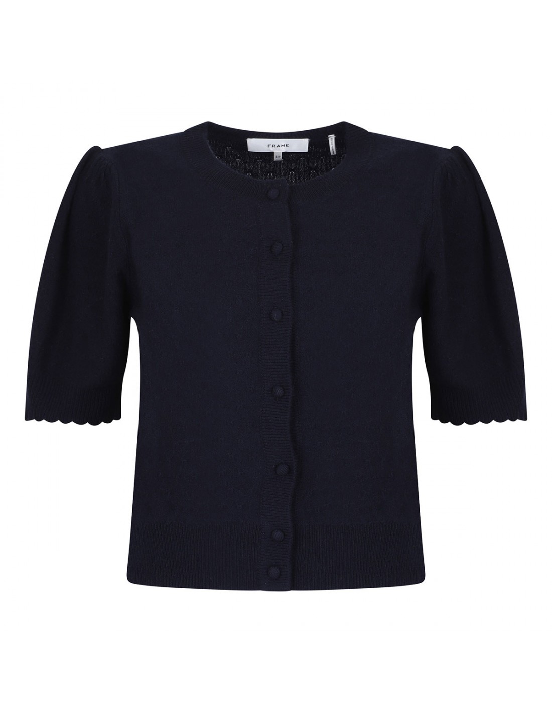 Navy cashmere cardigan from Frame featuring pointelle stitching, short puff sleeves with scalloped trims, button closure on front, crew collar, ribbed knit edges.