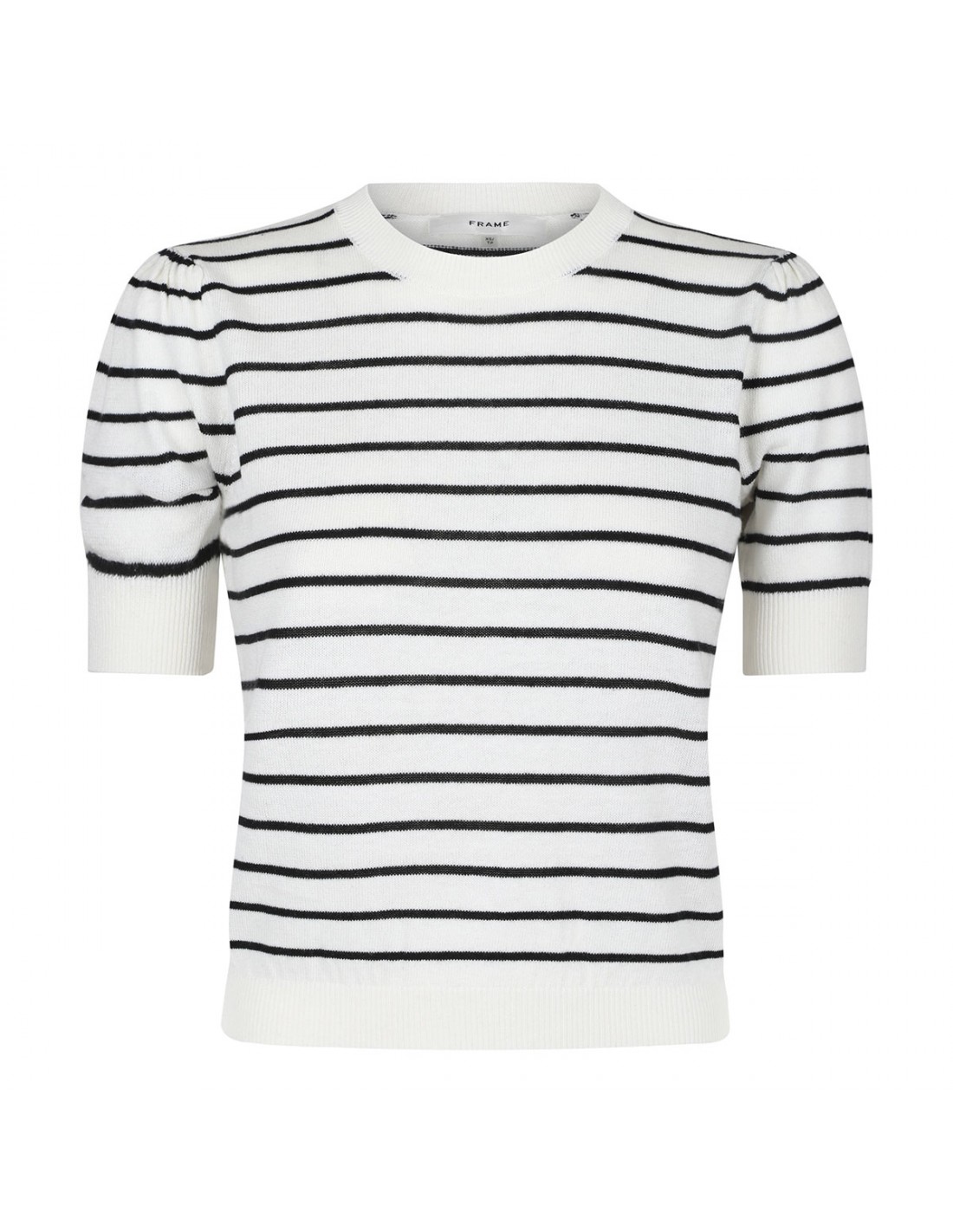 Cream white and black linen and cotton blend The Gathered sweater from Frame featuring striped motif, short sleeves with soft pleating, crew collar, ribbed-knit edges.