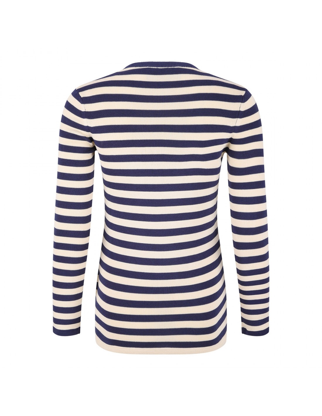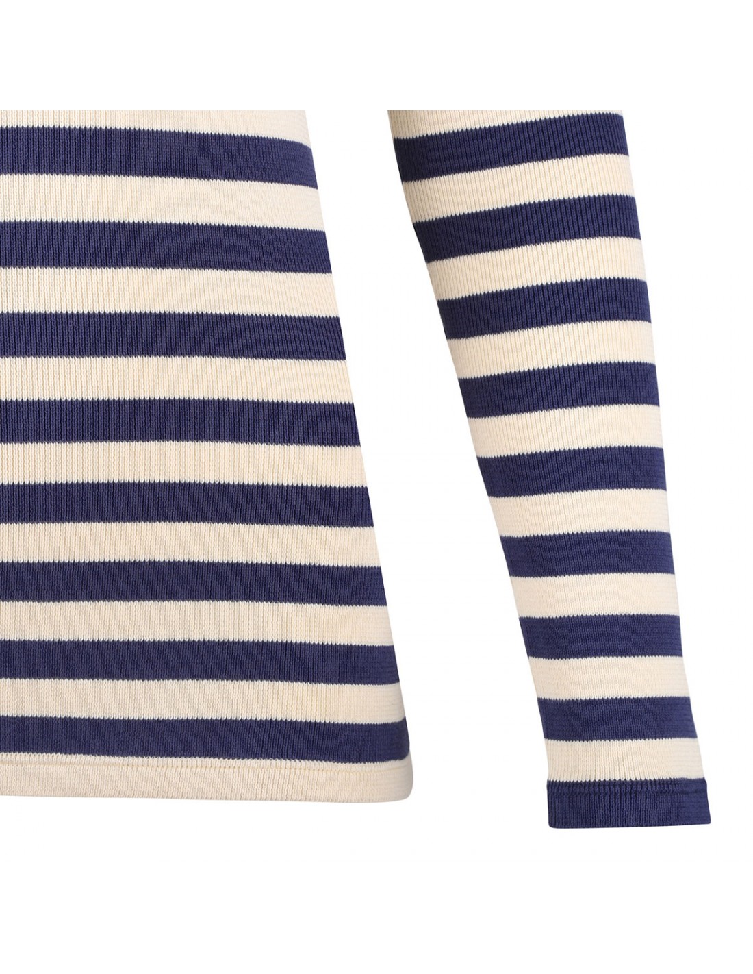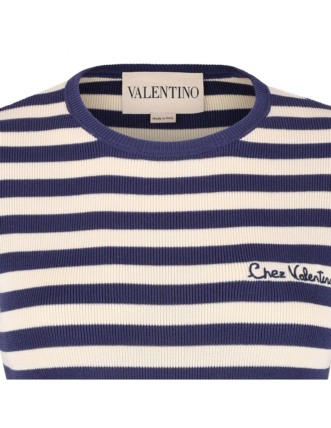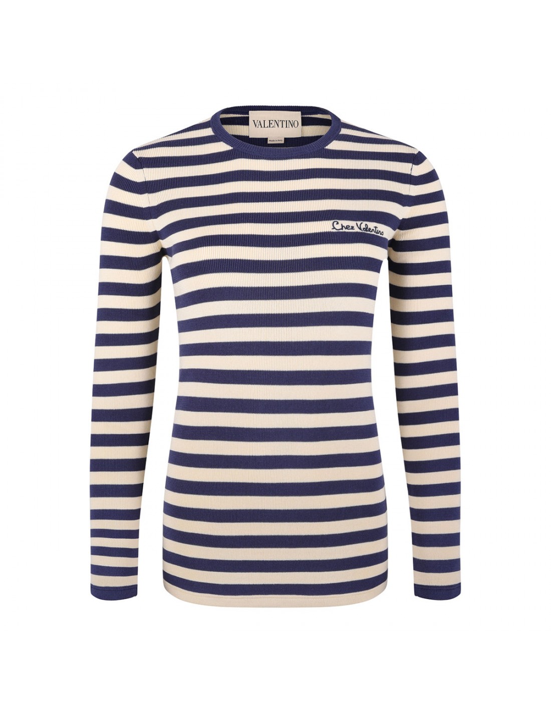 Ivory and provence blue knit cotton jumper from Valentino featuring Chez Valentino embroidery on chest, striped motif, ribbed crew collar, long sleeves.