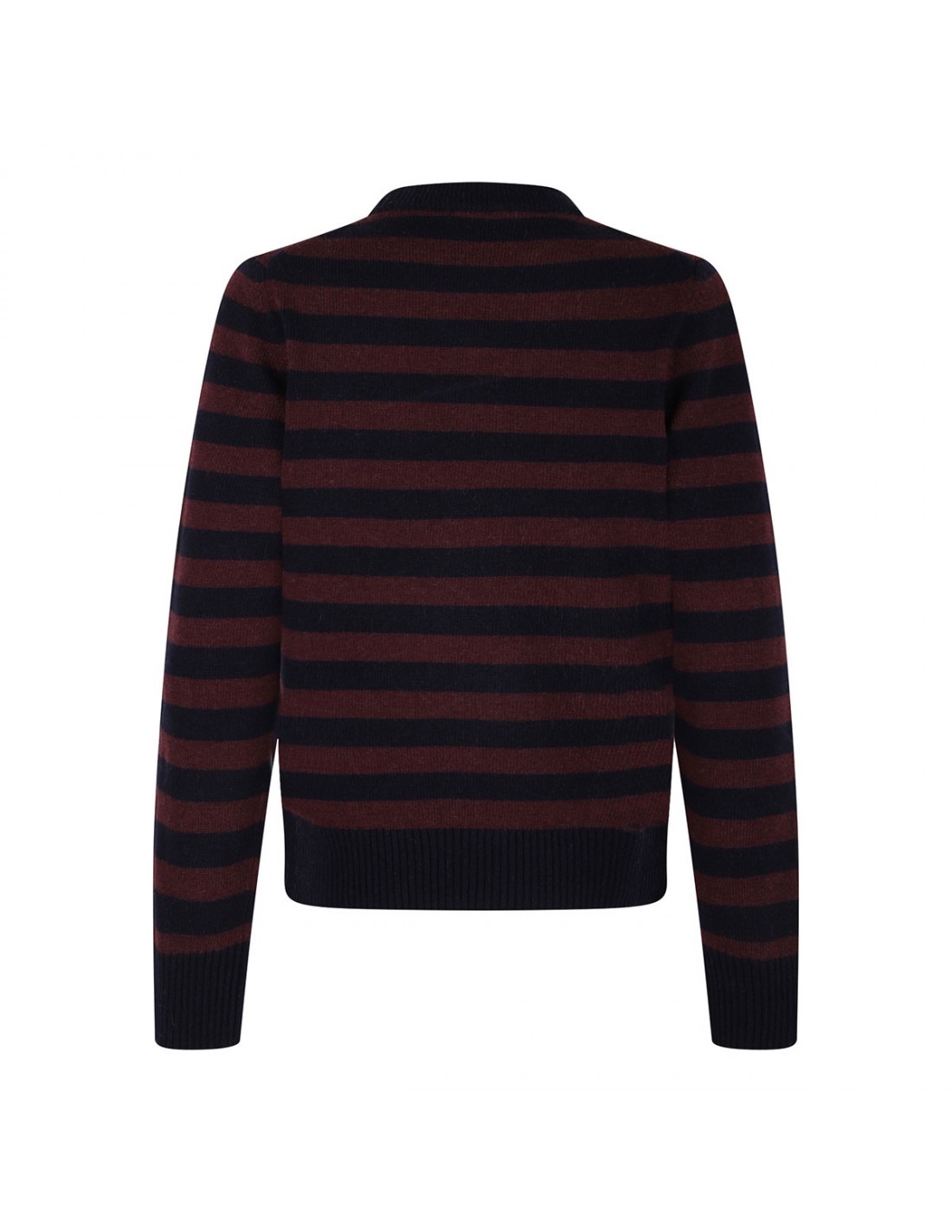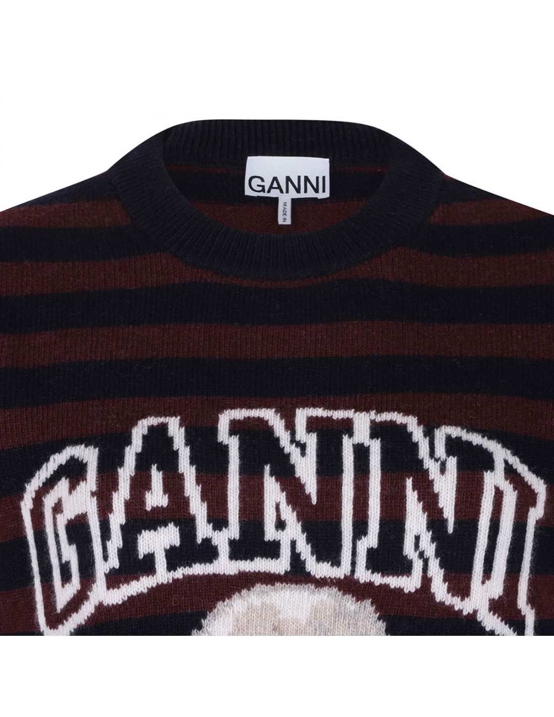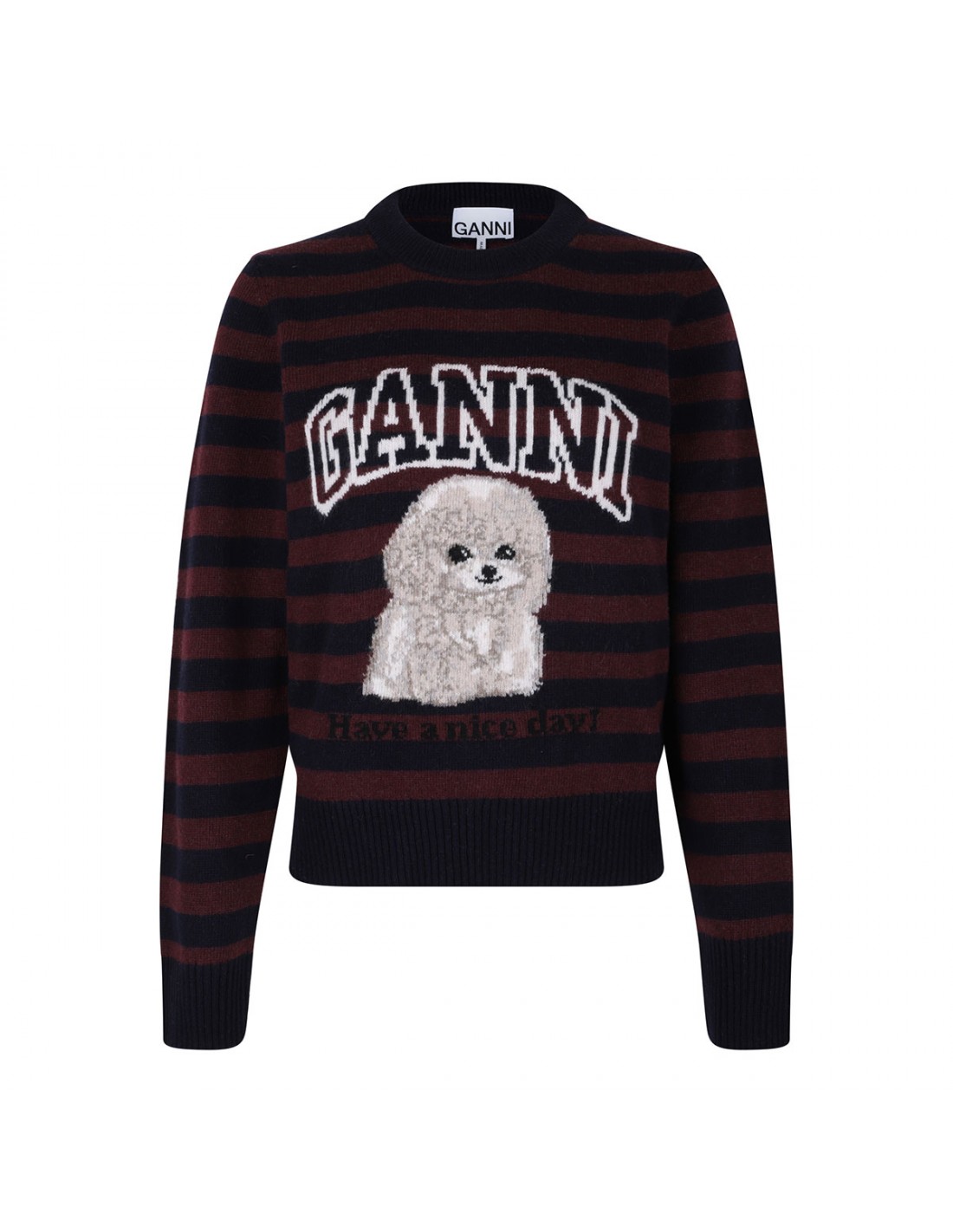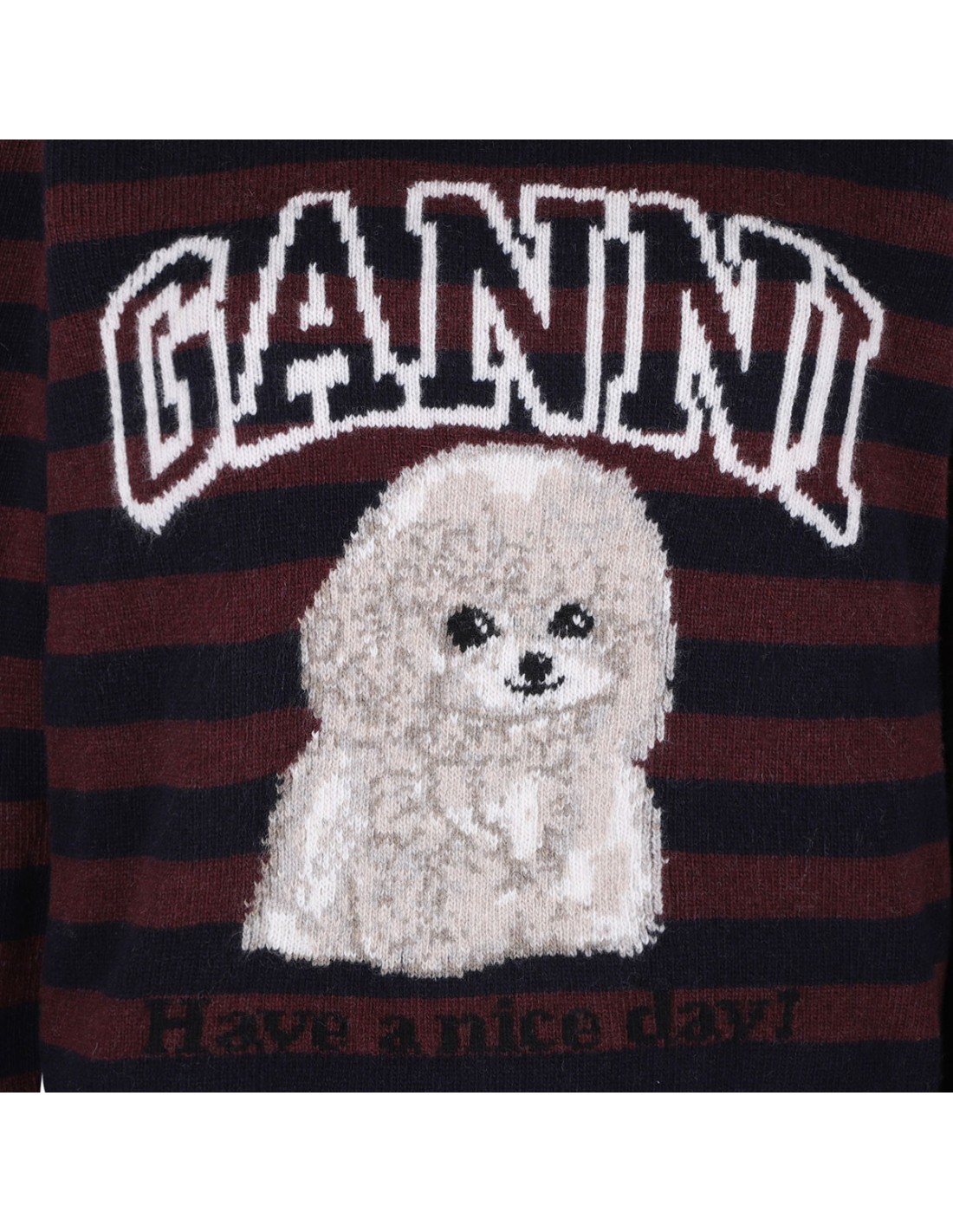 Multicolor wool blend from Ganni featuring 'Have a nice day! Please recycle!' message intarsia, striped motif, round neckline, Poodle graphic design, long sleeves, ribbed neckline, cuffs, and hem.