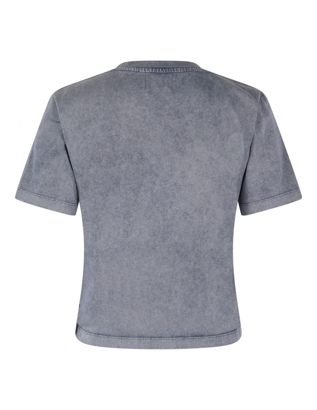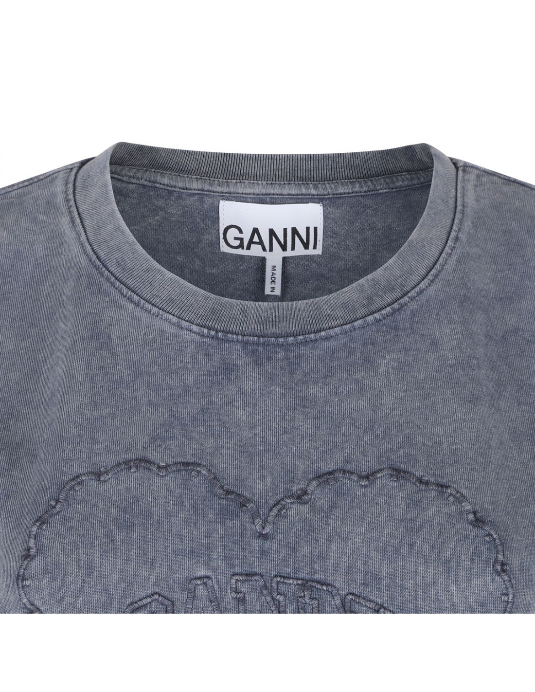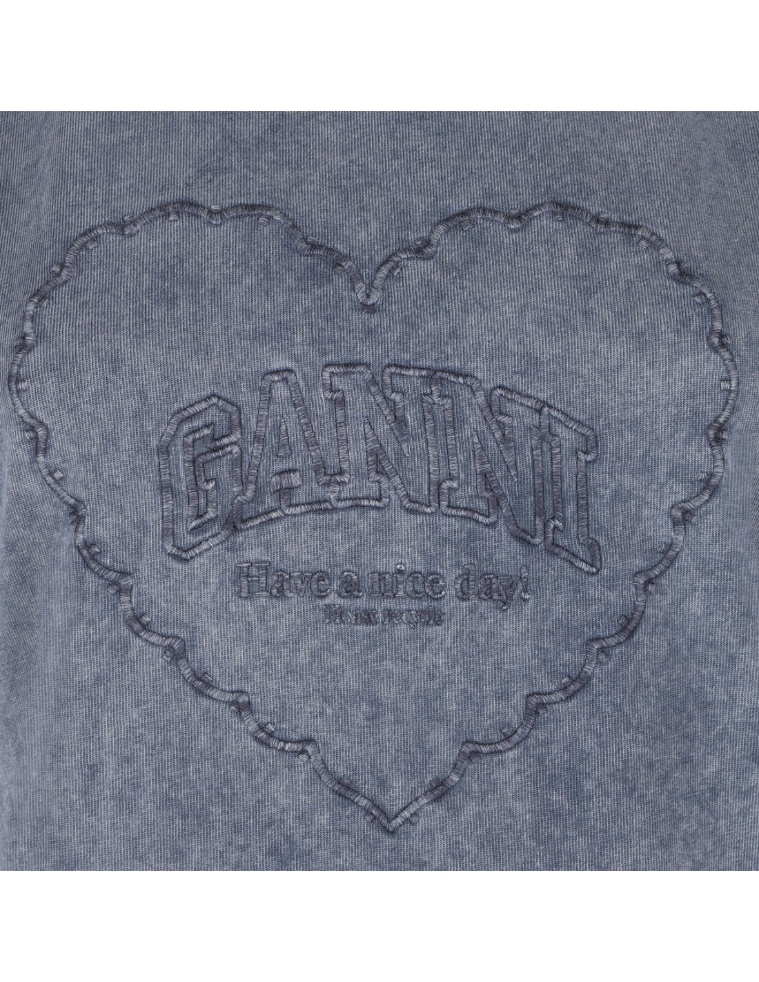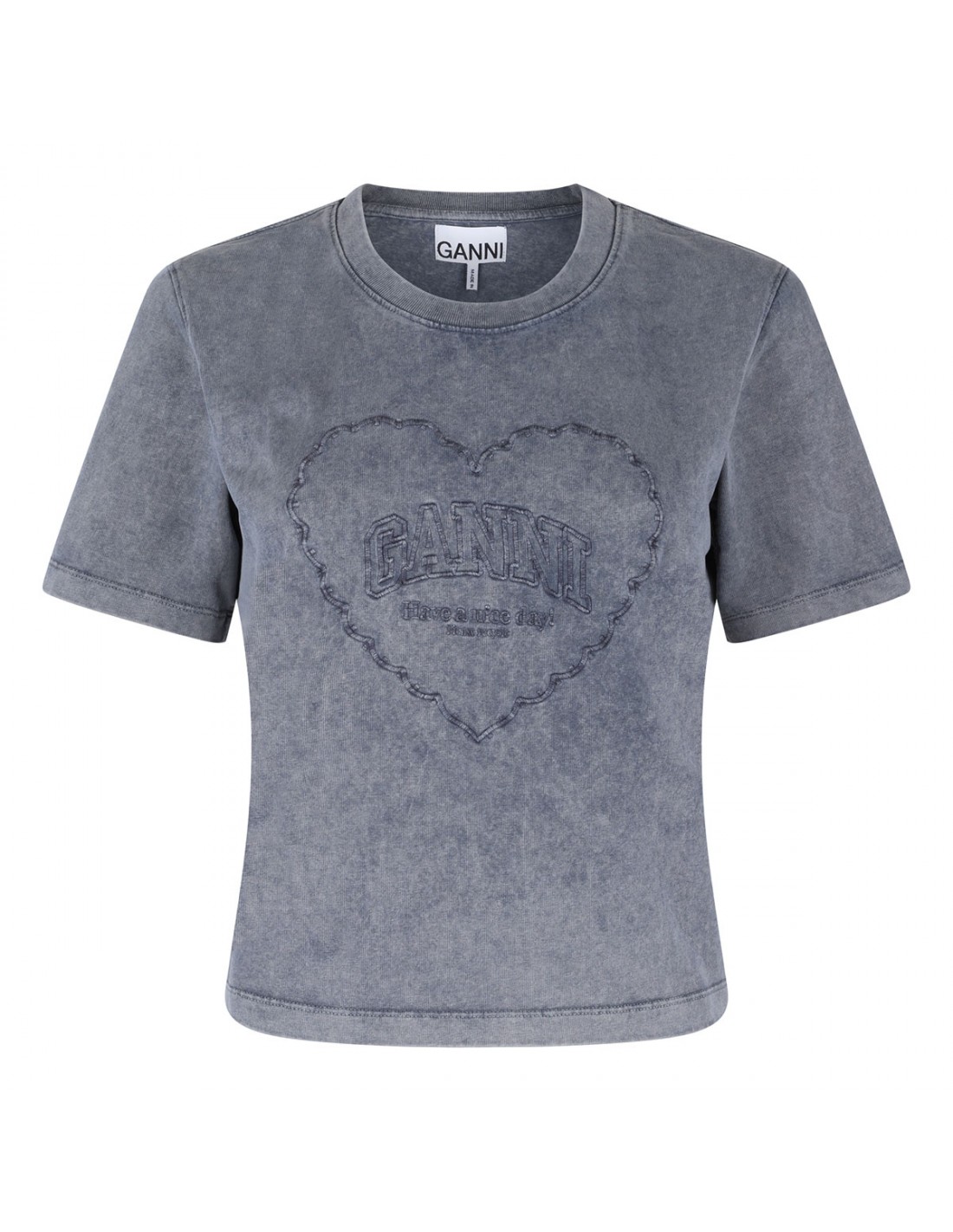 Gray organic cotton T-shirt from Ganni featuring washed texture, round neckline, short sleeves, embroidered heart and Ganni logo, 'Have a nice day! Please recycle' message.