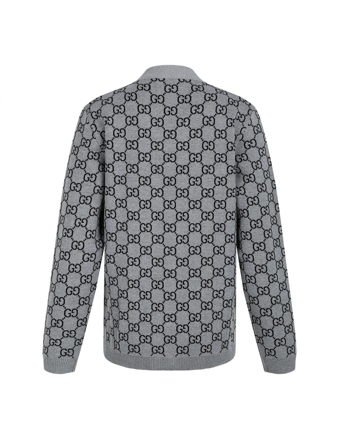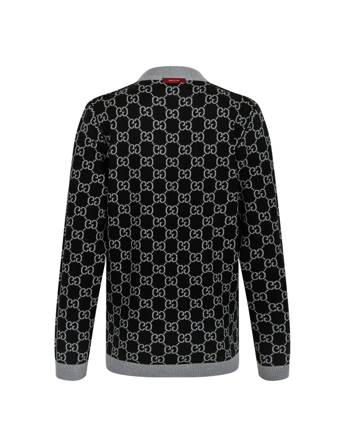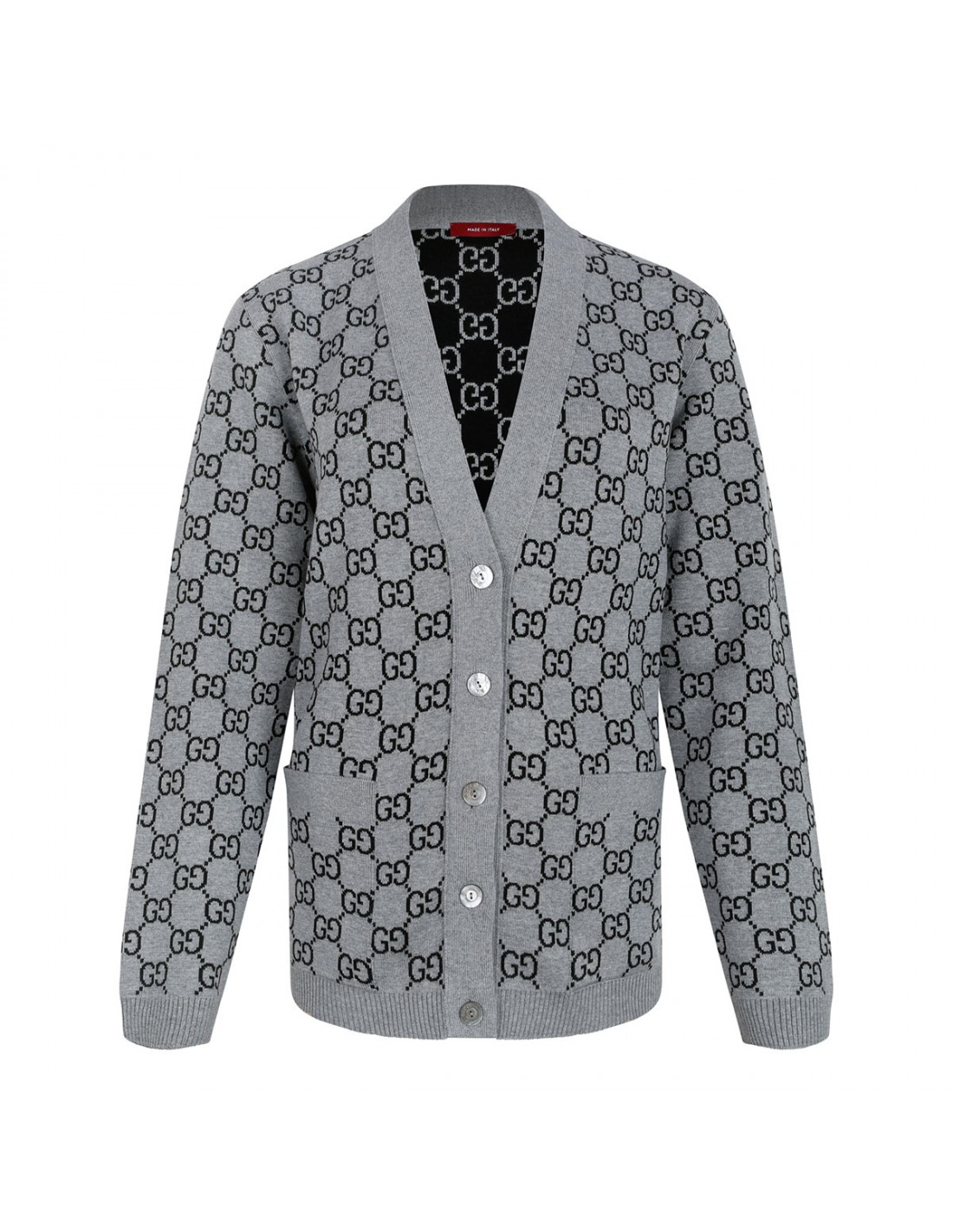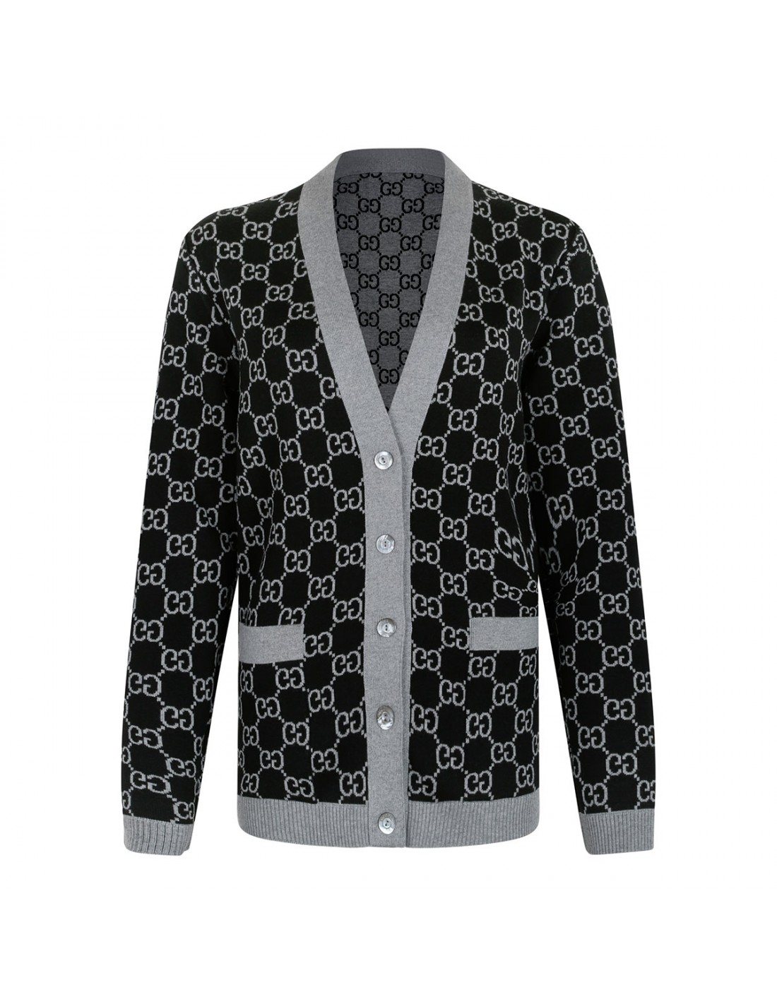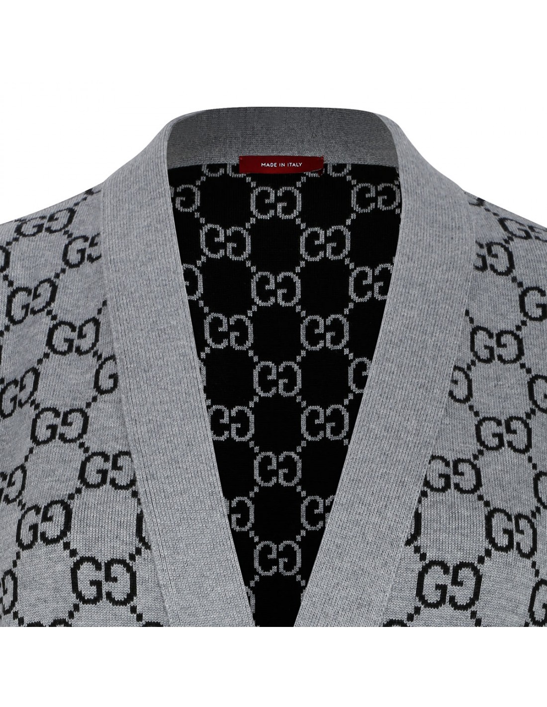 Reversible cardigan from Gucci featuring gray and black extra fine GG wool jacquard on one side, black and gray extra fine GG wool jacquard on other side, V-neck, dropped shoulders, long sleeves, button closure, regular fit, two front pockets, ribbed trims.