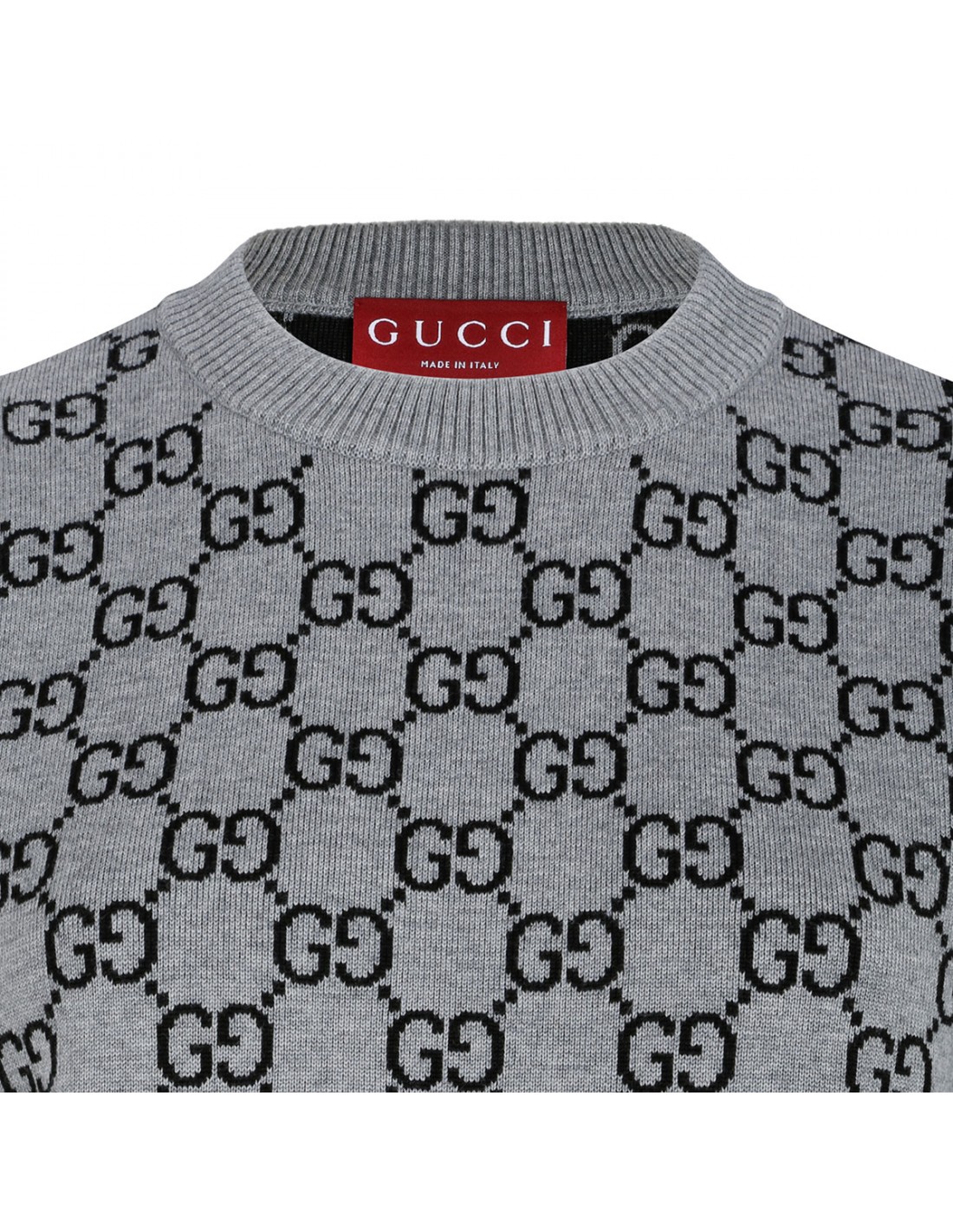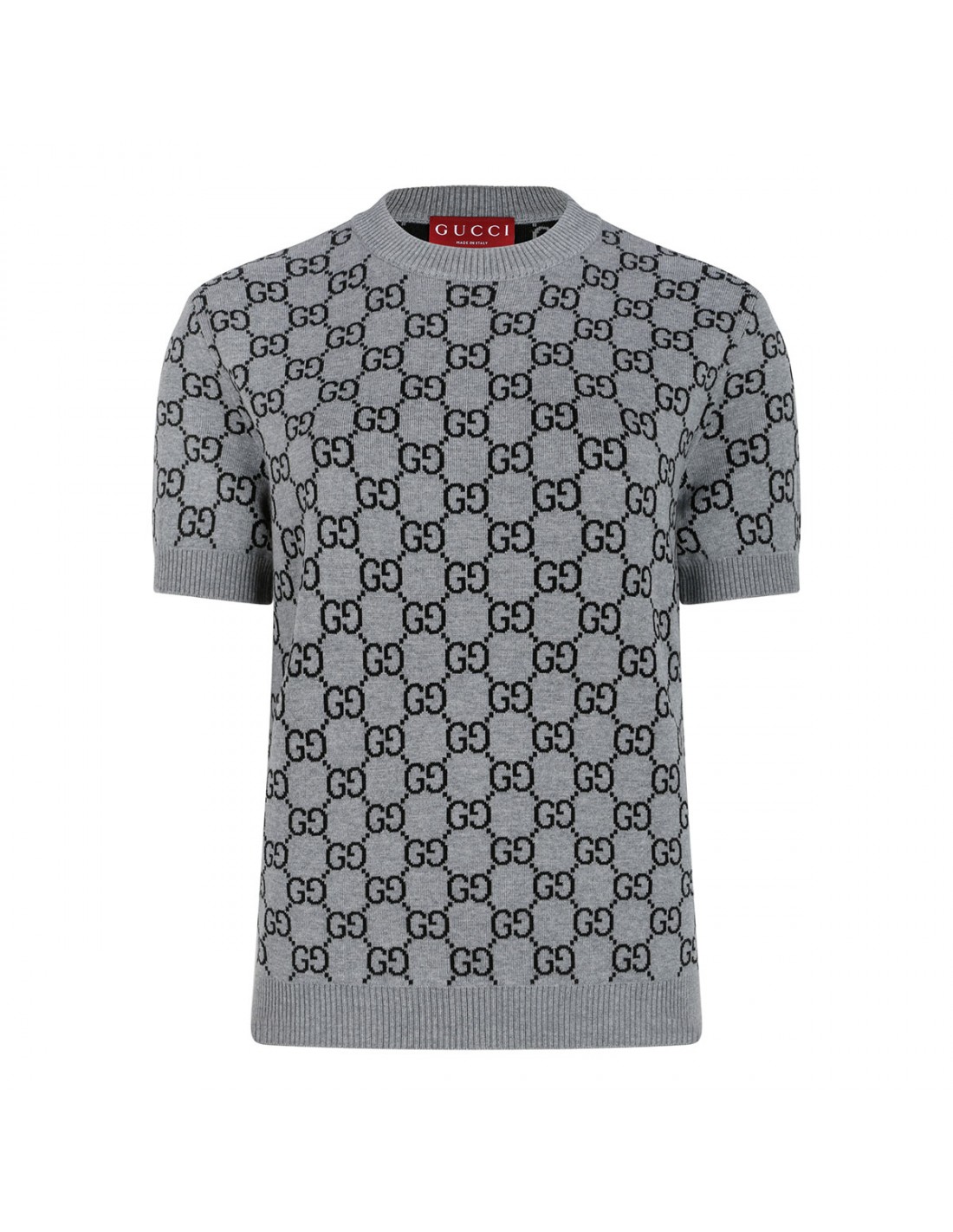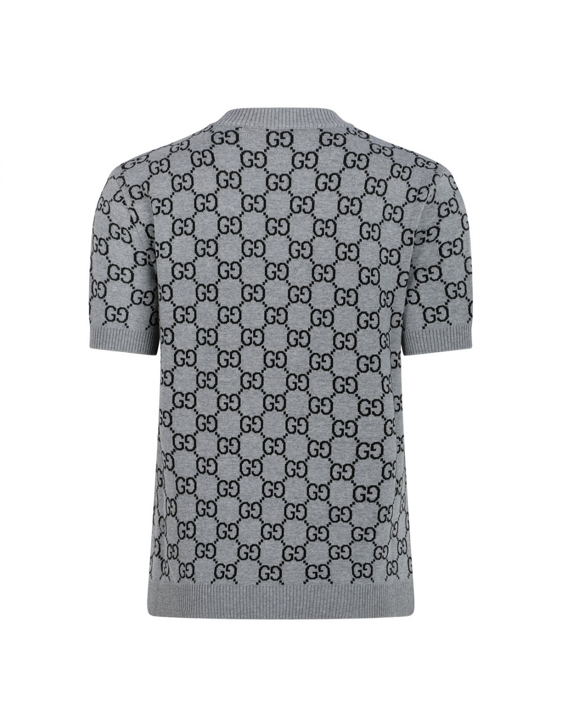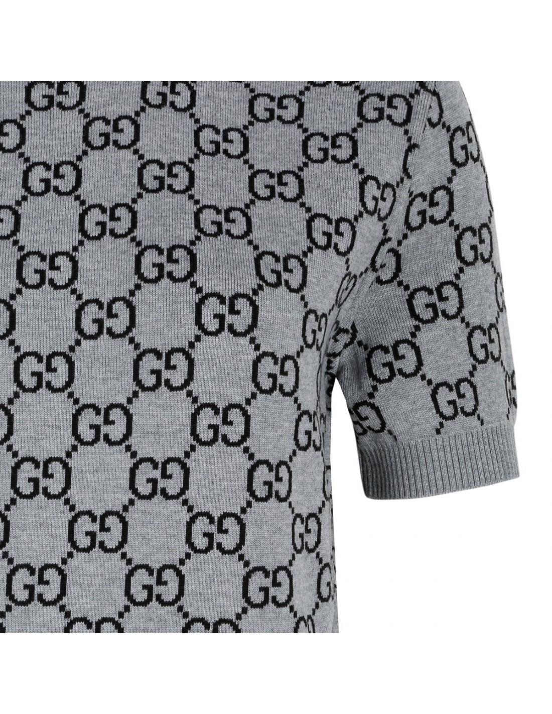 Reversible top from Gucci featuring gray and black extra fine GG wool jacquard on one side, black and gray extra fine GG wool jacquard on other side, crewneck, short sleeves, ribbed knit trim, slim fit.