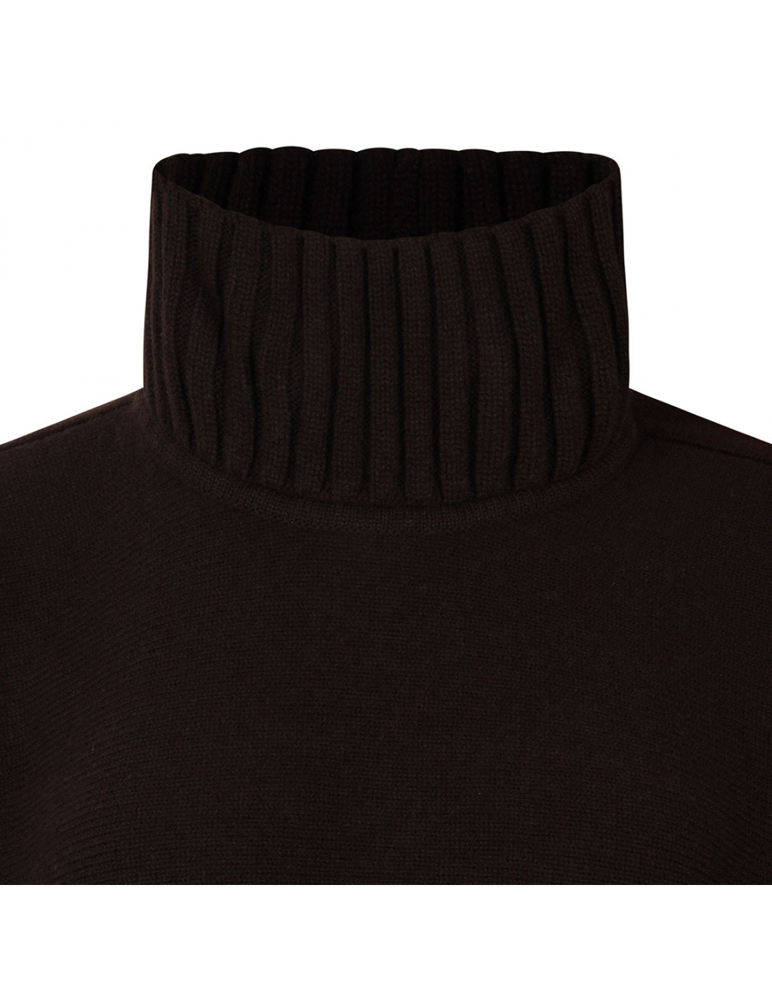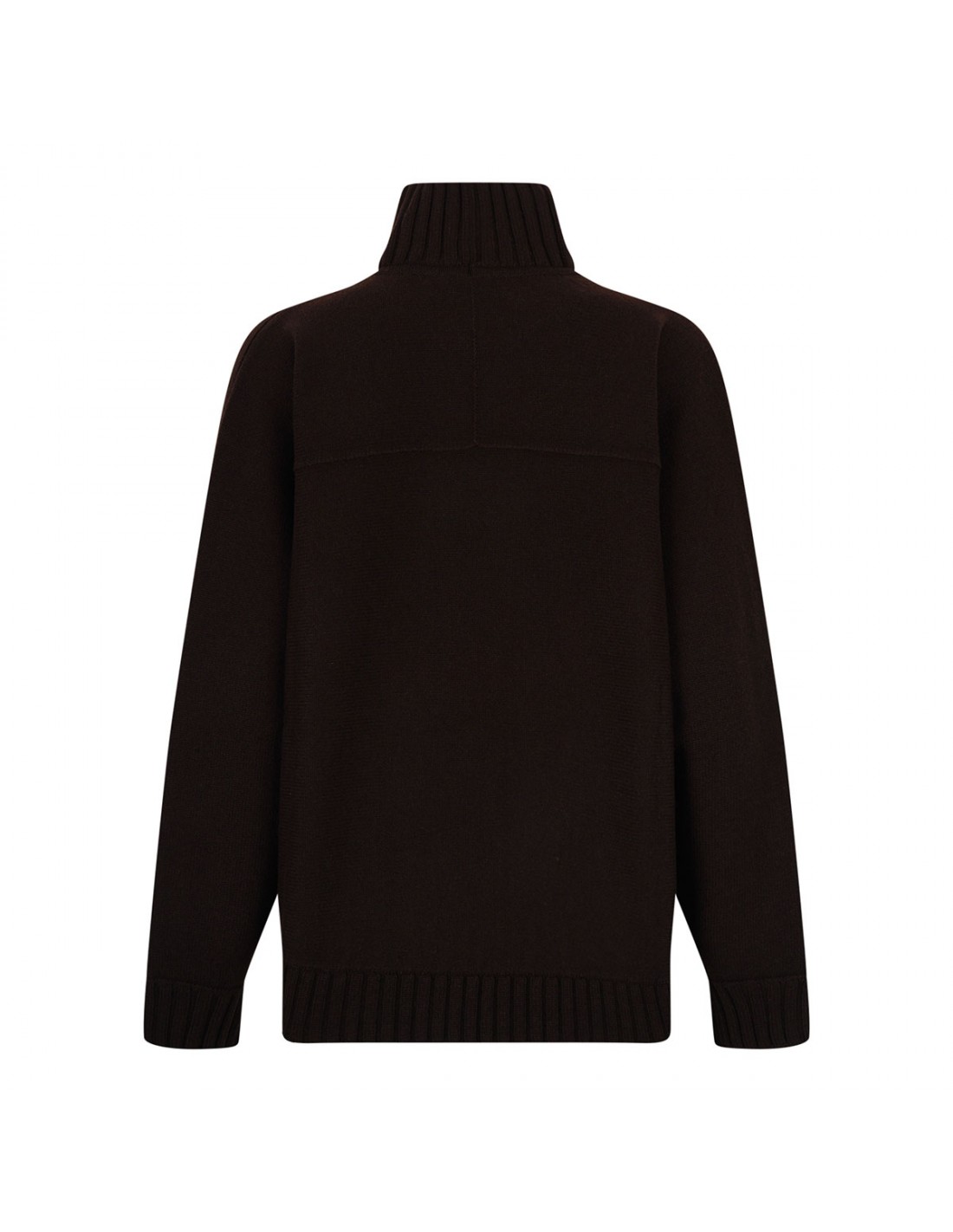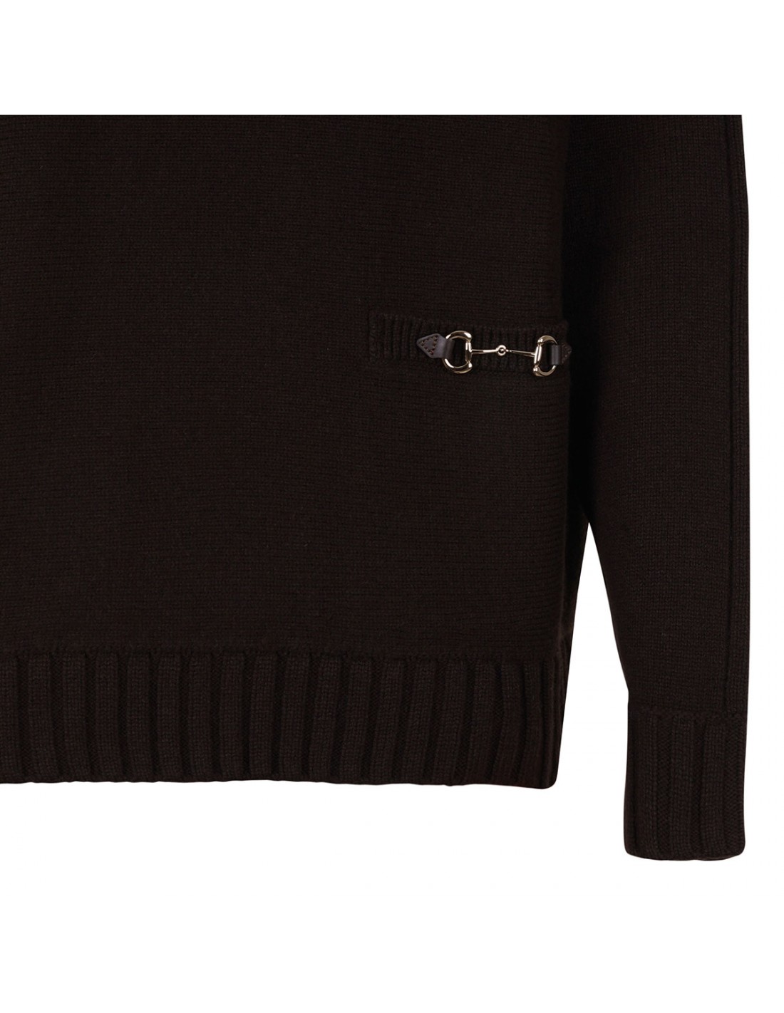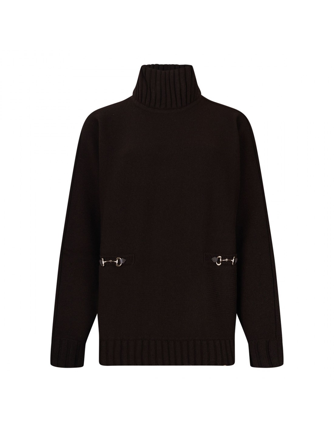 Dark brown wool cashmere sweater from Gucci featuring horsebit detail, wide turtleneck, dropped shoulders, two front pockets, long sleeves, wide ribbed-knit trims.