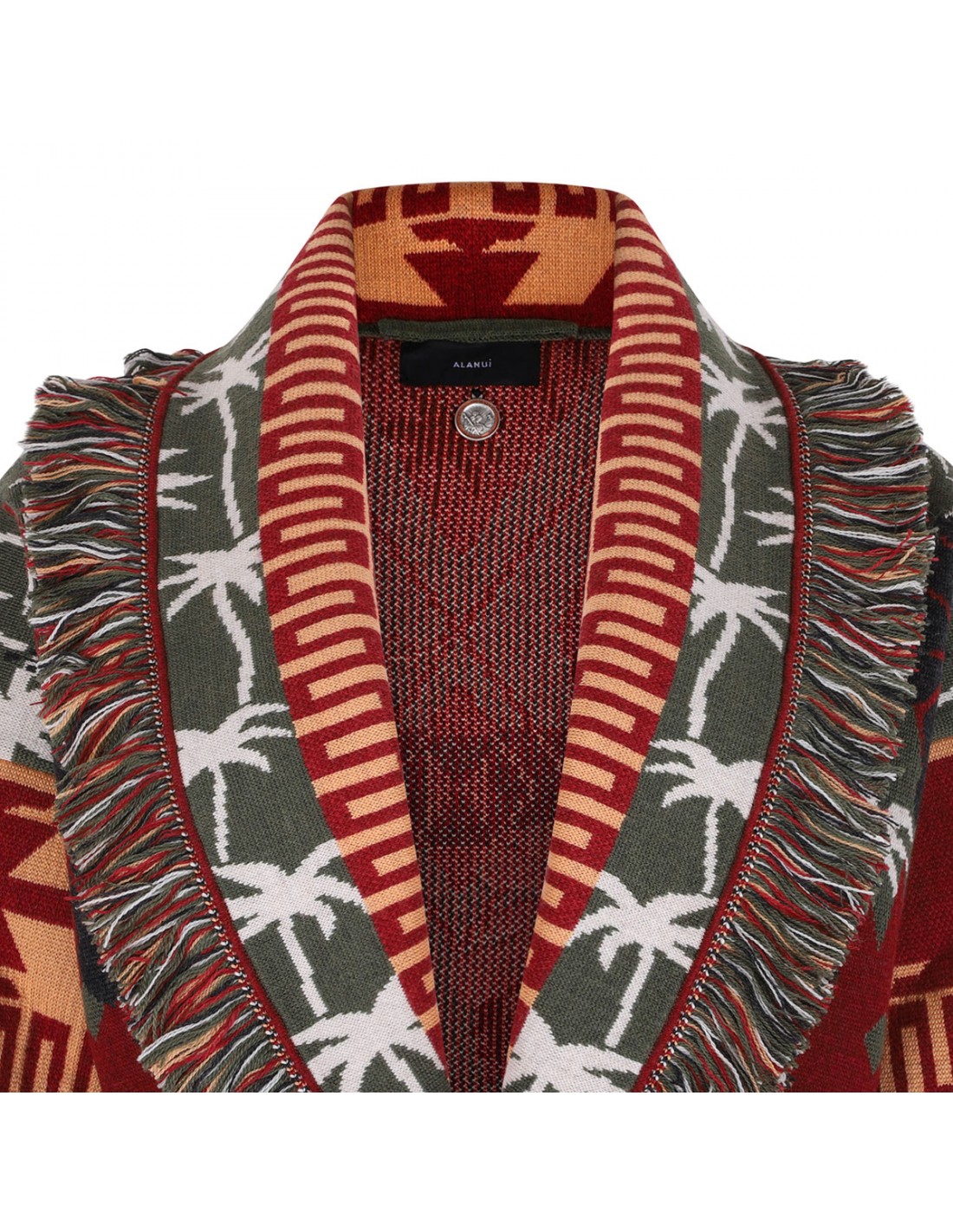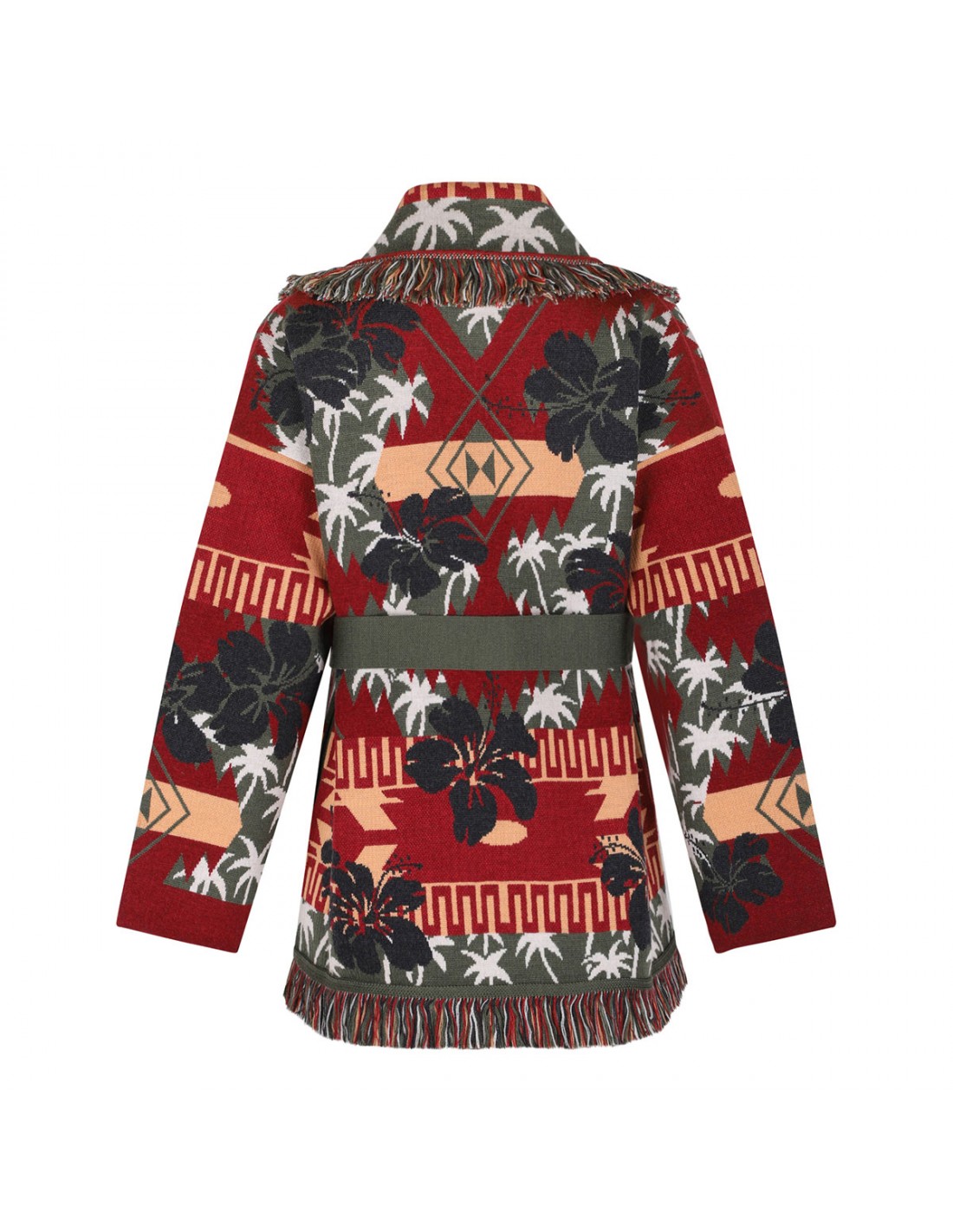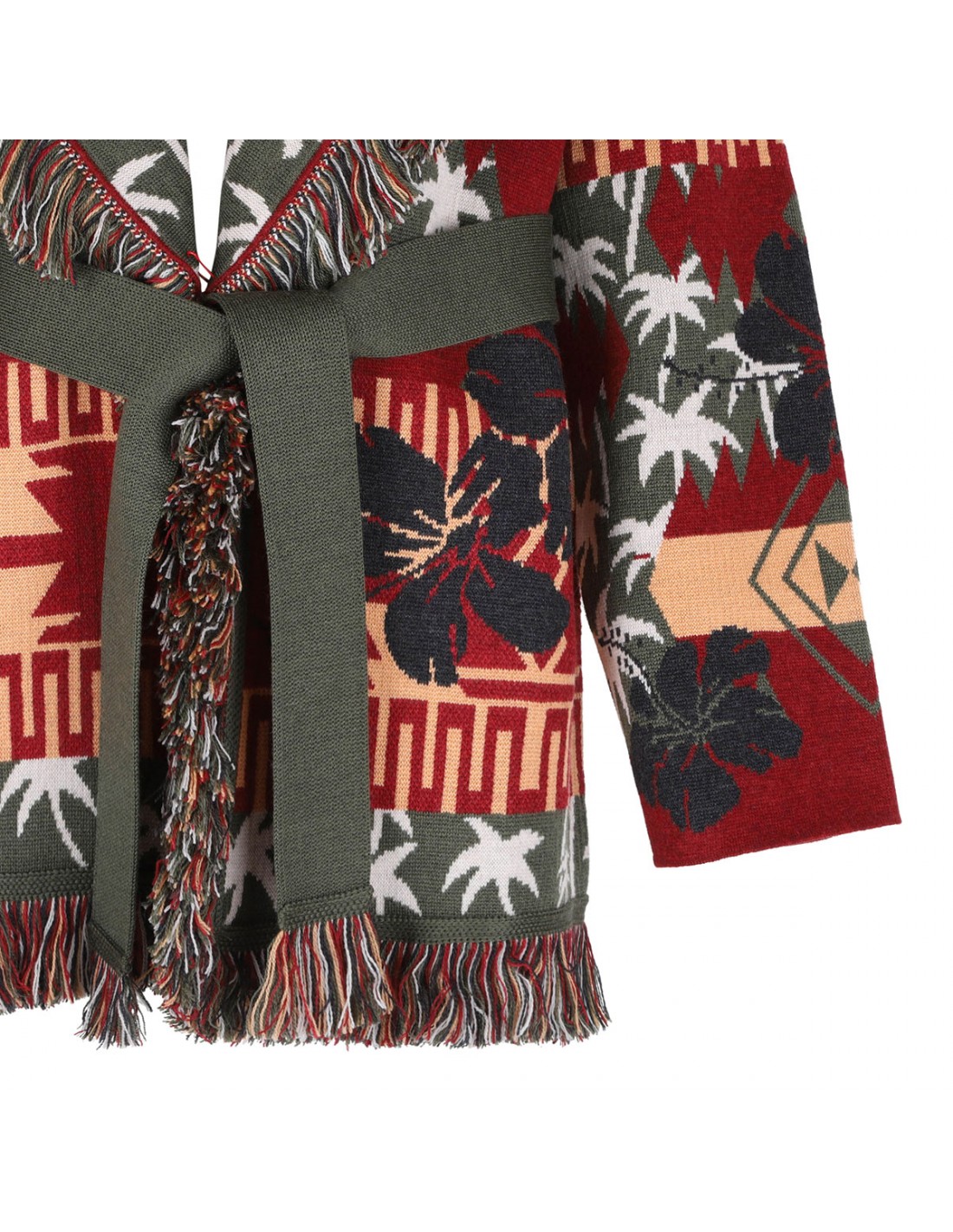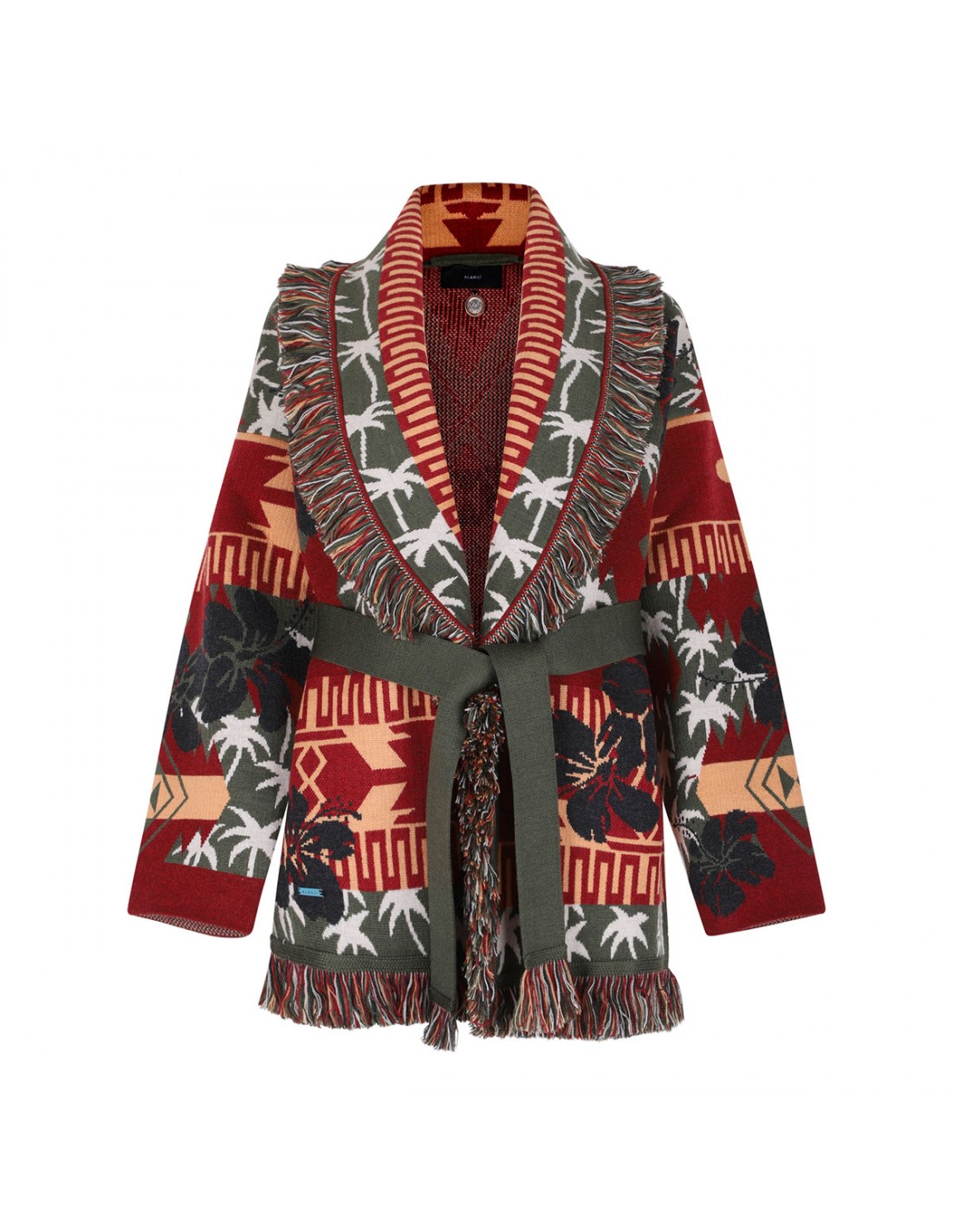 Ruby-hue and multicolor virgin wool Hibiscus Bloom cardigan from Alanui featuring all-over palm motif and Hibiscus bloom double jacquard knit, Icon fit, two-tone self-tie belt, multicolor fringed edges, shawl collar, long sleeves, dropped shoulders.