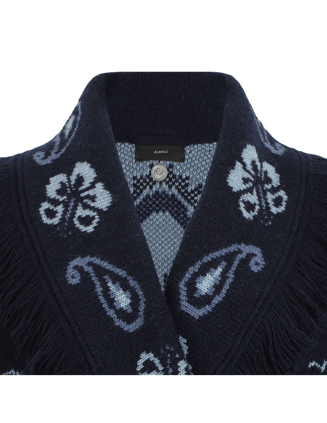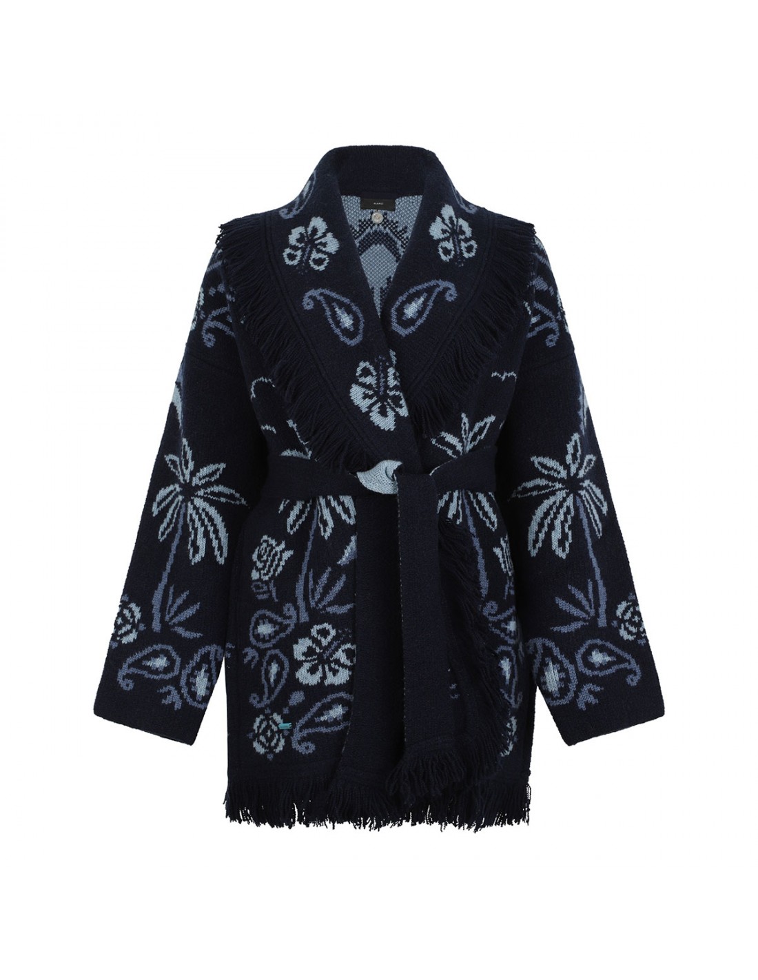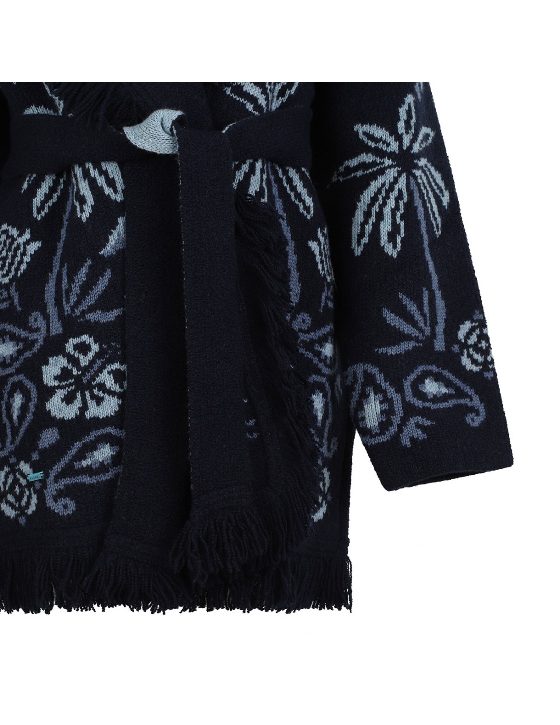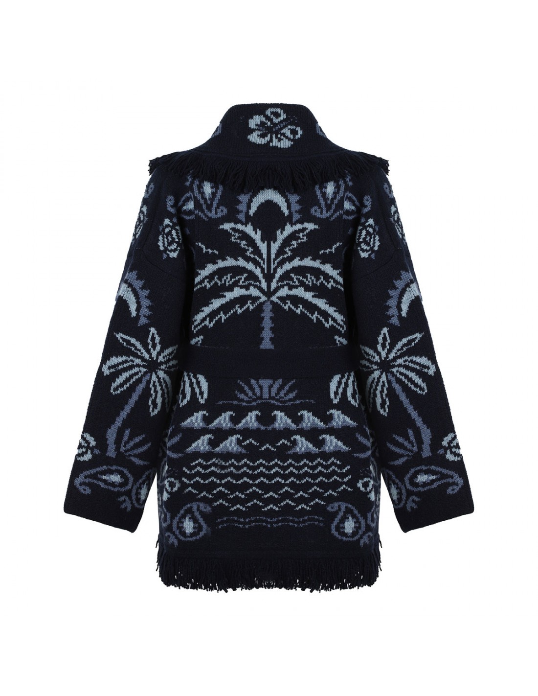 Blue and midnight blue cashmere, wool and cotton blend Icon cardigan from Alanui featuring palms, ocean waves and hibiscus flowers jacquard knit, two-tone self-tie belt at waist, tonal fringed edges, dropped shoulders, long sleeves, shawl collar.