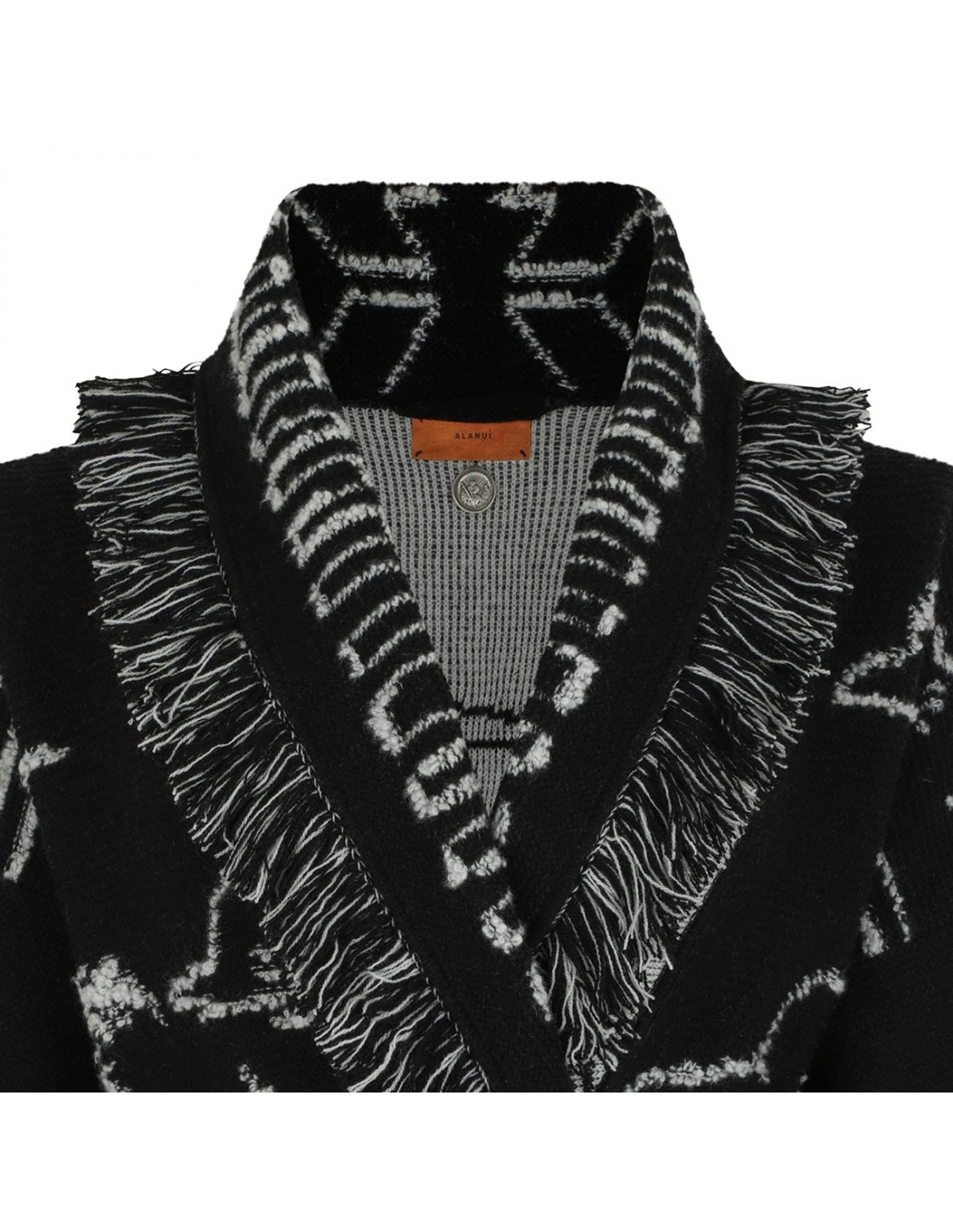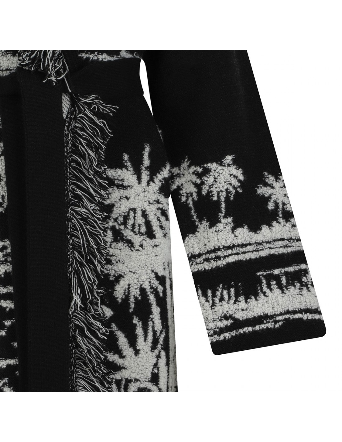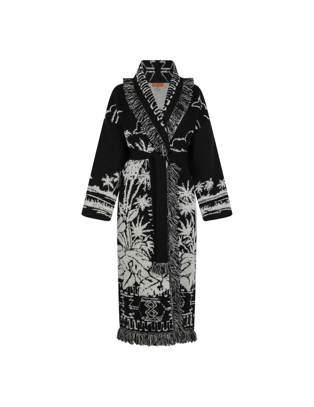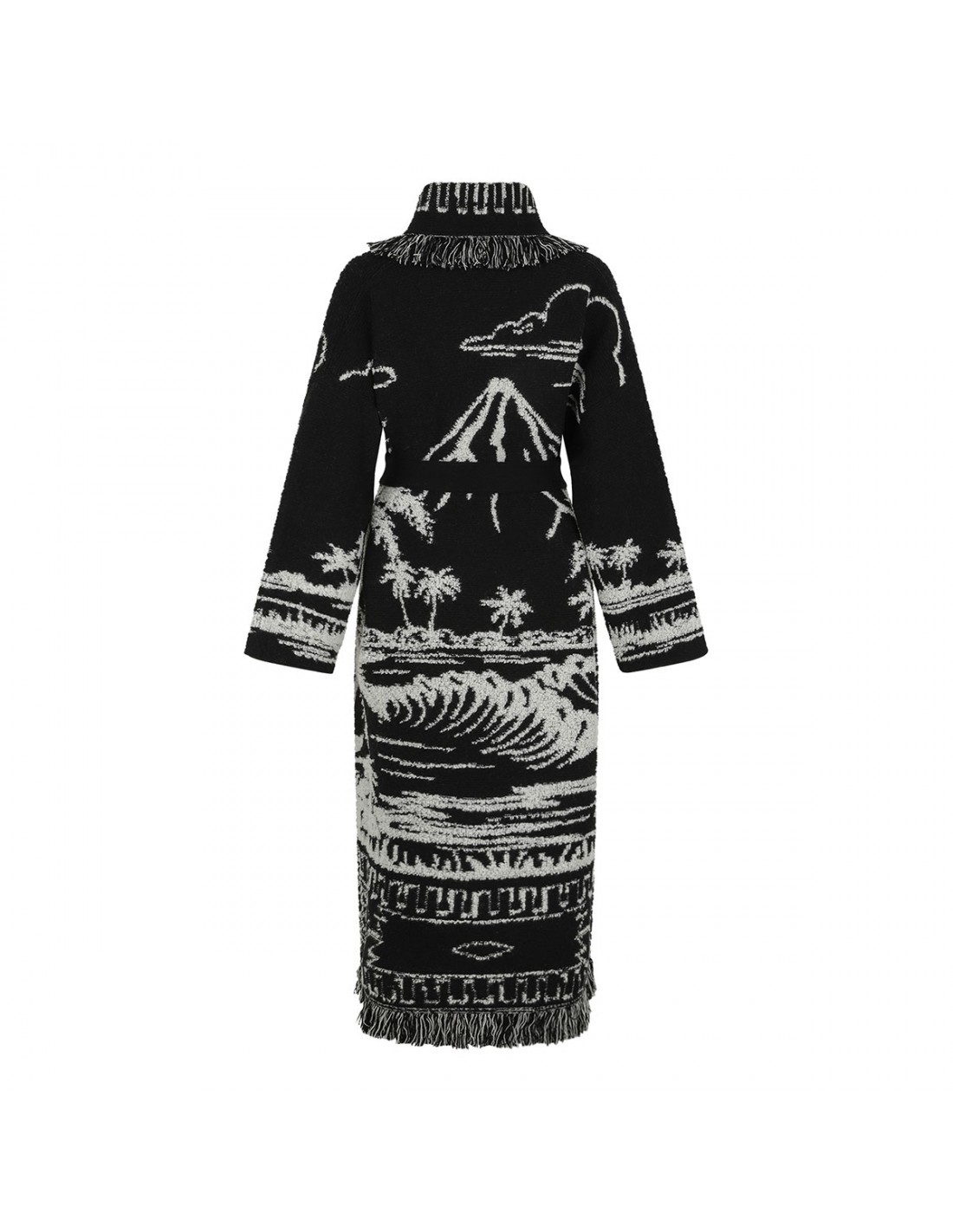 Black and ivory recycled cashmere and wool blend Palm Grove Tales coat from Alanui featuring 3D double jacquard knit, postcard-perfect Hawaiian volcano motif, Icon coat fit, self-tie matching belt, fringed edges, dropped shoulders, shawl collar.