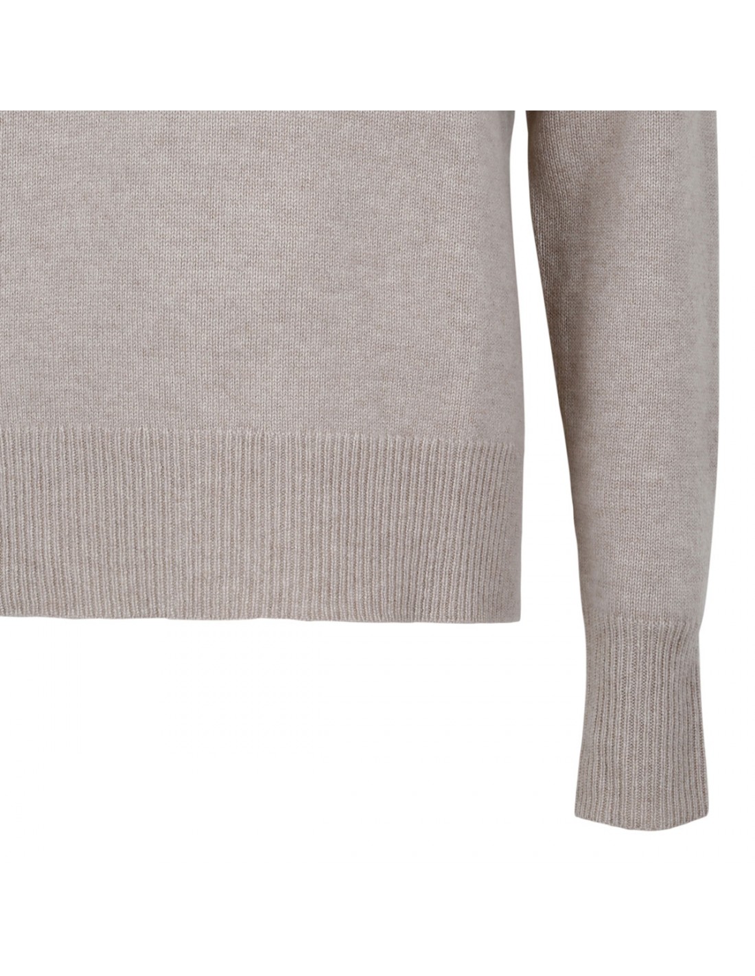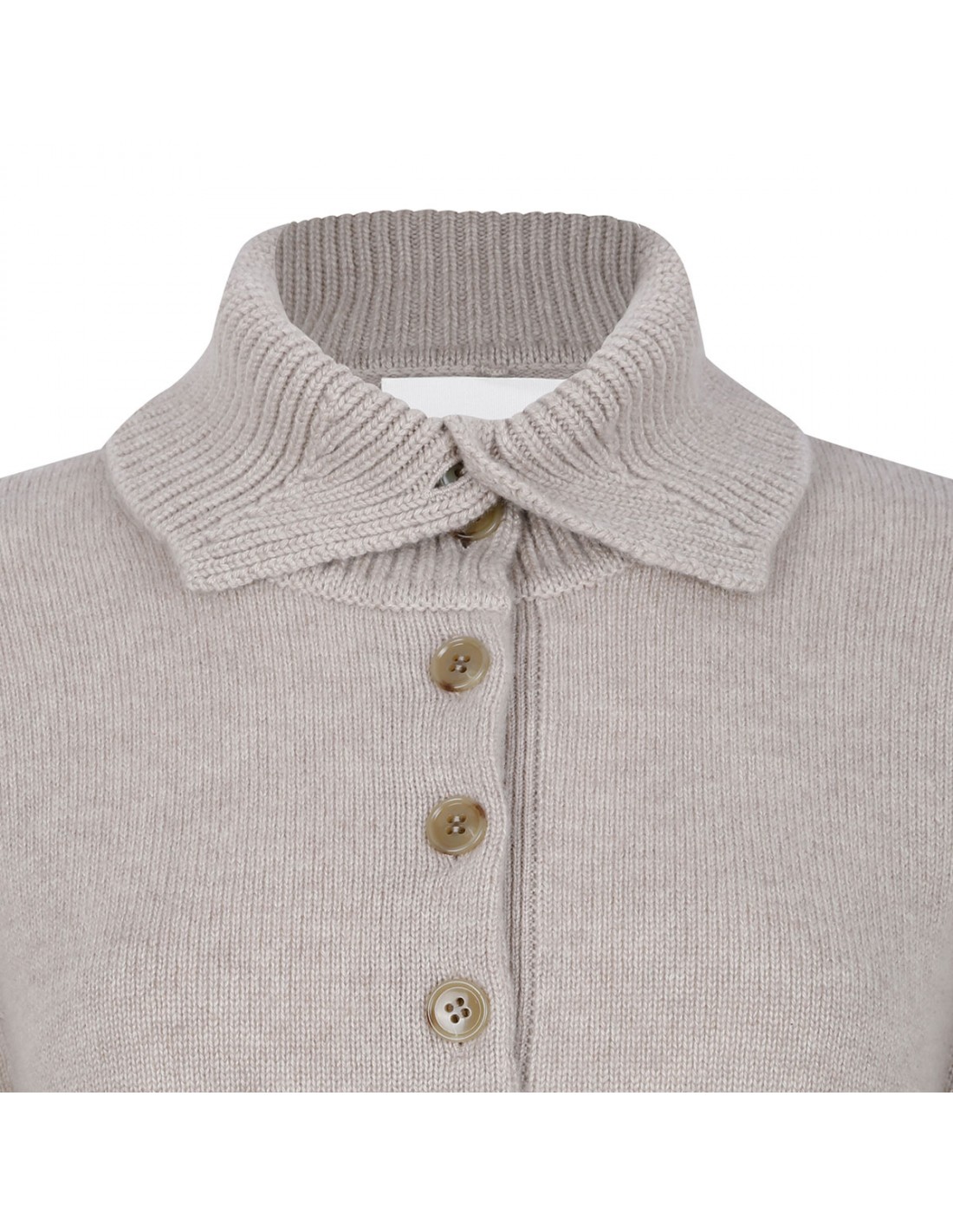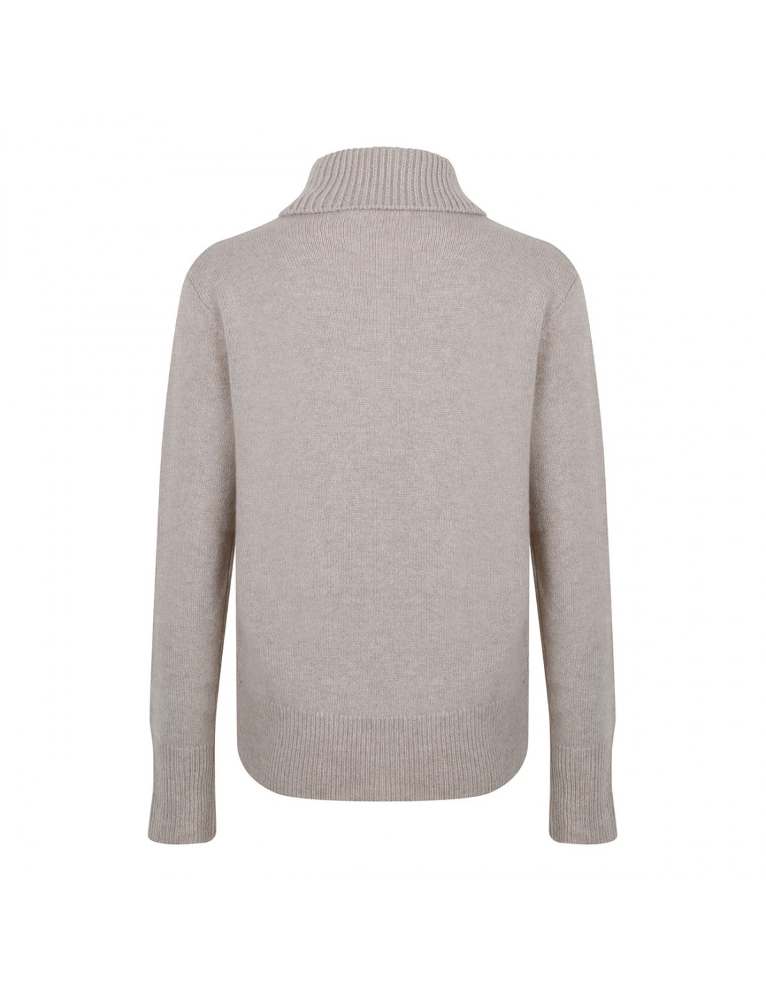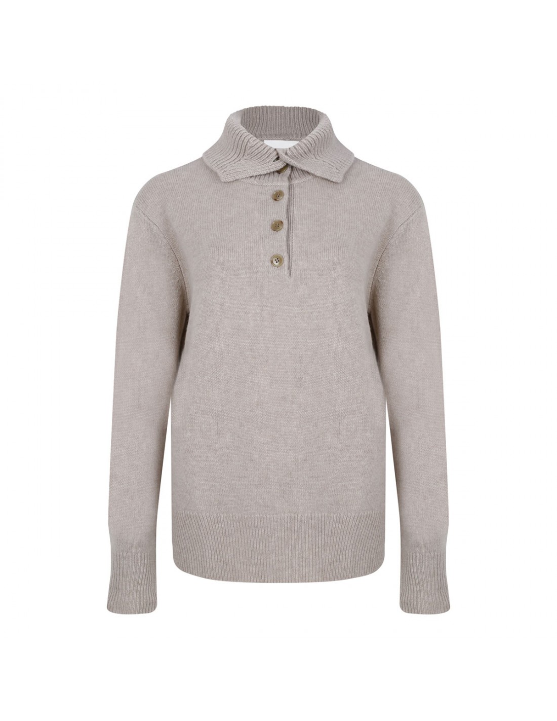 Sand knitted cashmere Maisie sweater from Lisa Yang featuring turtleneck shawl ribbed collar, button placket, long sleeves, regular fit, hip length, ribbed-knit edges.