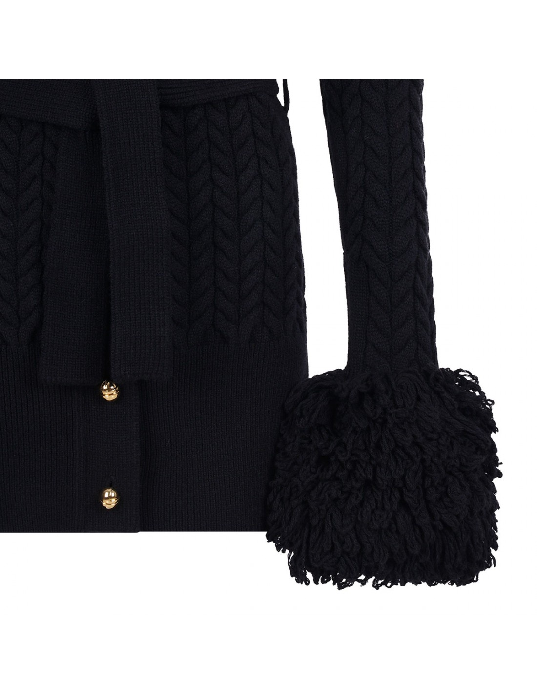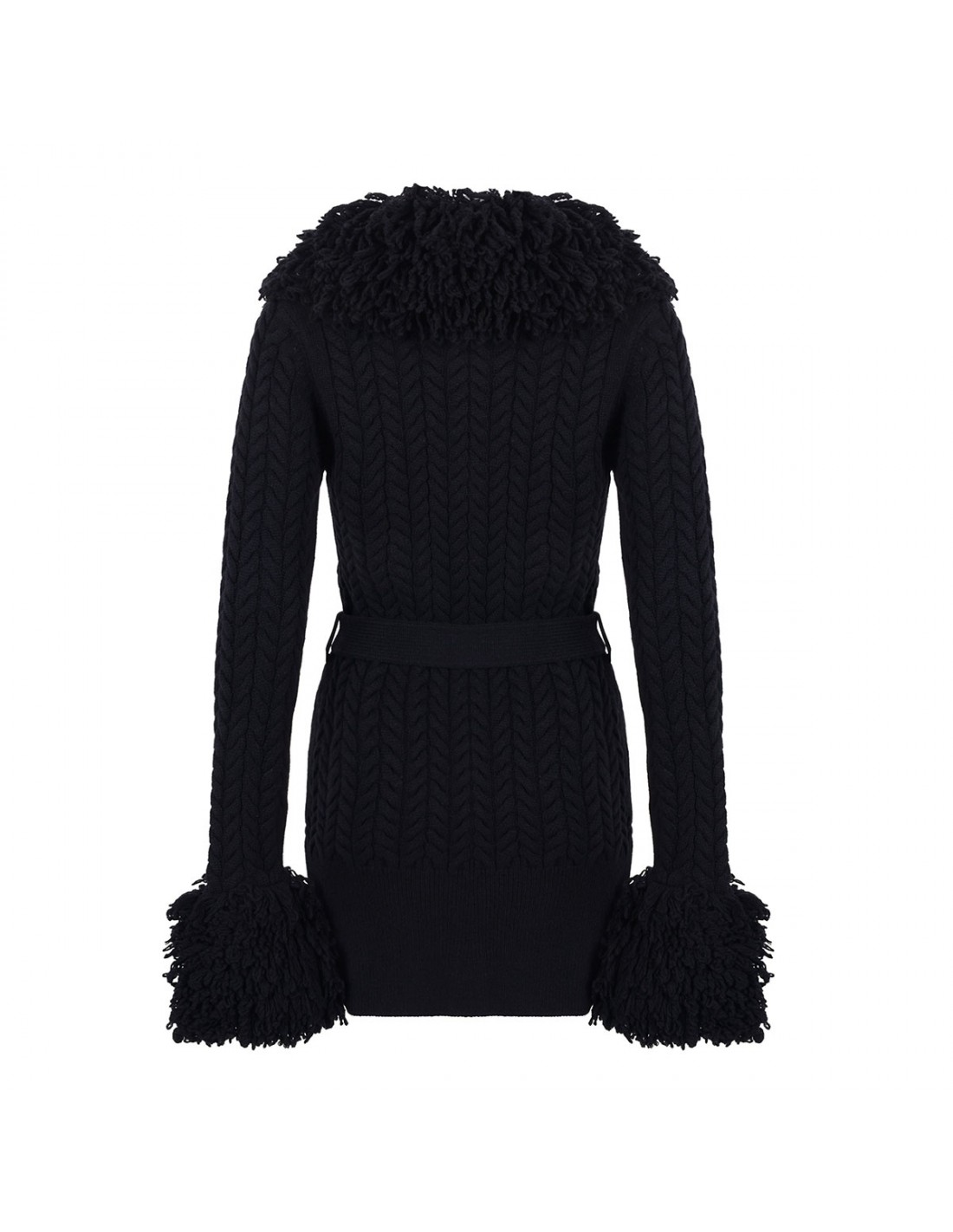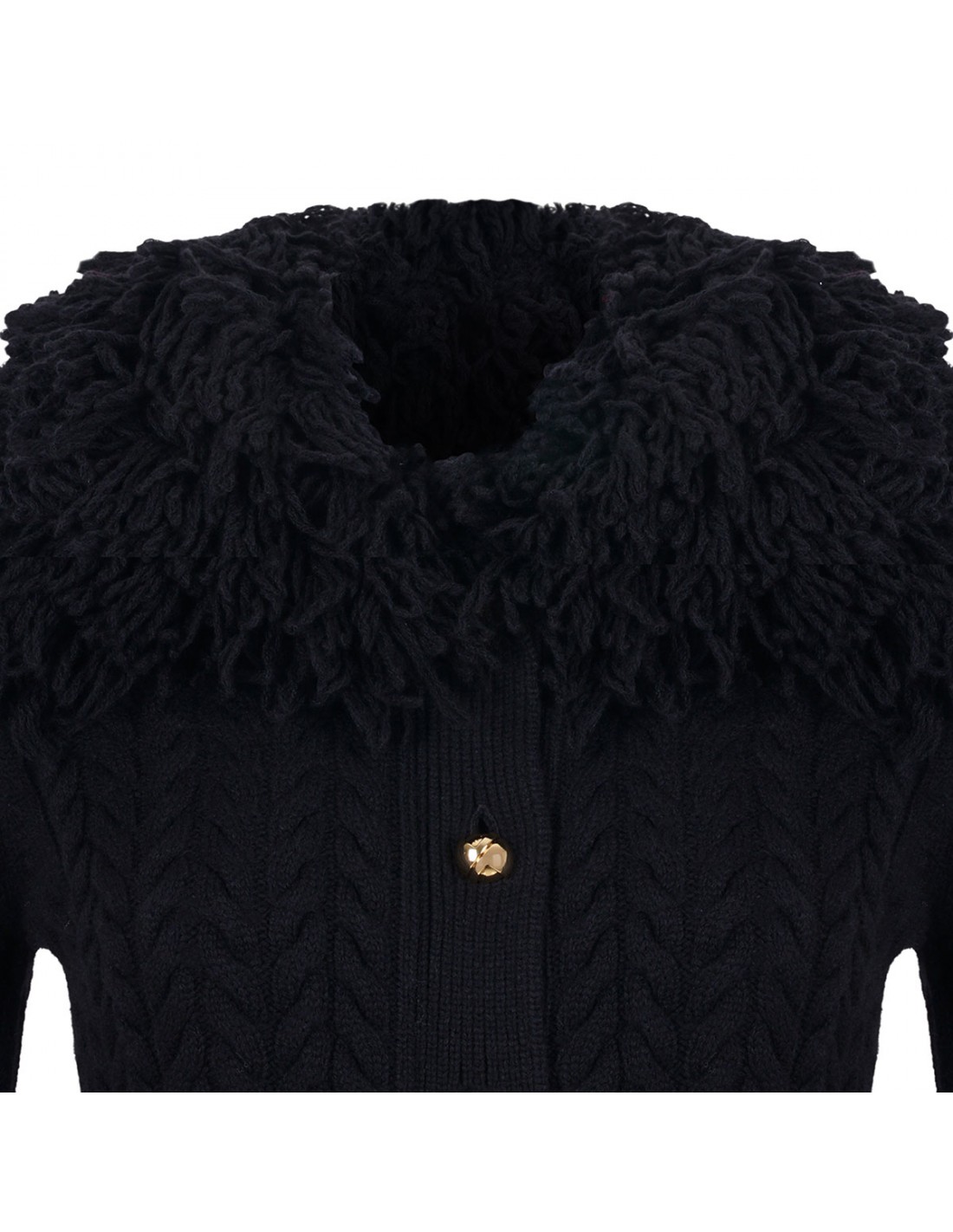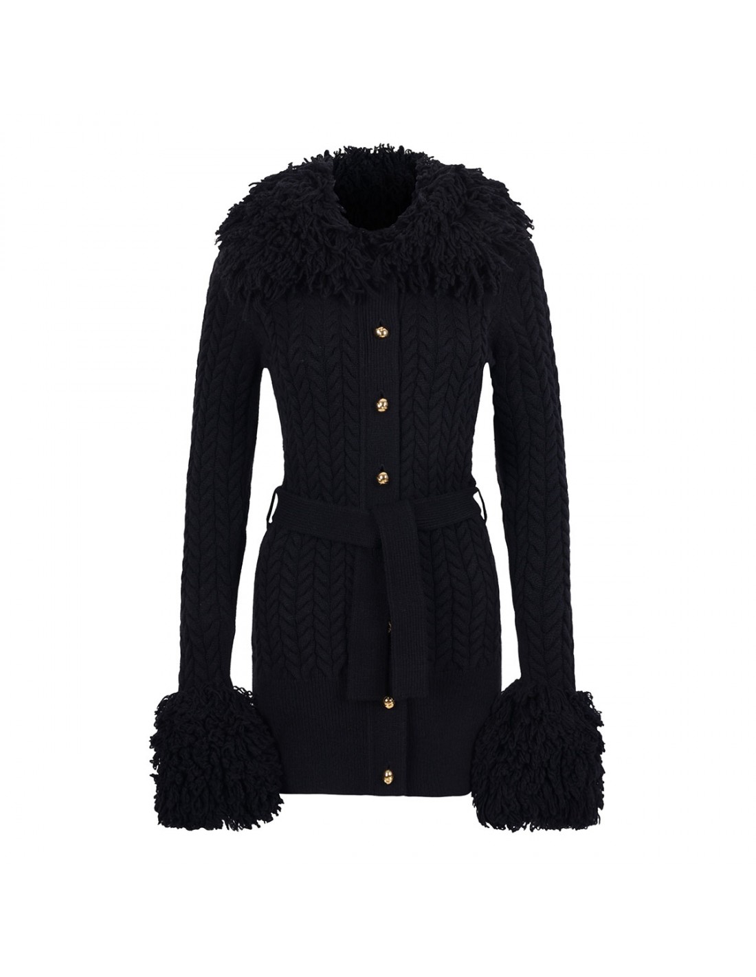 Black cable knit merino wool and cashmere cardigan from Patou featuring longline silhouette, fur-effect fringed collar and cuffs, wide collar, silver tone half-sphere JP button fastening, detachable self-tie belt at waist, ribbed-knit hem.
