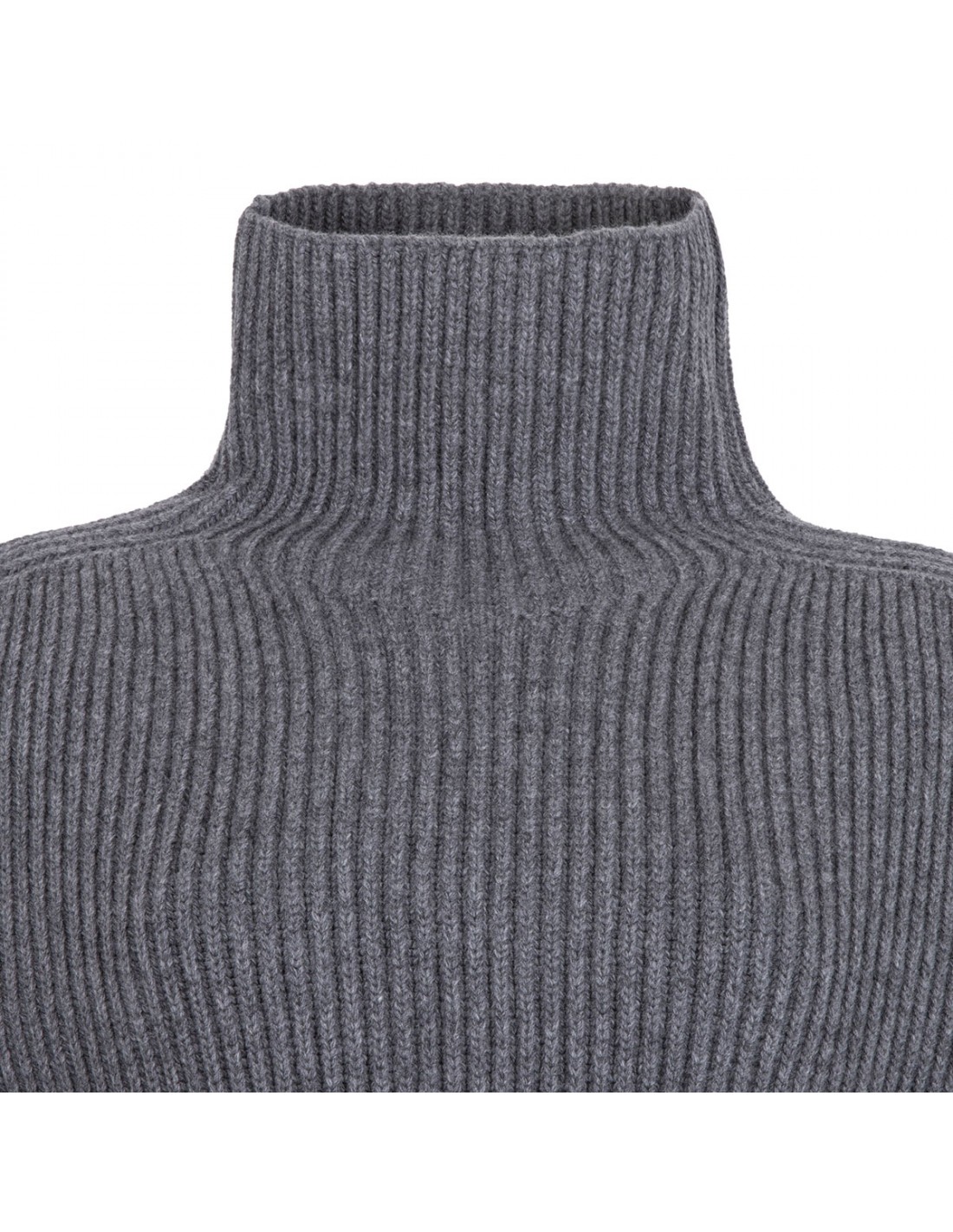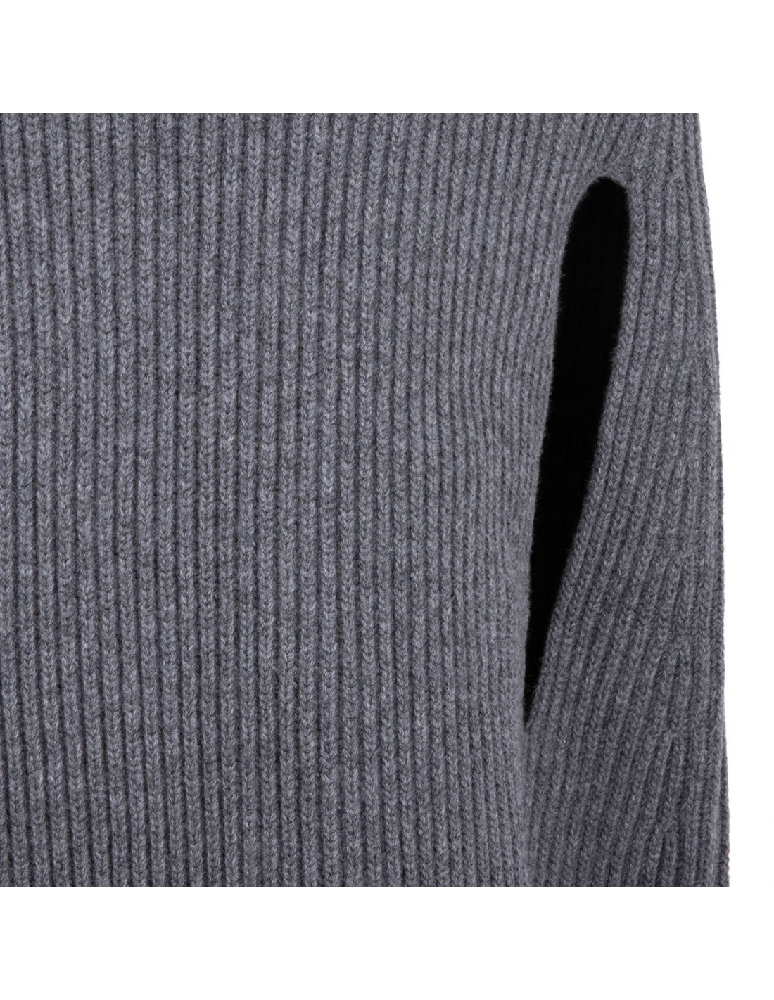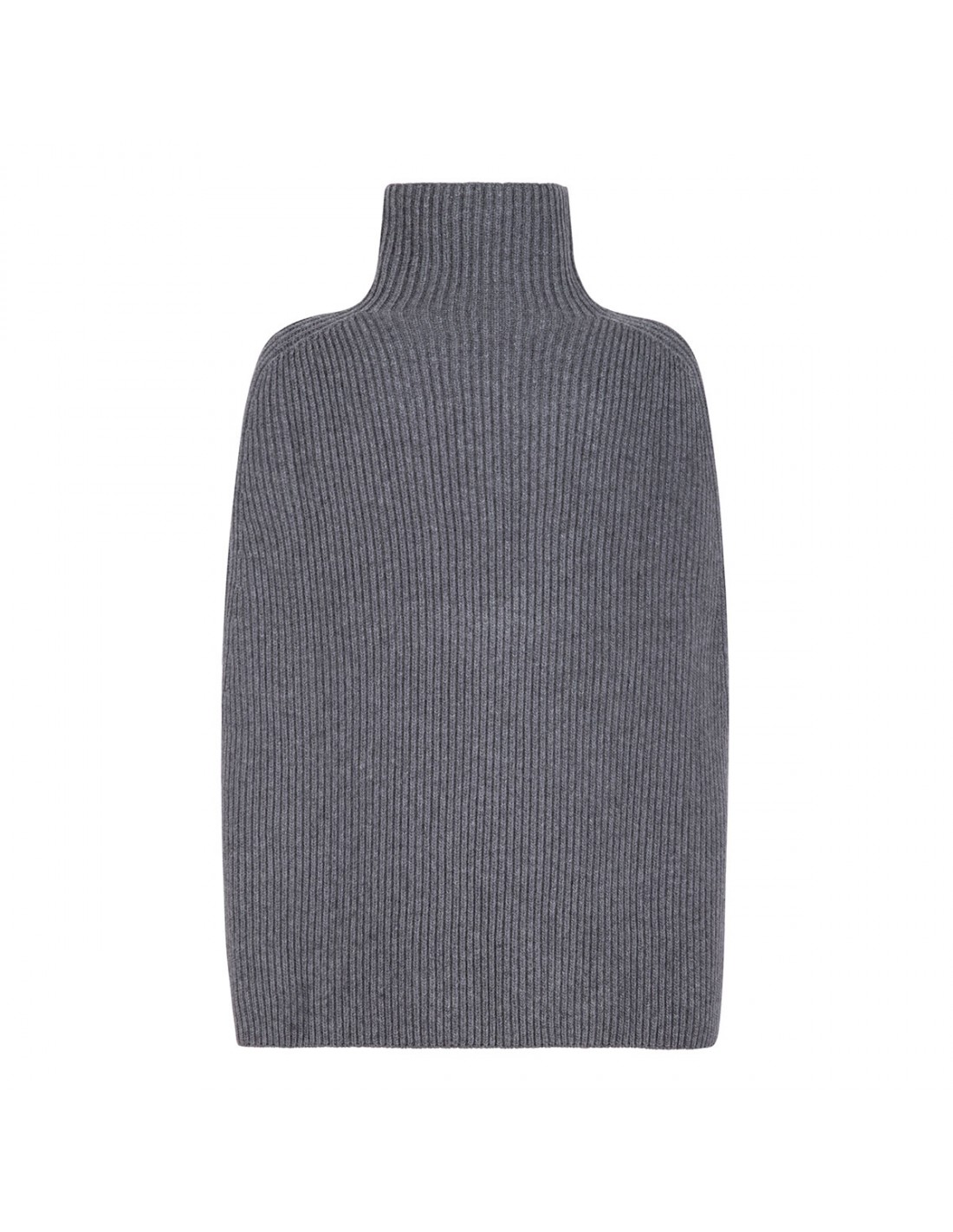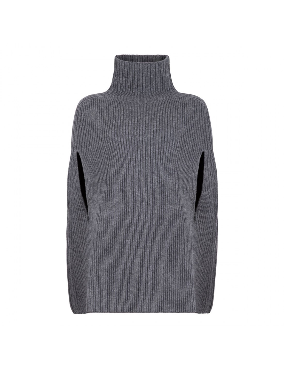 Gray rib knit wool cape sweater from Jil Sander featuring high neck, armhole slits, oversized silhouette, dropped shoulders.