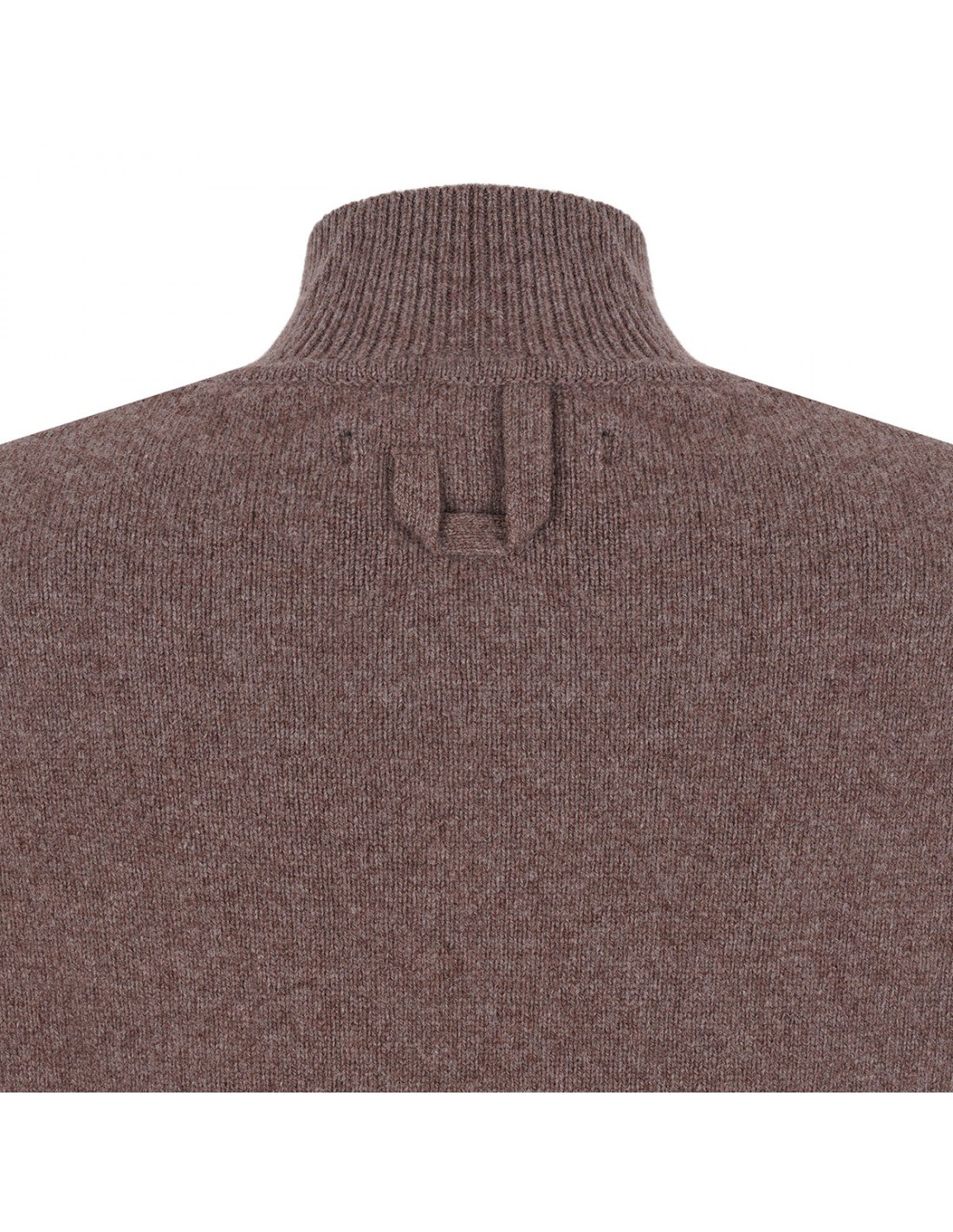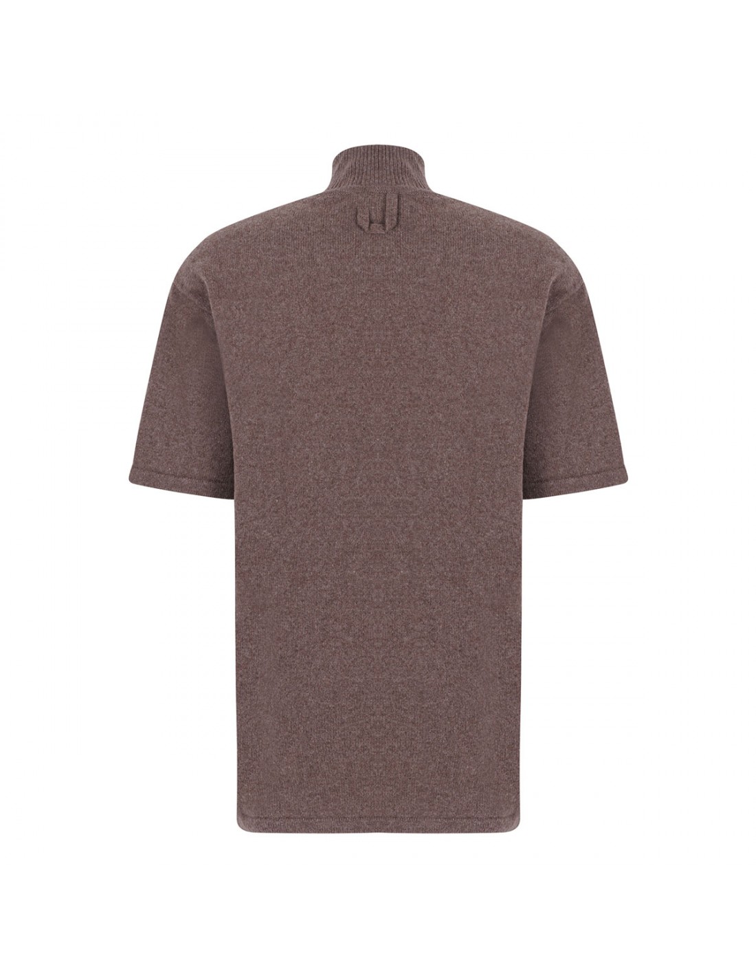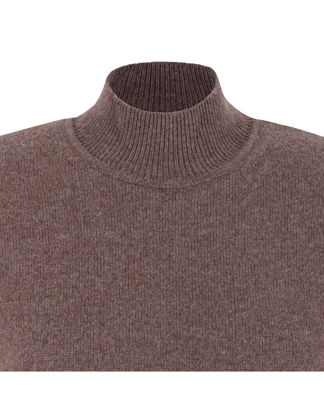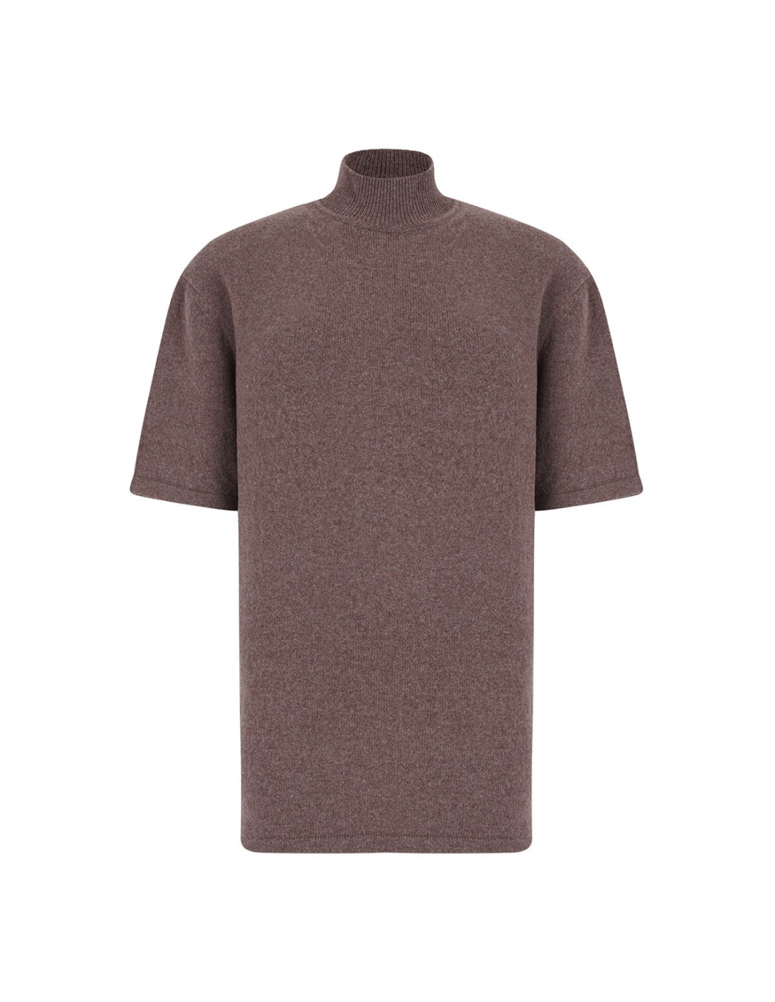 Brown soft cashmere knit The Castagna top from Jacquemus featuring fitted silhouette, ribbed mock-neck, rounded shoulder pads, elbow-length sleeves, J loop on back.