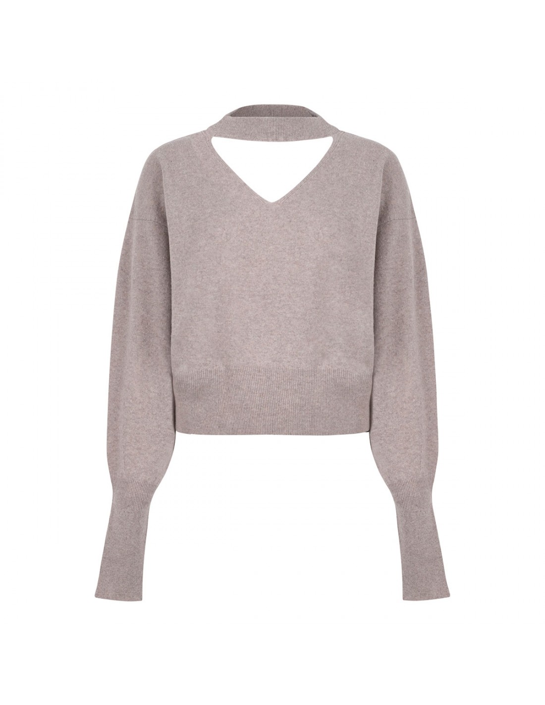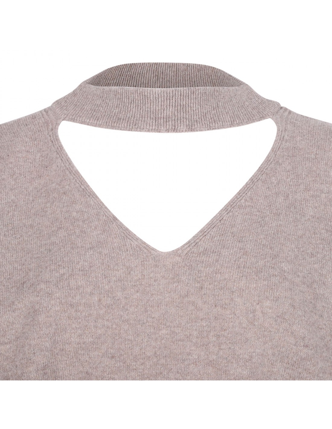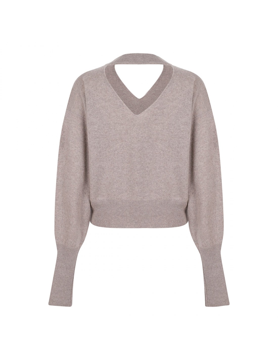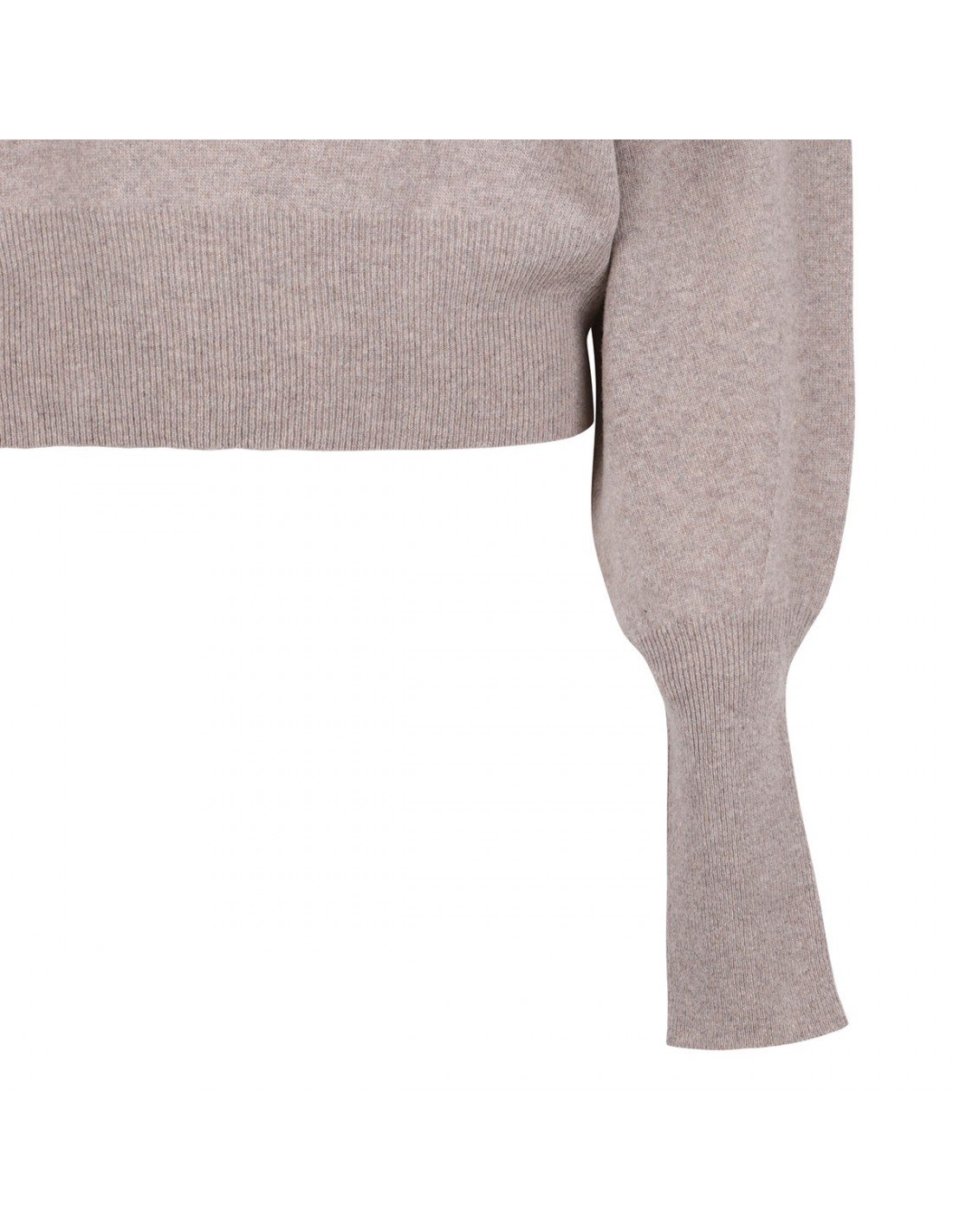 Beige wool sweater from Federica Tosi featuring V-cut detail, long sleeves, crew collar, elongated cuffs, ribbed-knit edges.