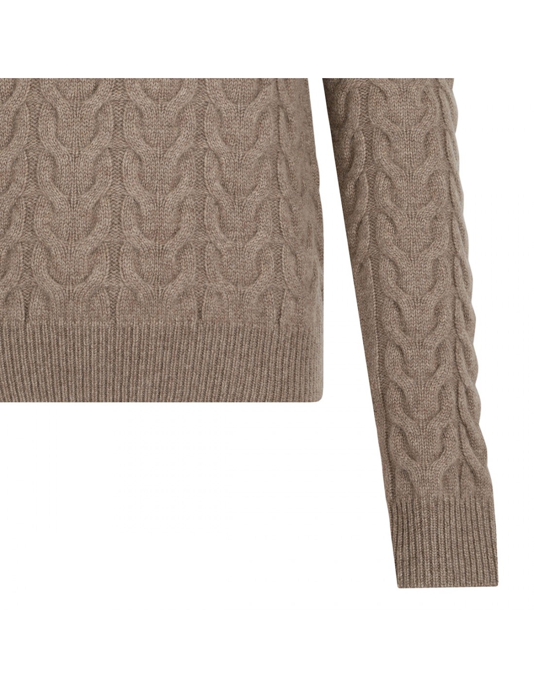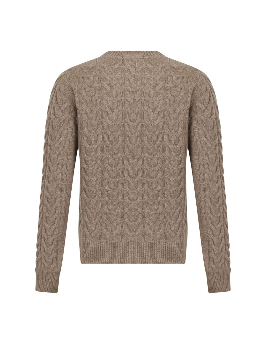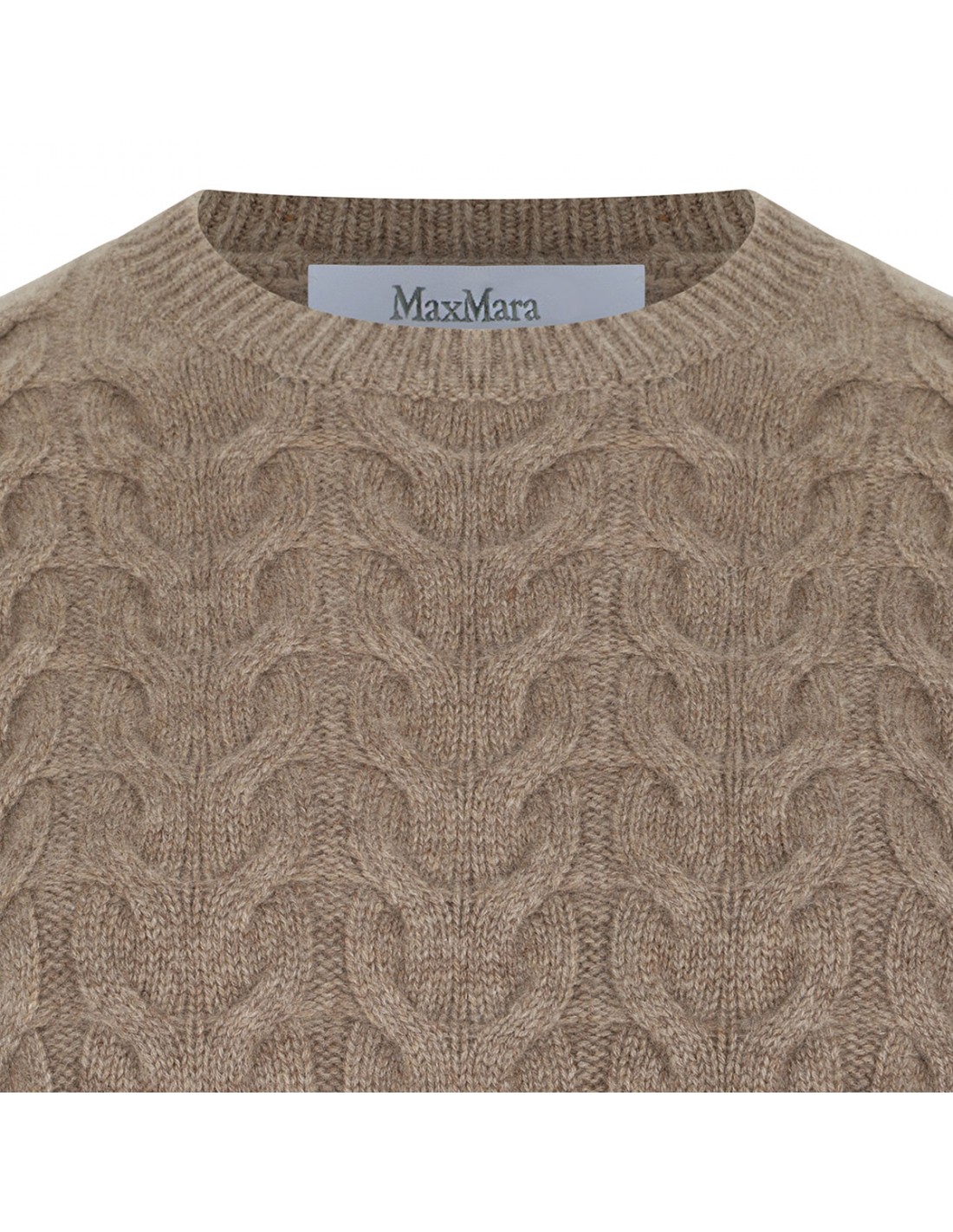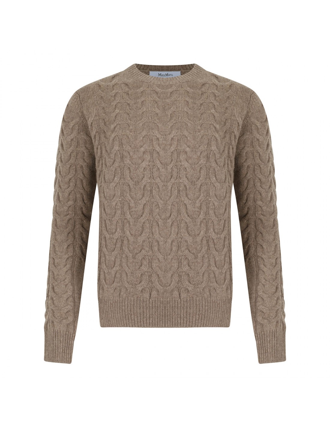 Camel hue cable knit cashmere Aramis sweater from Max Mara featuring crew neck, long sleeves, semi-fitted silhouette, straight hem and ribbed-knit edges.