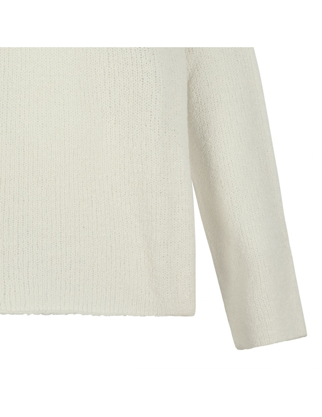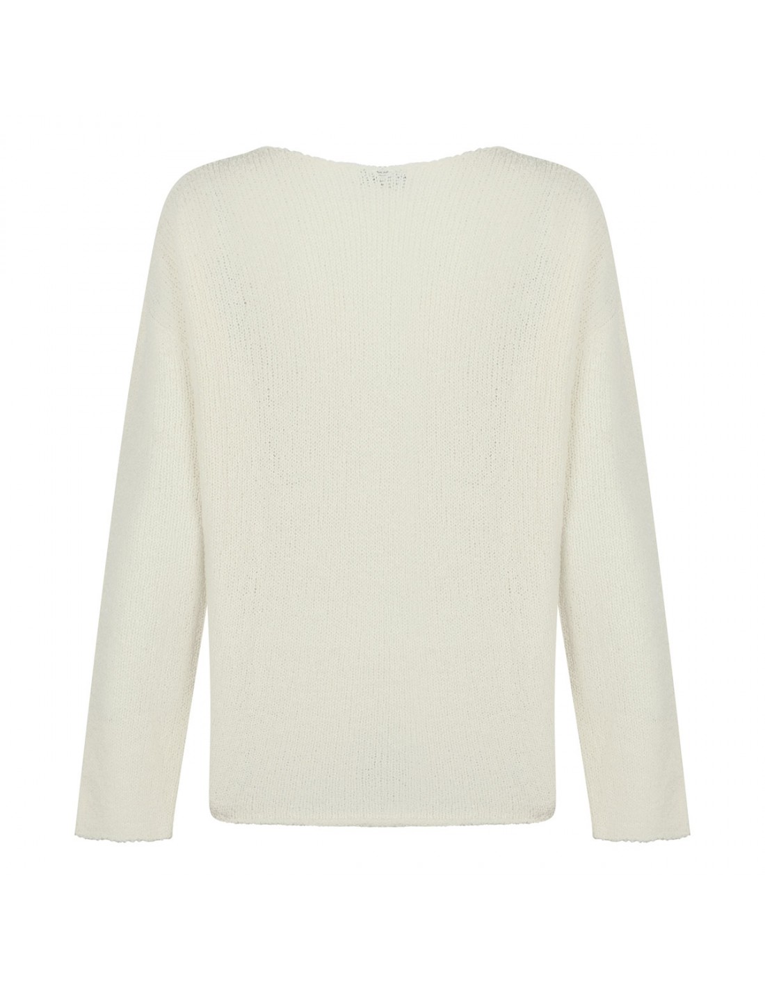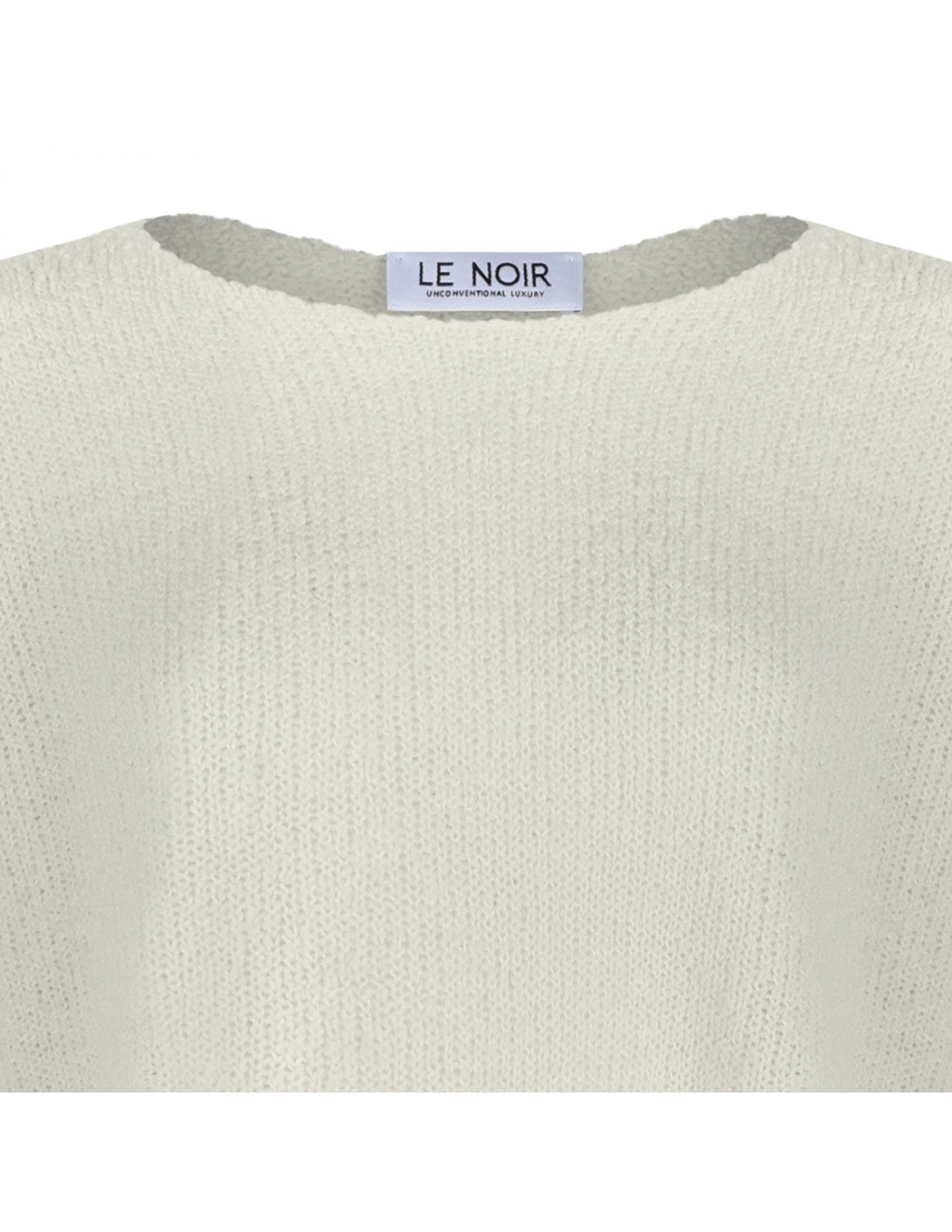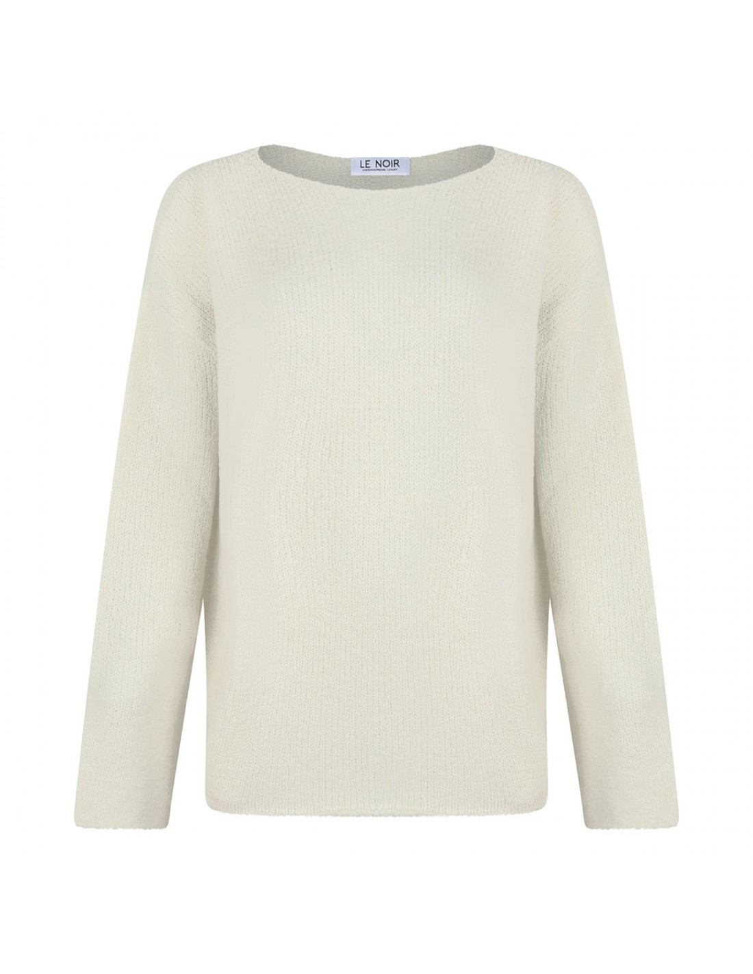 White virgin wool and silk blend sweater from Le Noir featuring boat neckline, long sleeves, dropped shoulders, loose fit.