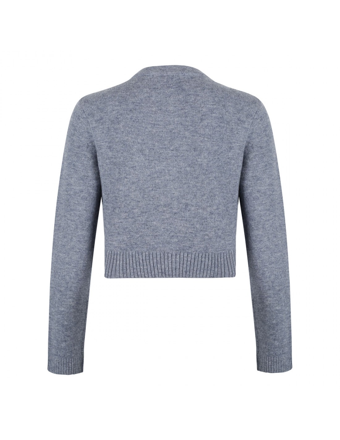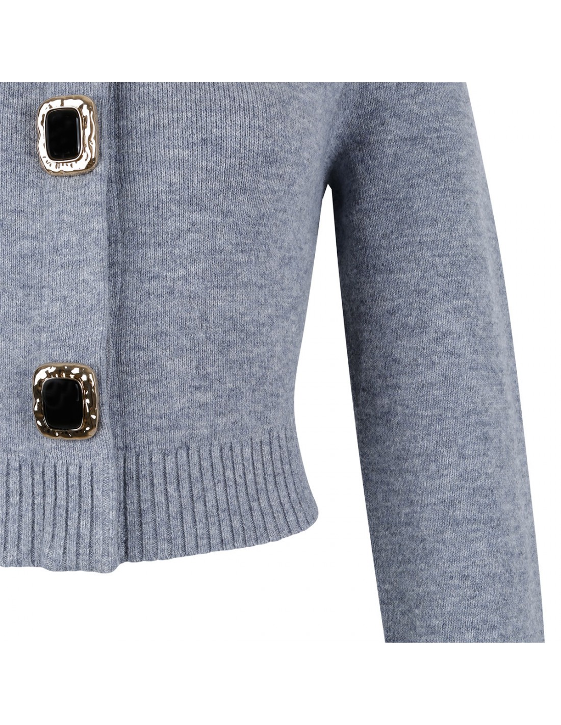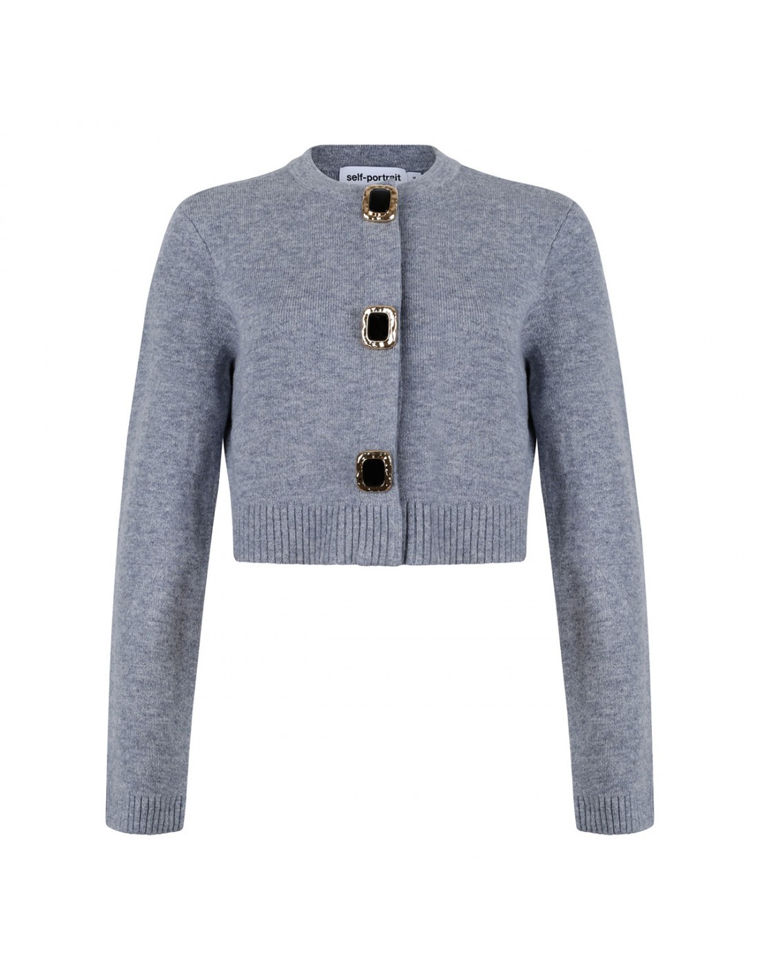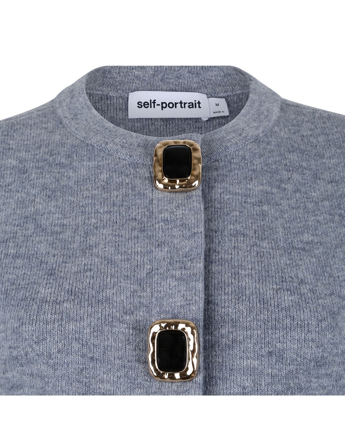 Gray wool cardigan from Self-Portrait featuring vintage-inspired mottled gold and black buttons, fitted silhouette, concealed button fastening on front, long sleeves, crew collar, ribbed edges.