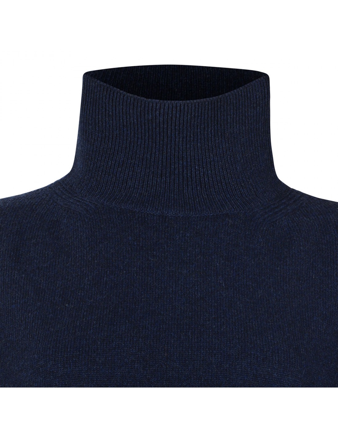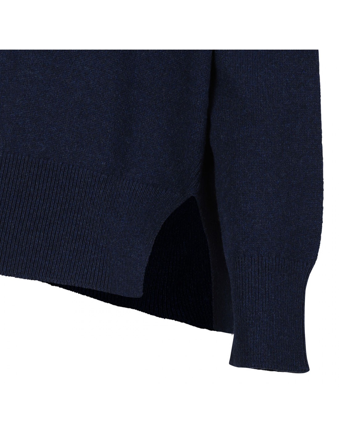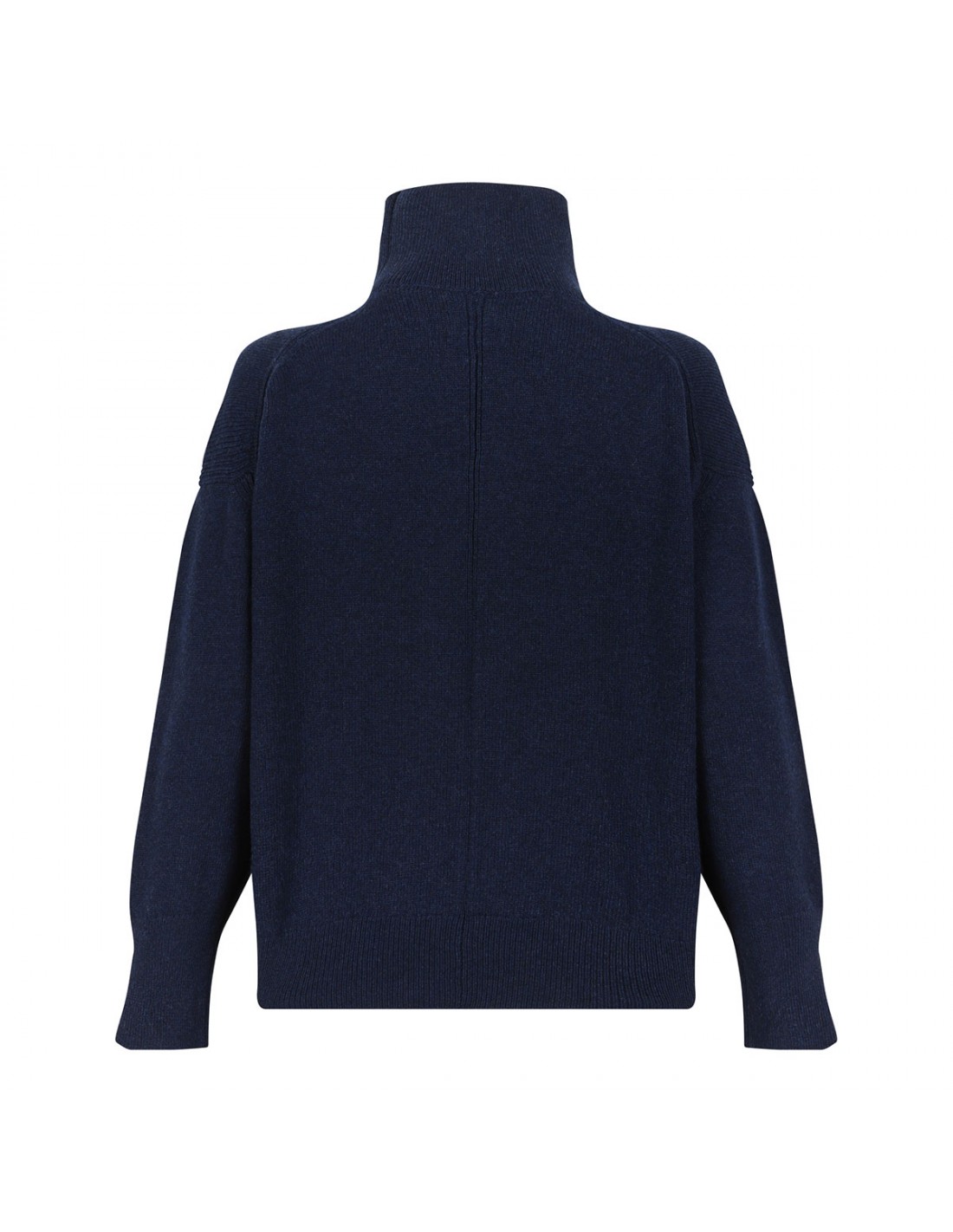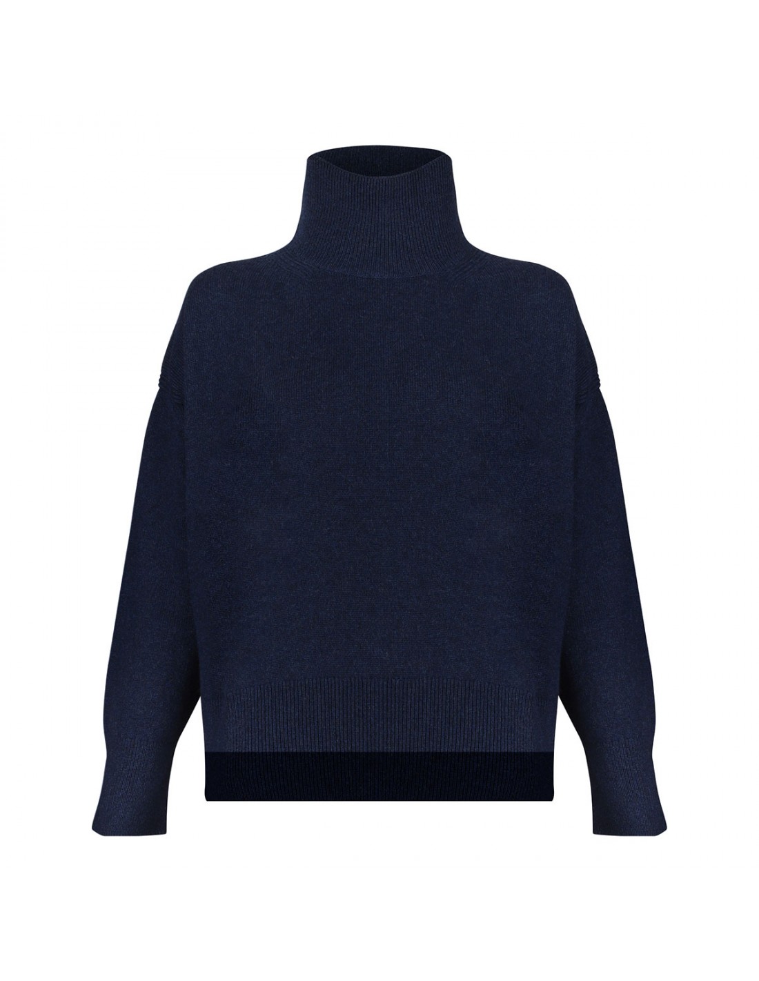Navy blue cashmere sweater from Barrie featuring oversized silhouette, turtleneck, draped back, side slits, long sleeves, dropped shoulders.