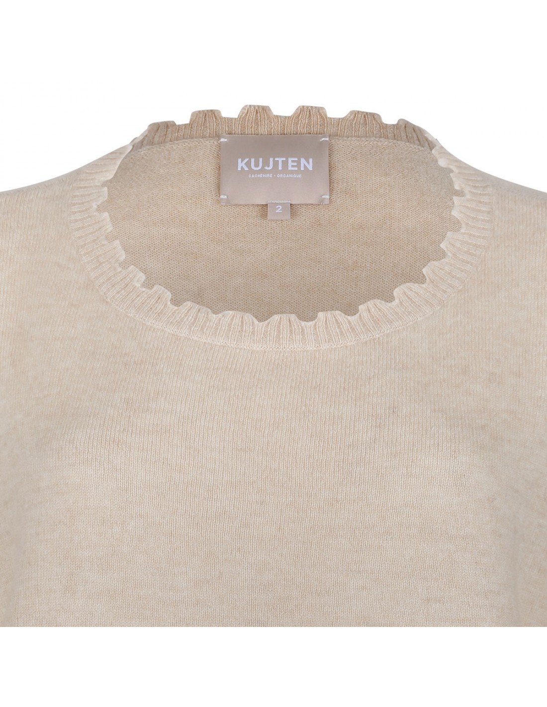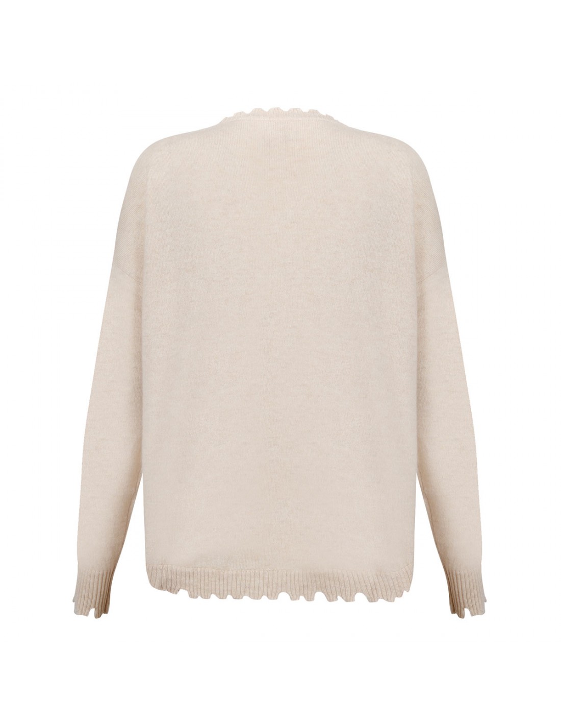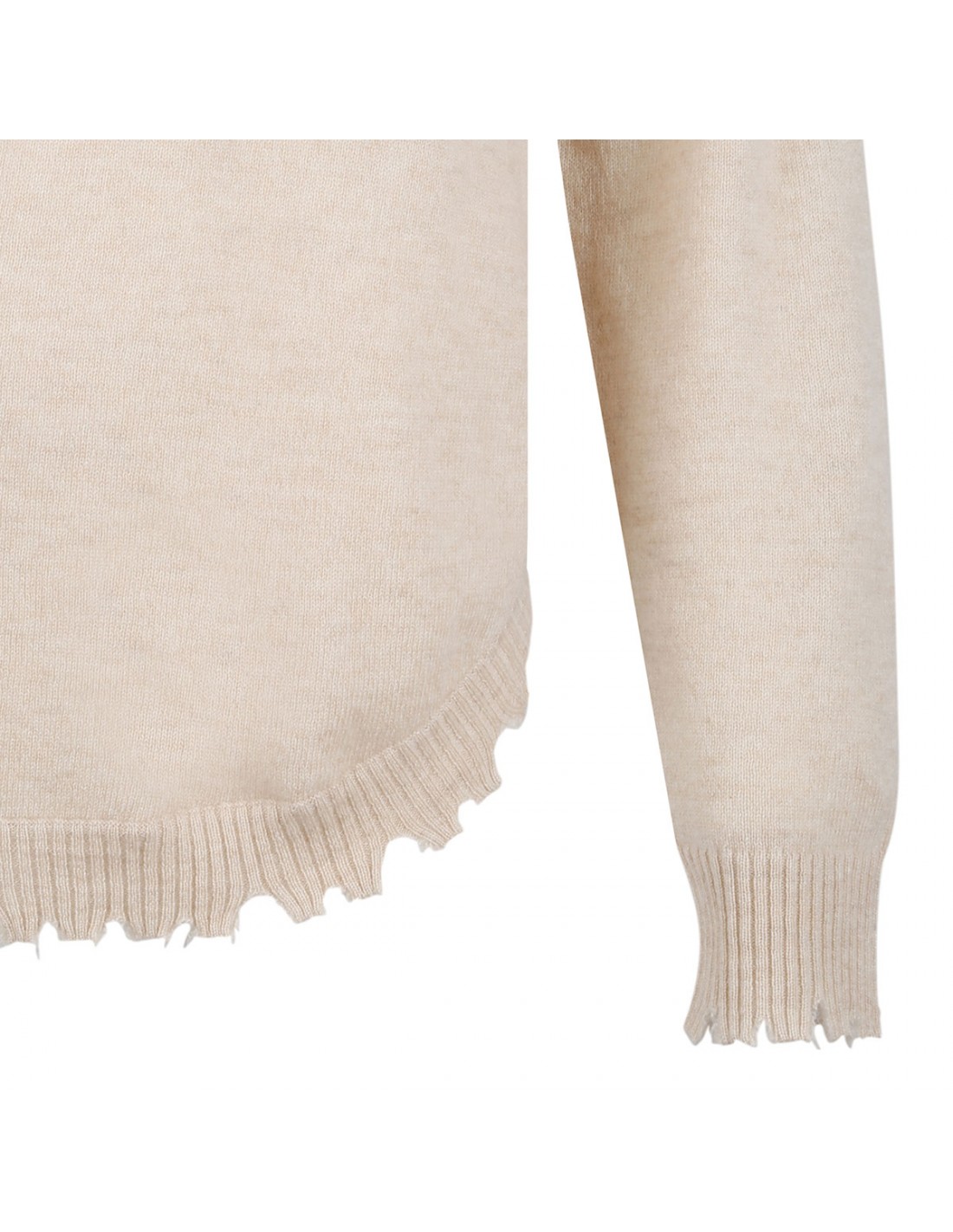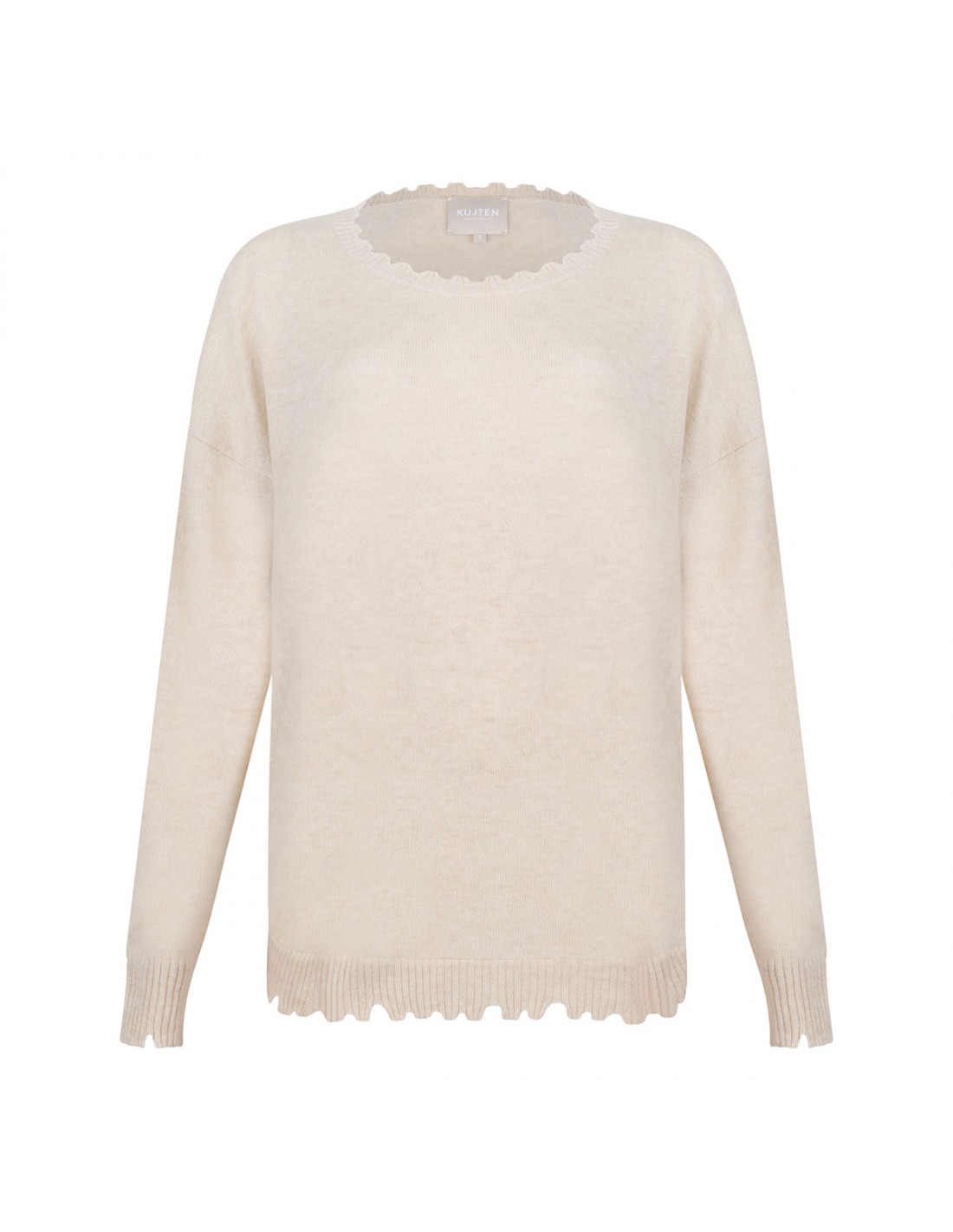 Natural white hue cashmere Mela sweater from Kujten featuring distressed finish, crew neck, long sleeves, dropped shoulders, curved hem.