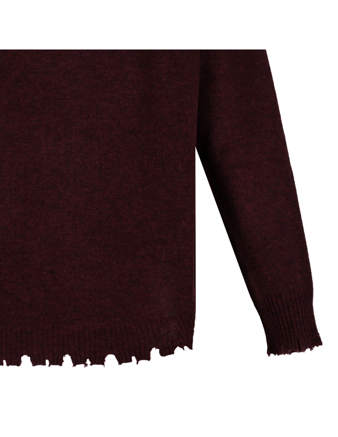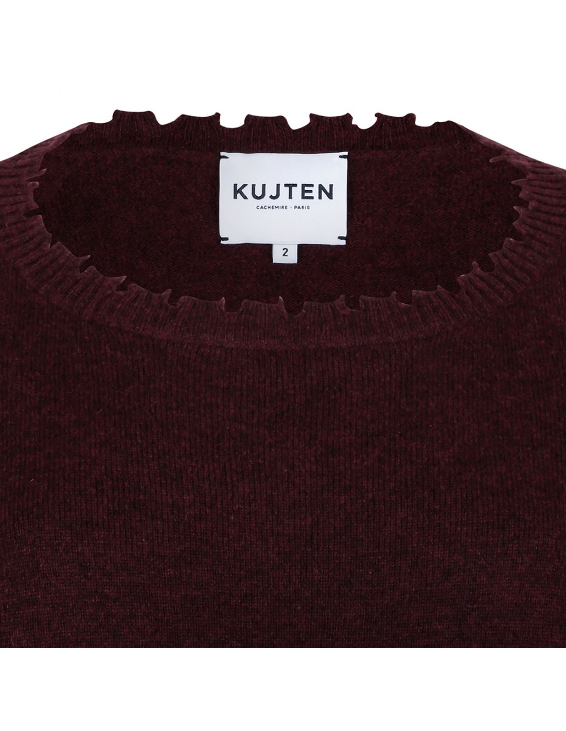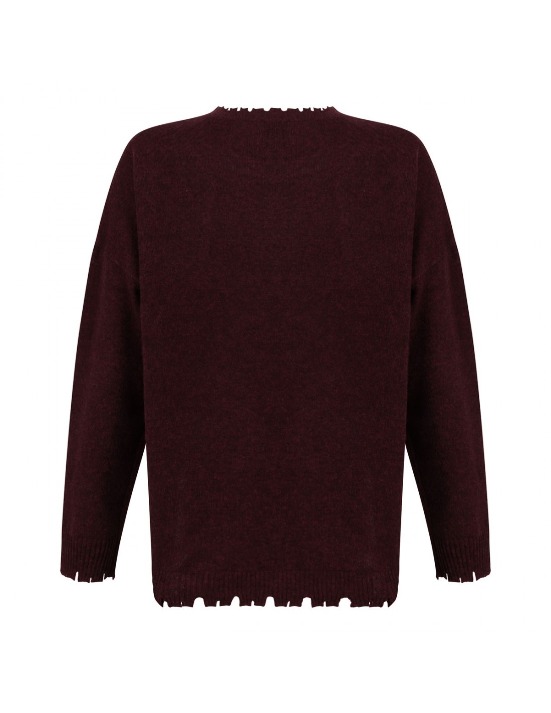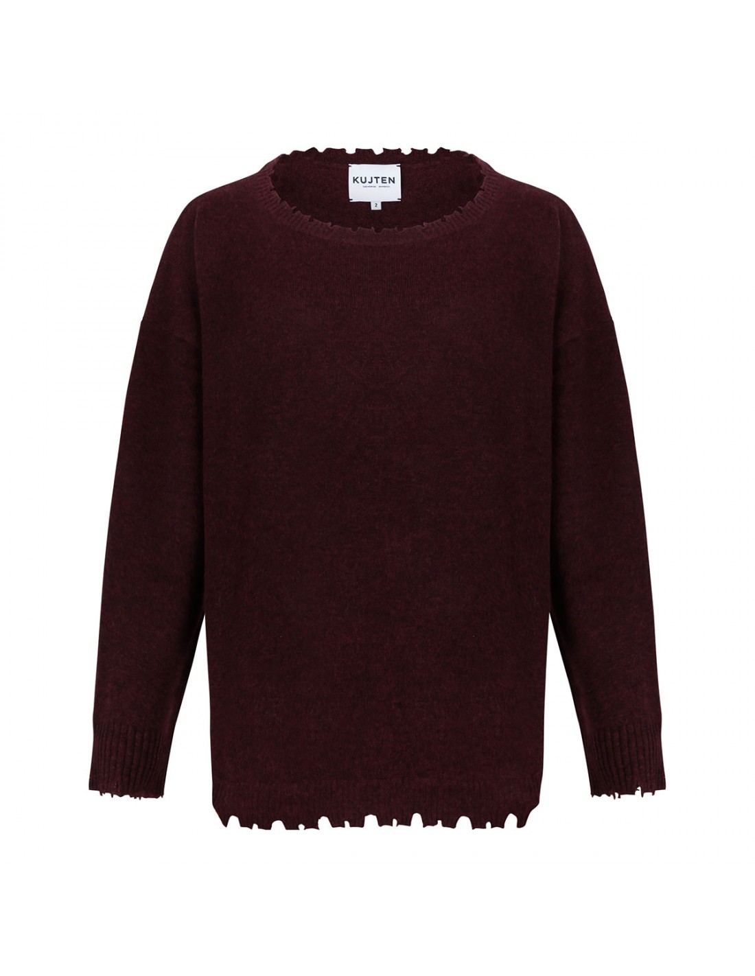 Bordeaux cashmere Mela sweater from Kujten featuring distressed finish, crew neck, long sleeves, dropped shoulders, curved hem.