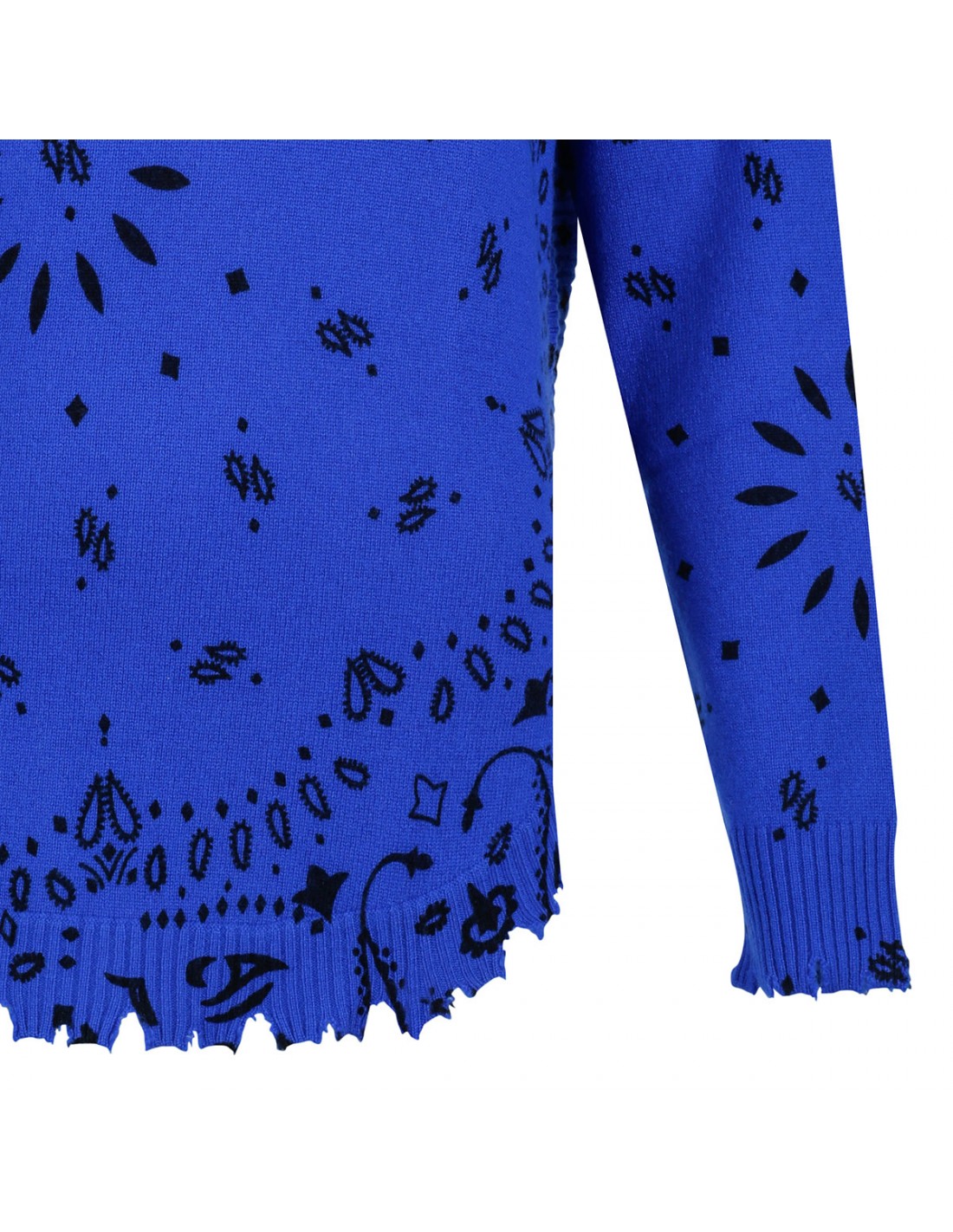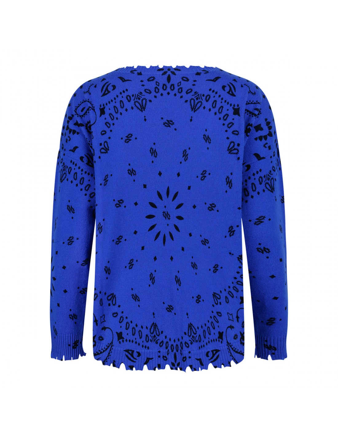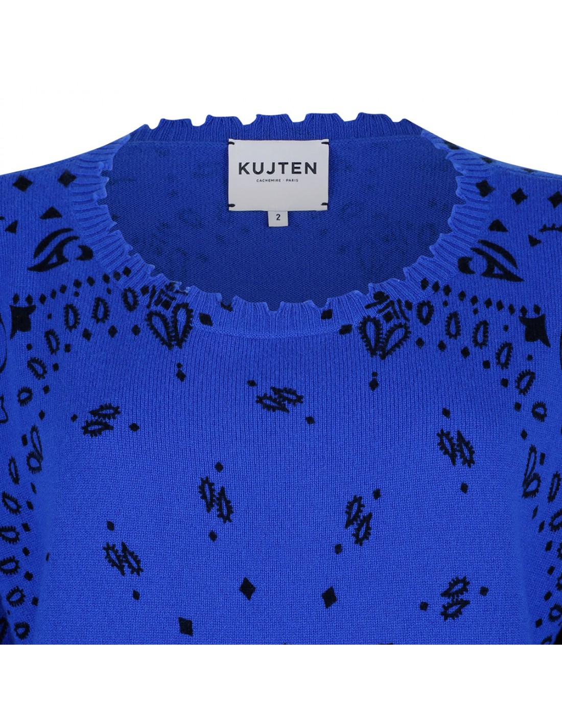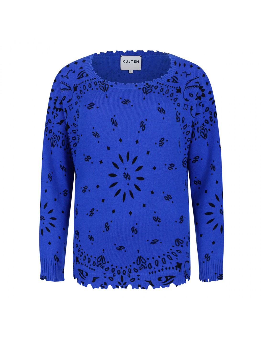 Cobalt blue cashmere Mela sweater from Kujten featuring distressed finish, bandana motif, crew neck, long sleeves, dropped shoulders, curved hem.