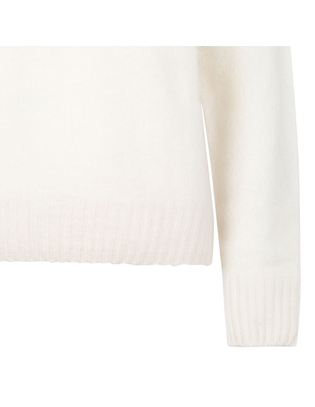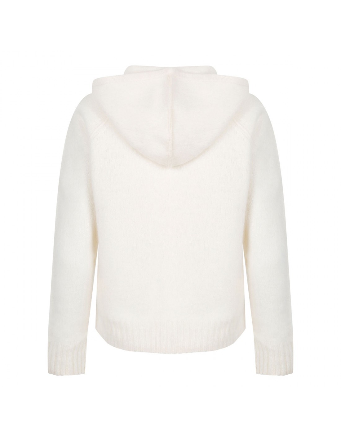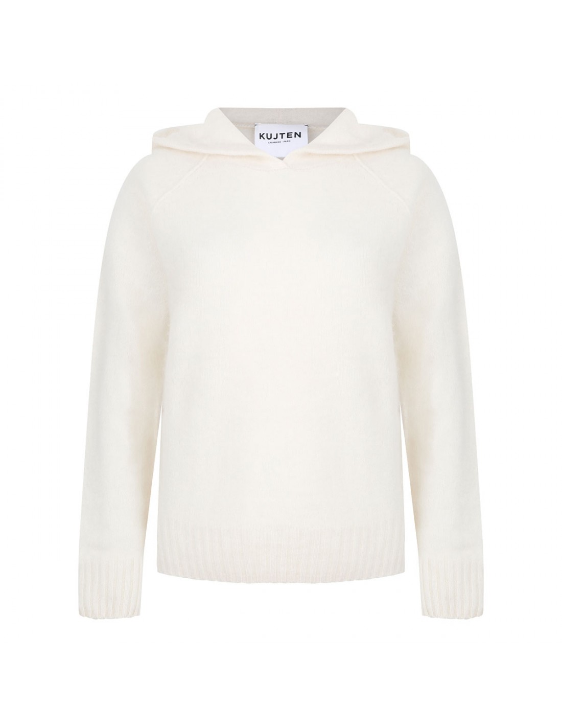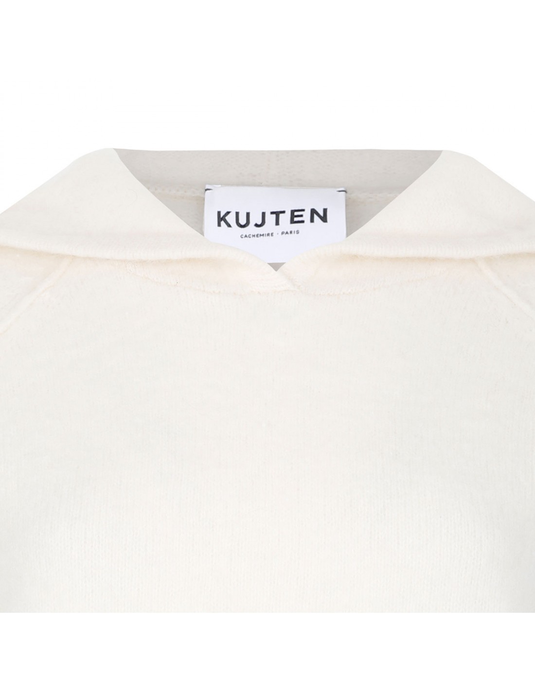 White cashmere Soso sweater from Kujten featuring fixed hood, long sleeves, cropped silhouette, ribbed-knit edges.